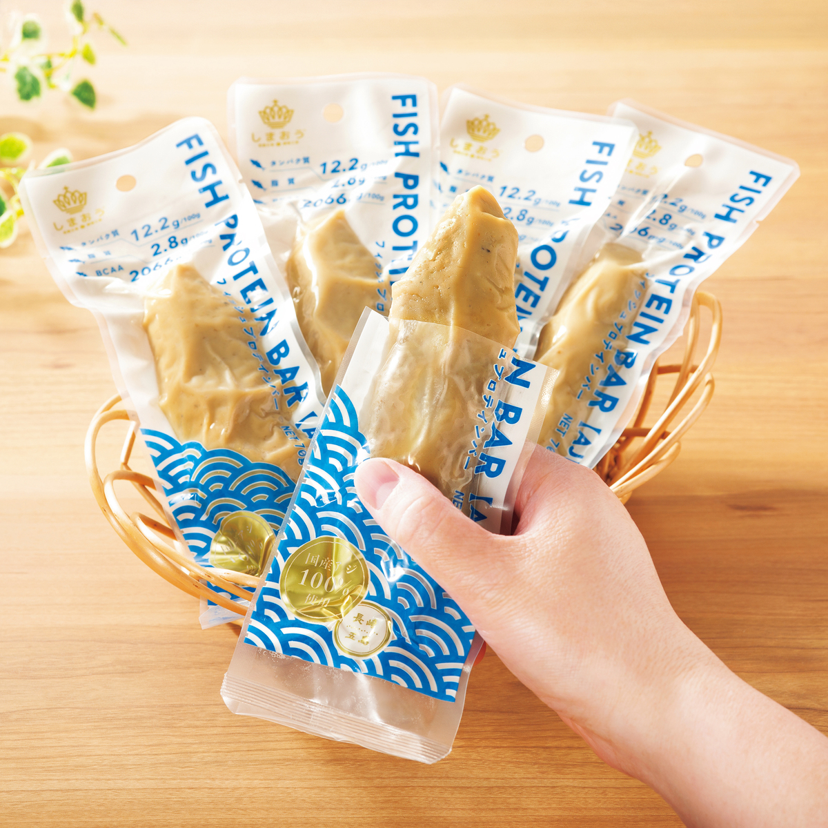 国産のアジを使用したフィッシュプロテインバー。本商品は100gあたり、たんぱく質約12.2gを含有。手軽にたんぱく質を摂取できます