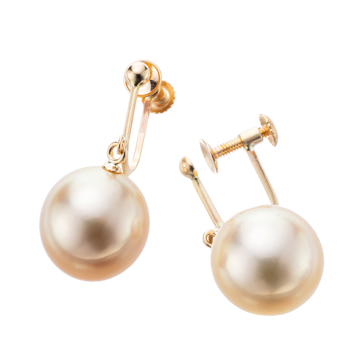 フィリピン・パラワン産のナチュラルシャンパンカラー白蝶真珠を使った、スイングタイプのイヤリングまたはピアス。真珠総合研究所でテリがトップグレードの範疇と認められた美しい珠に、10Kイエローゴールドがそっと寄り添います。肌になじむ穏やかな色味が、耳元にやわらかな上品さを添えます
