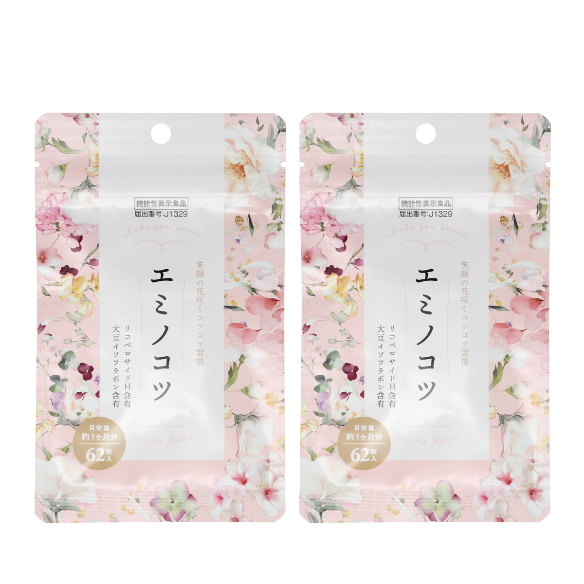 [アレルギー物質特定原材料8品目] なし [内容量] 124粒(62粒×2袋) [目安量] 1日2粒 [お召し上がり方] 1日2粒を目安に、水やぬるま湯などと一緒に噛まずにお召し上がりください <機能性表示食品> [届出番号] J1329 [機能性関与成分] ・リコぺサイドH:1mg ・大豆イソフラボン(アグリコン換算):30mg [機能性表示] 本品には、大豆イソフラボンが含まれます。大豆イソフラボンには骨の成分を維持するのに役立つ機能があることが報告されています。本品には、リコペロサイドHが含まれます。リコペロサイドHには、肌の弾力を維持し、肌の健康に役立つ機能があることが報告されています。 [栄養成分表示]2粒(540mg)当たり エネルギー:2.2kcal、たんぱく質:0.0032g、脂質:0.026g、炭水化物:0.49g、食塩相当量:0.0018g [保存方法] 直射日光、高温多湿を避けて保存してください [注意事項] ※医薬品ではありません ※本品は疾病の診断、治療、予防を目的としたものではありません ※本品は、疾病に罹患している者、未成年者、妊産婦(妊娠を計画している者を含む)及び授乳婦を対象に開発された商品ではありません ※疾病に罹患している場合は医師に、医薬品を服用している場合は医師、薬剤師に摂取について相談してください ※体調に異変を感じた際は、速やかに摂取を中止し、医師に相談してください ※本品は、多量摂取により疾病が治癒したり、より健康が増進するものではありません ※妊娠・授乳中の方・乳幼児、小児は召し上がらないでください ※イソフラボンを含む他の特定保健用食品等との併用は避け、過剰摂取にご注意ください ※一日摂取目安量をお守りください ※本品は、特定保健用食品と異なり機能性及び安全性について国による評価を受けたものではありません。届け出られた科学的根拠の情報は消費者庁のウェブサイトで確認できます ※食生活は、主食、主菜、副菜を基本に、食事のバランスを ※原材料名をご確認の上、食物アレルギーのある方は召し上がらないでください ※天産物由来の原料を使用していますので、色調等が異なる場合がございますが、品質には問題ありません [原料原産地] トマト種子エキス末(でん粉分解物、トマト種子抽出物)(国内製造) [原産国] 日本 [原材料] トマト種子エキス末(でん粉分解物、トマト種子抽出物)(国内製造)、還元麦芽糖水あめ、大豆抽出物、ハスの花抽出物、黒ウコン抽出物、アセロラ粉末、セラミド含有りんご繊維、黒ぶどう発酵抽出物、酵母エキス末、白キクラゲ抽出物、ローズヒップ抽出物/セルロース、ステアリン酸Ca、微粒酸化ケイ素、CMC、HPC、V.C