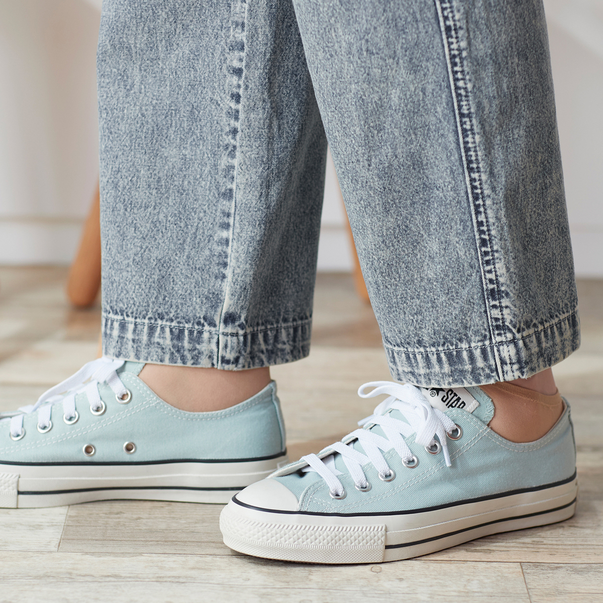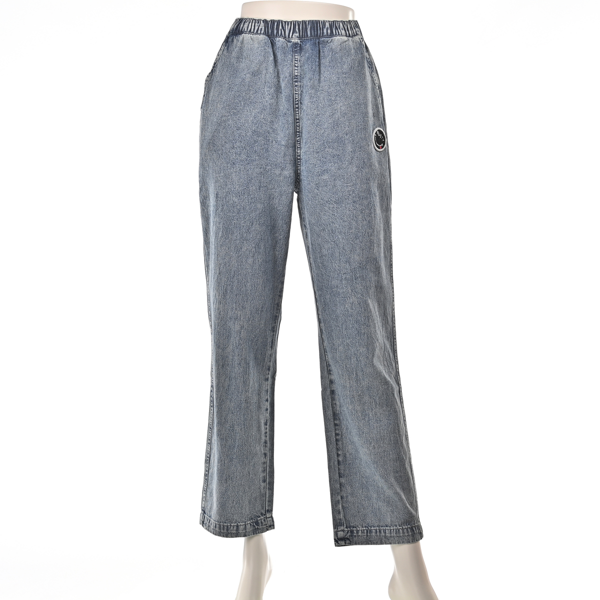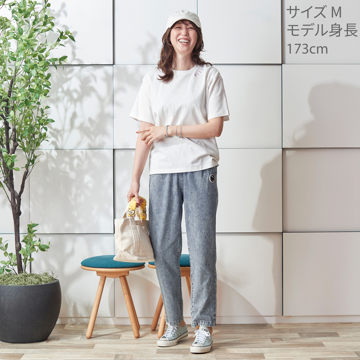薄くて軽い生地感のデニムパンツ。ケミカルウォッシュのムラ感を活かしつつ、色合いは控えめに整え、大人が取り入れやすい印象に。ヒップまわりにゆとりを持たせたセミワイドテーパードで無理なく穿け、ウエストは総ゴム仕様で着脱も簡単です
