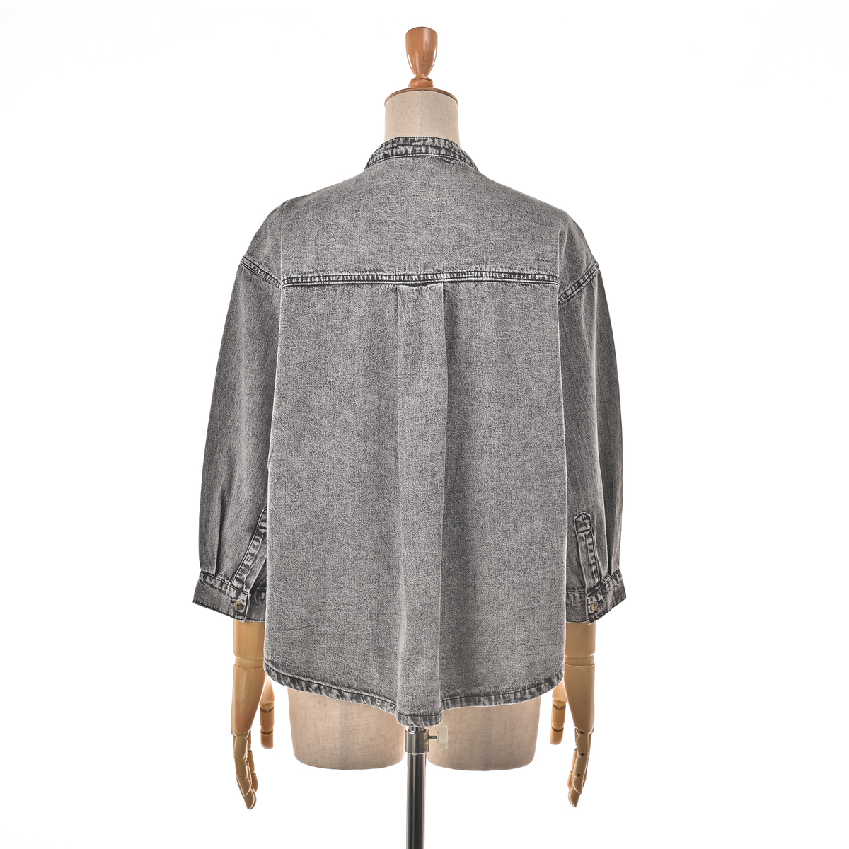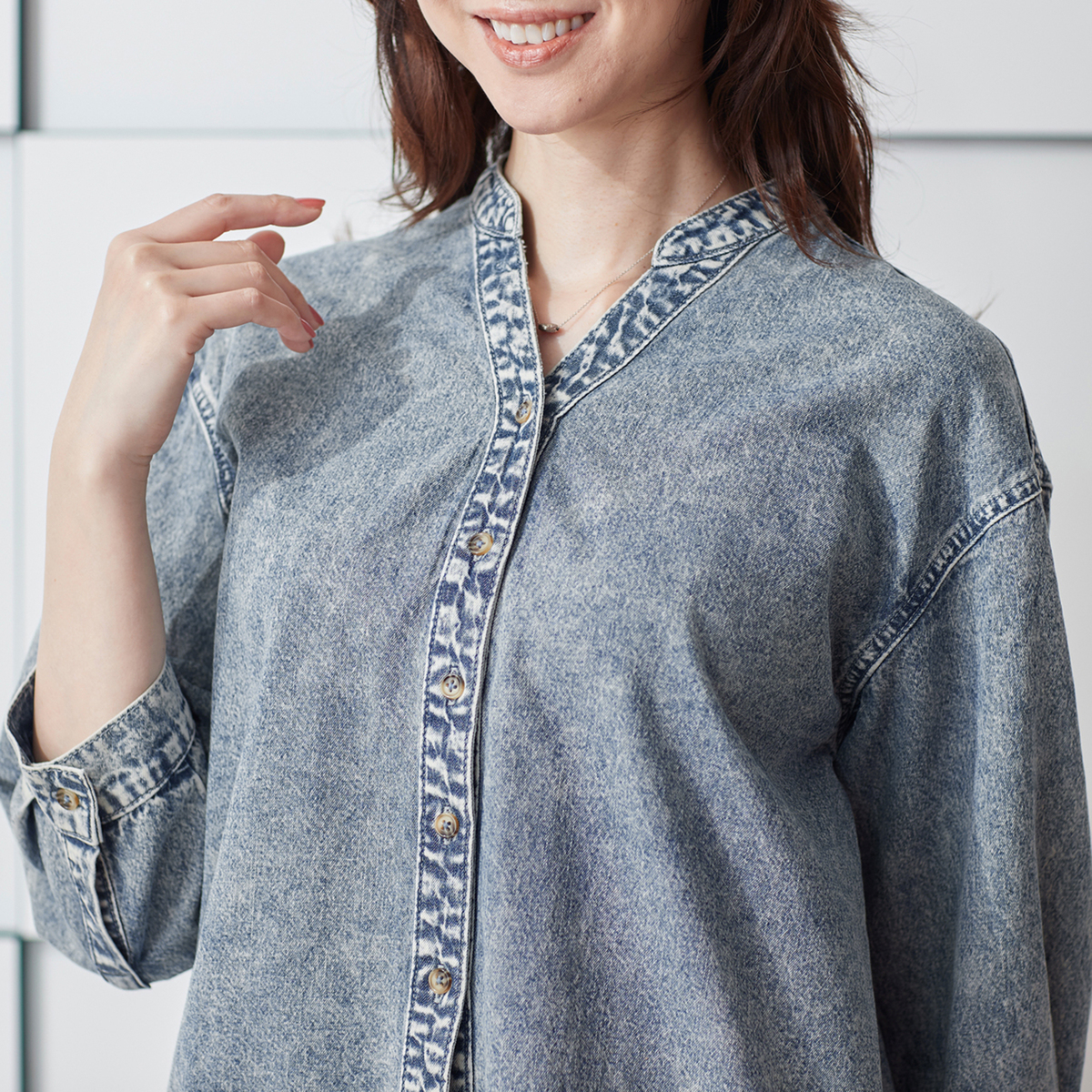 薄くて軽い生地感のデニムシャツ。ムラ感を抑えたケミカルウォッシュで、大人が取り入れやすい色合いに。七分袖で着用シーズンが長く、シャツとしても羽織としても着回せます。背中にタックを取ることで動きやすく、バックコンシャスなデザインになっています
