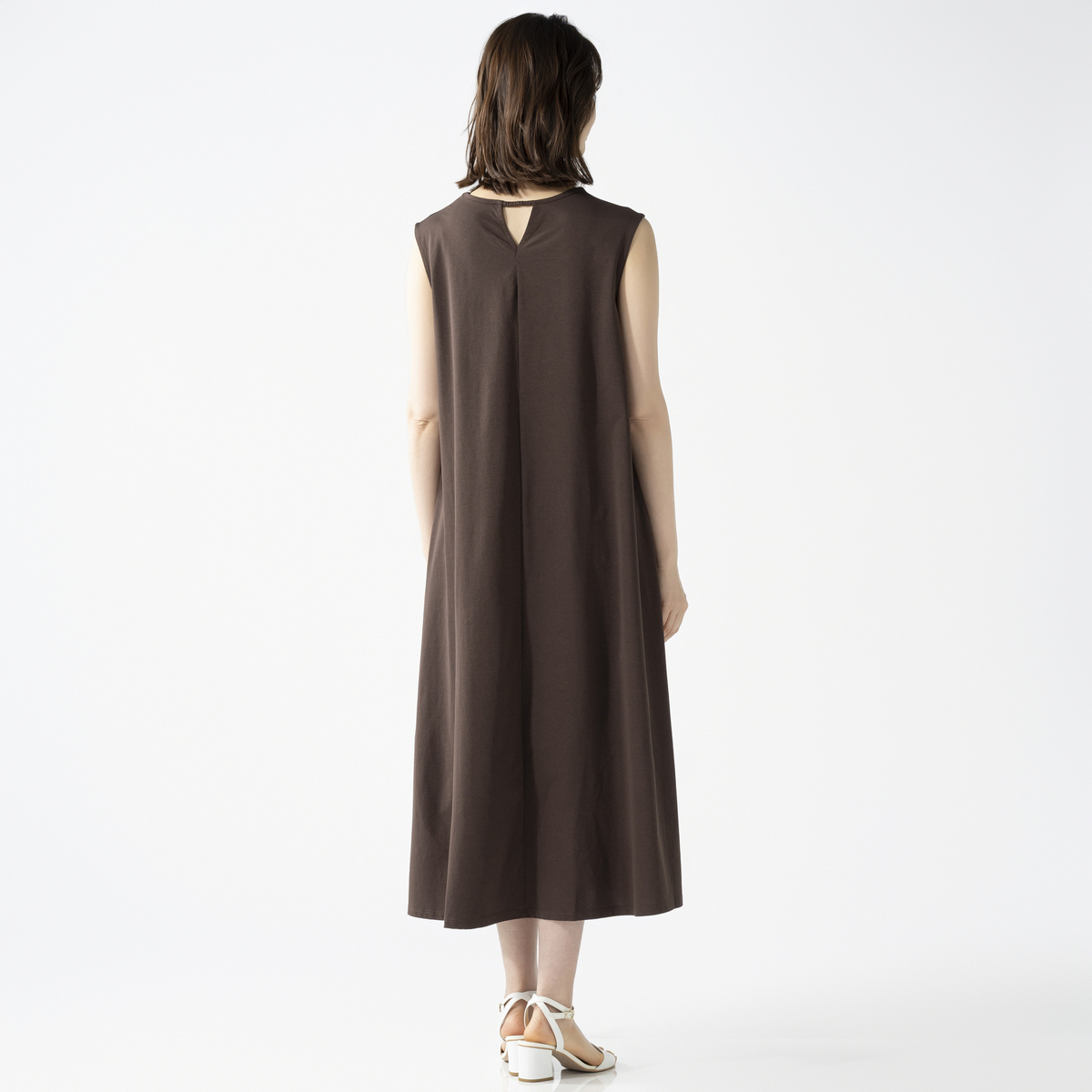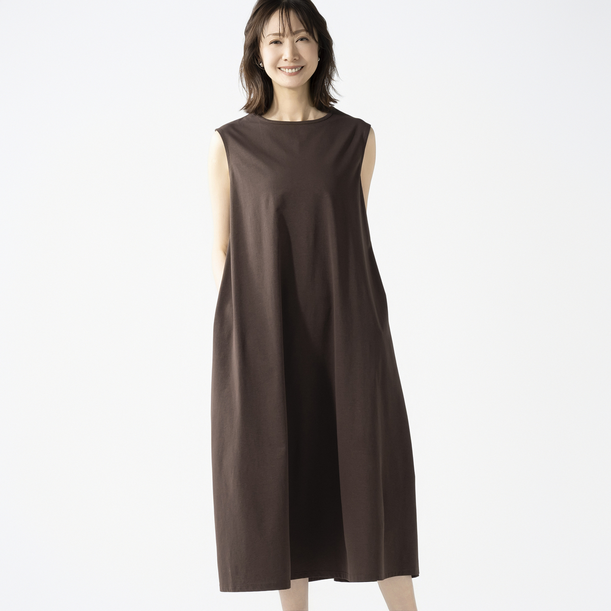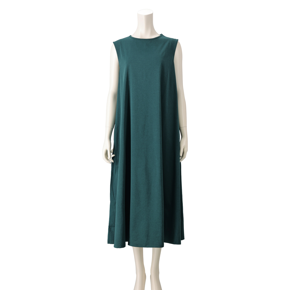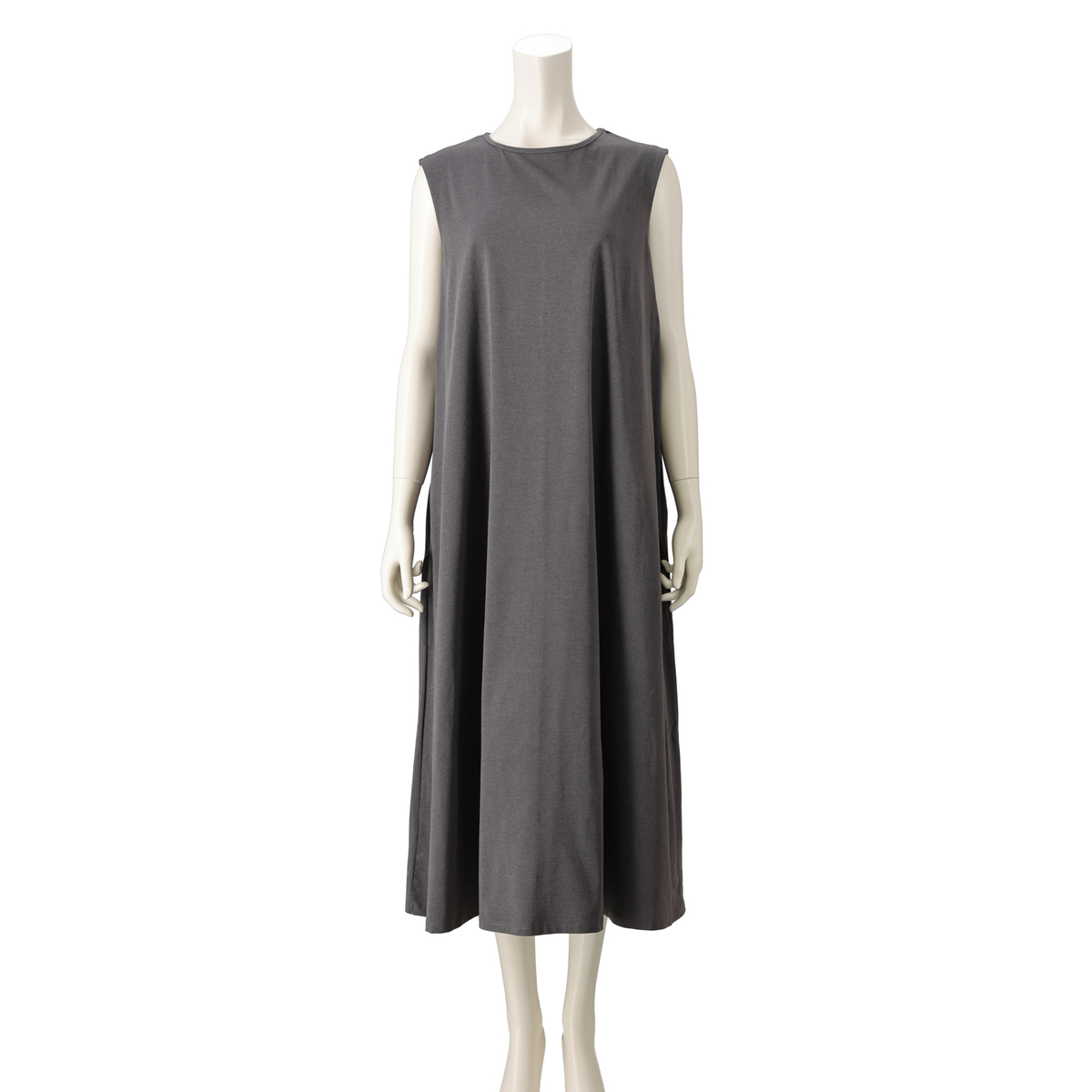 綿タッチのポリエステル100%の天竺素材を使用したノースリーブワンピースです。綿ライクの軽やかな風合いとシンプルなデザインで、デイリーコーデに活躍します