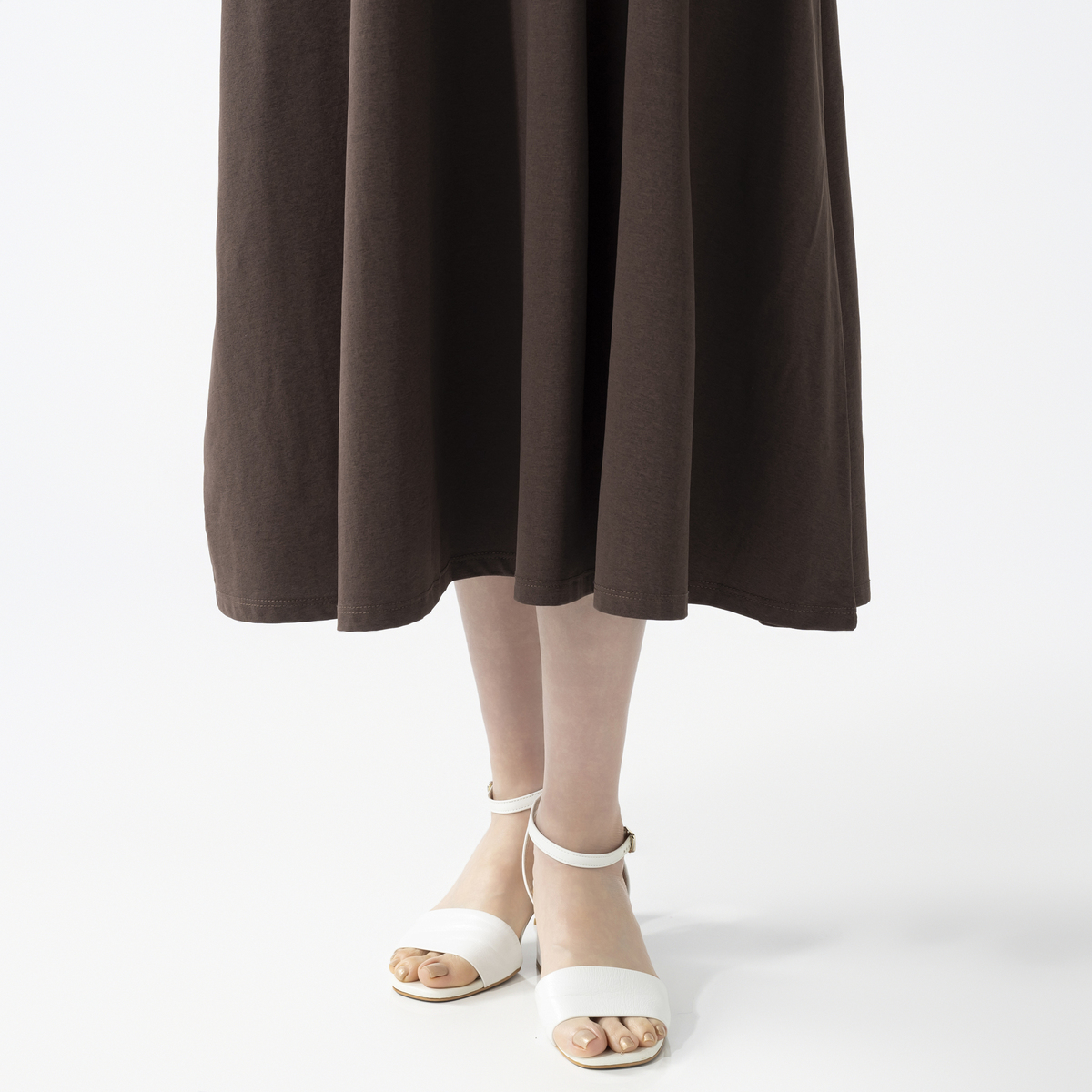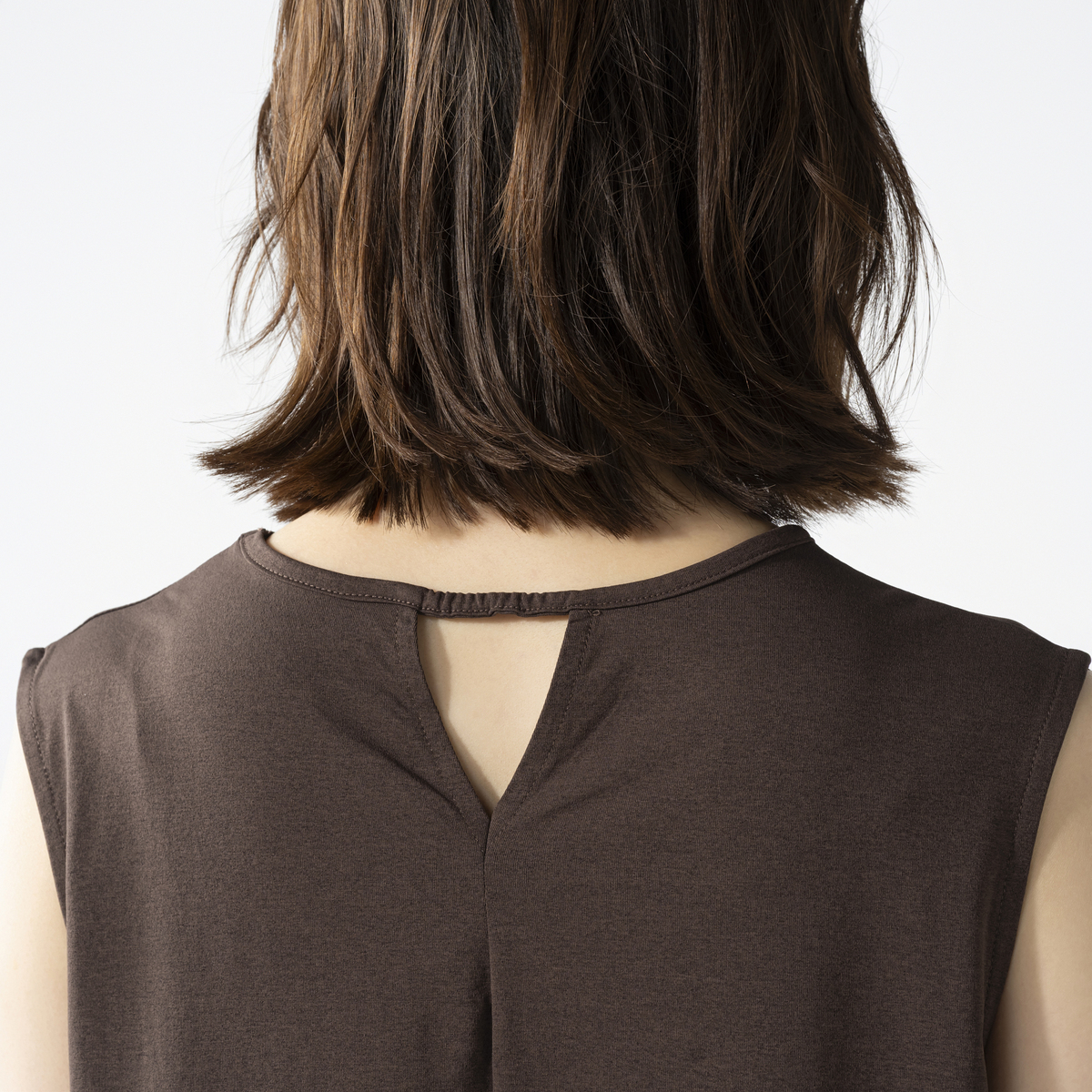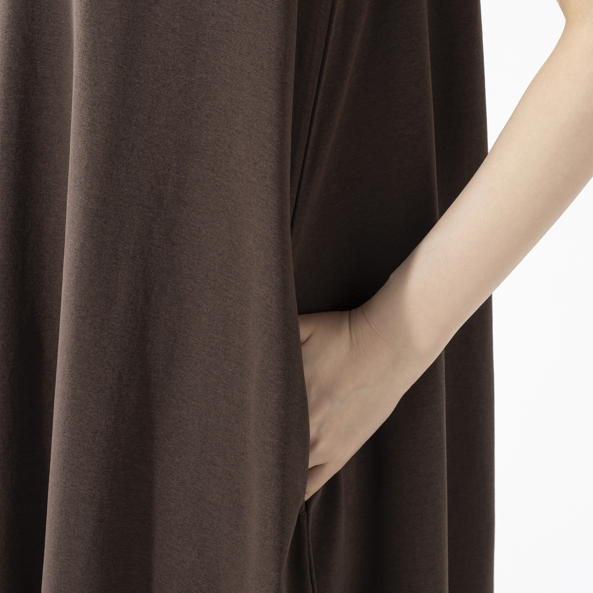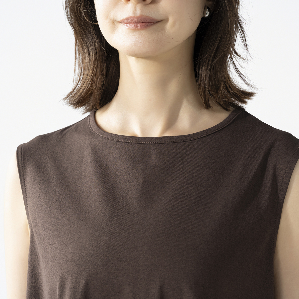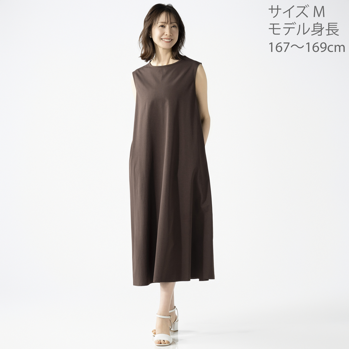 綿タッチのポリエステル100%の天竺素材を使用したノースリーブワンピースです。綿ライクの軽やかな風合いとシンプルなデザインで、デイリーコーデに活躍します