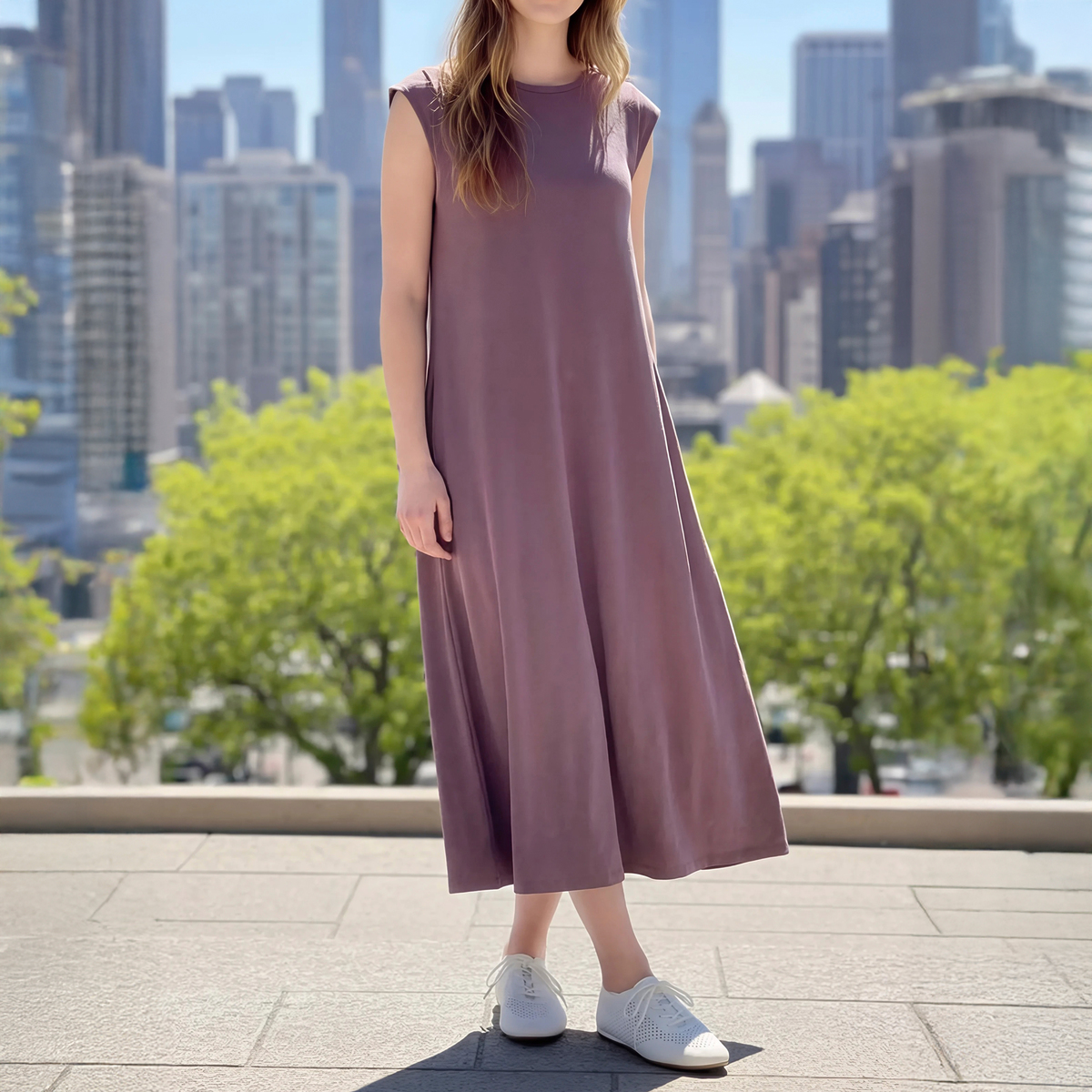 綿タッチのポリエステル100%の天竺素材を使用したノースリーブワンピースです。綿ライクの軽やかな風合いとシンプルなデザインで、デイリーコーデに活躍します