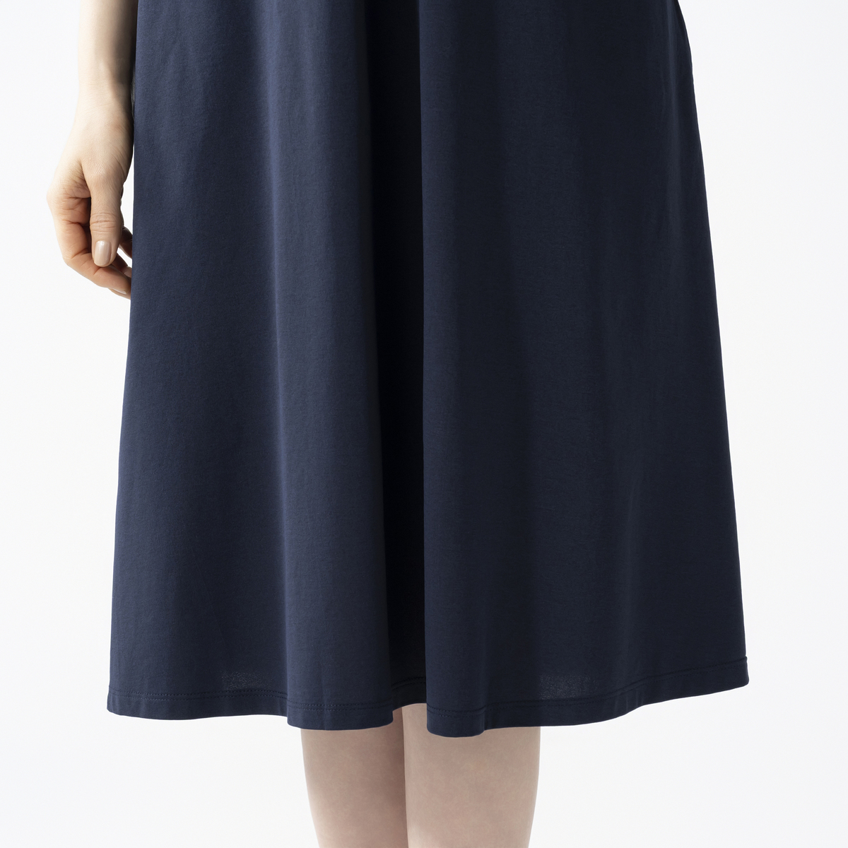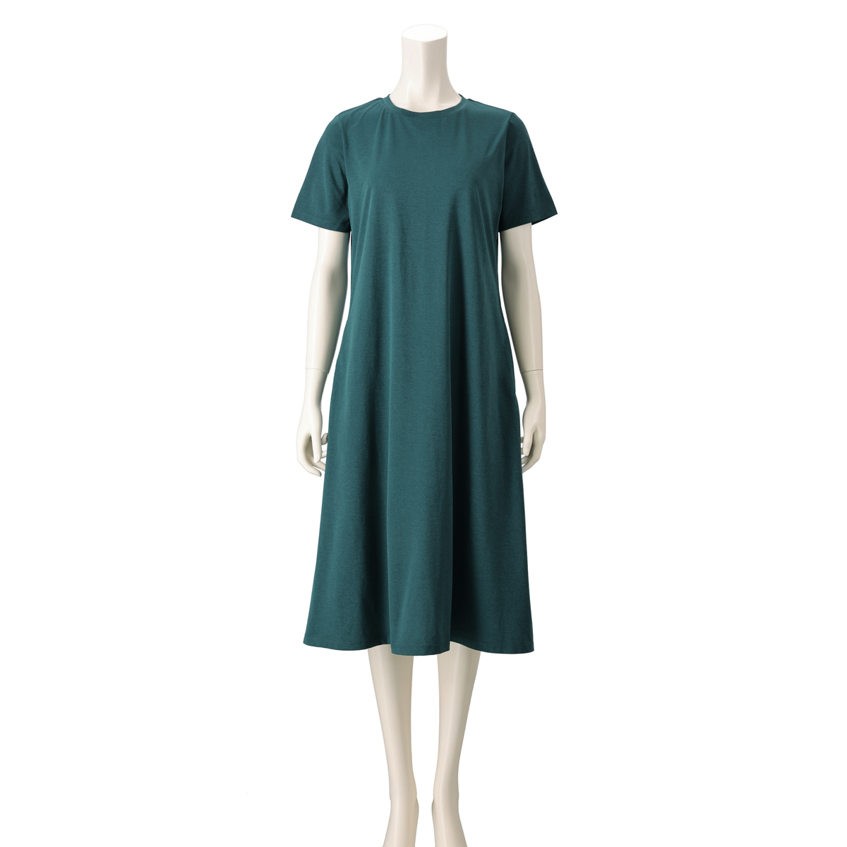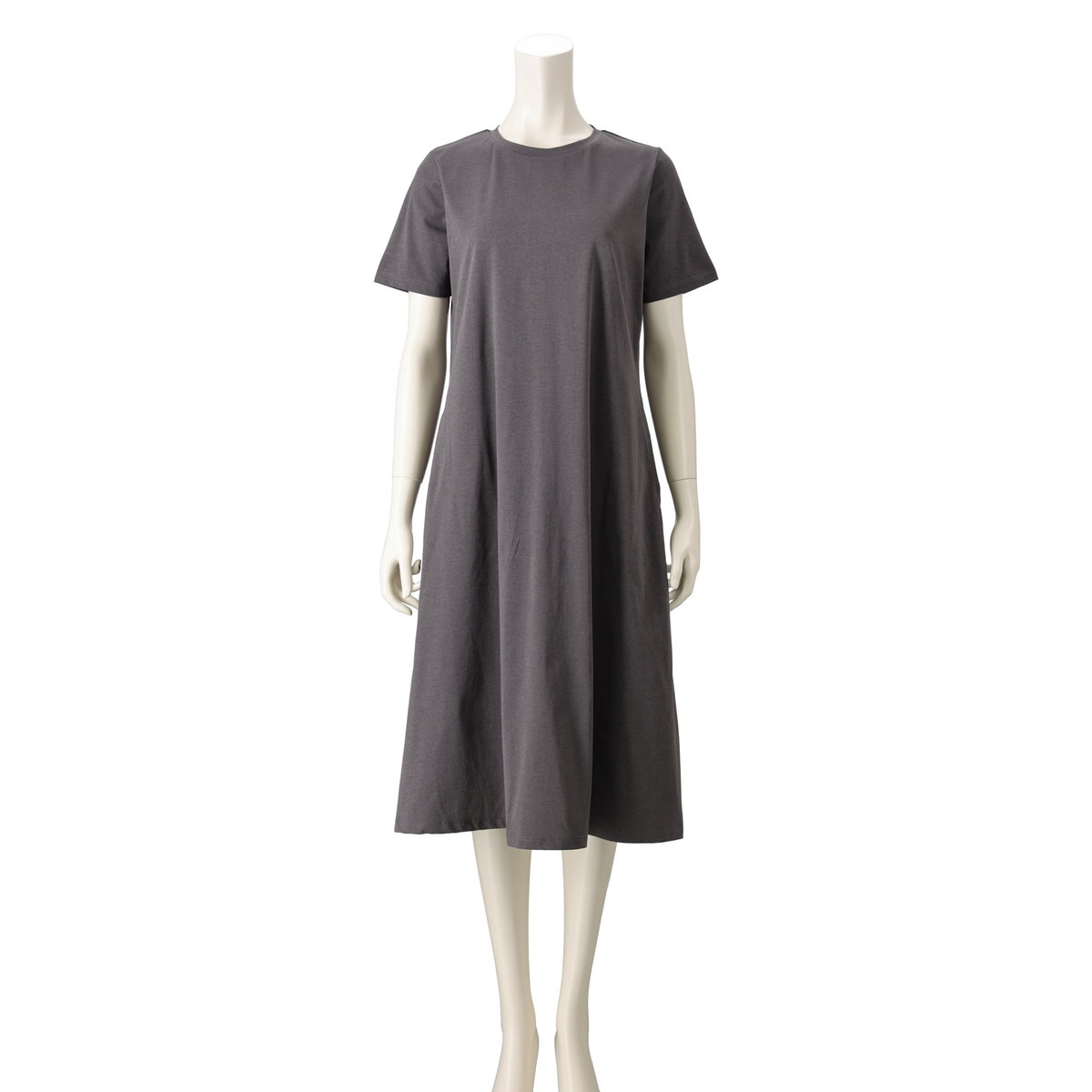 綿タッチのポリエステル100%の天竺素材を使ったロングワンピースです。縦長ラインがすっきりと見せ、程良いゆとりが体型を自然にカバー。肩や腕まわりもラクに動かせる設計です