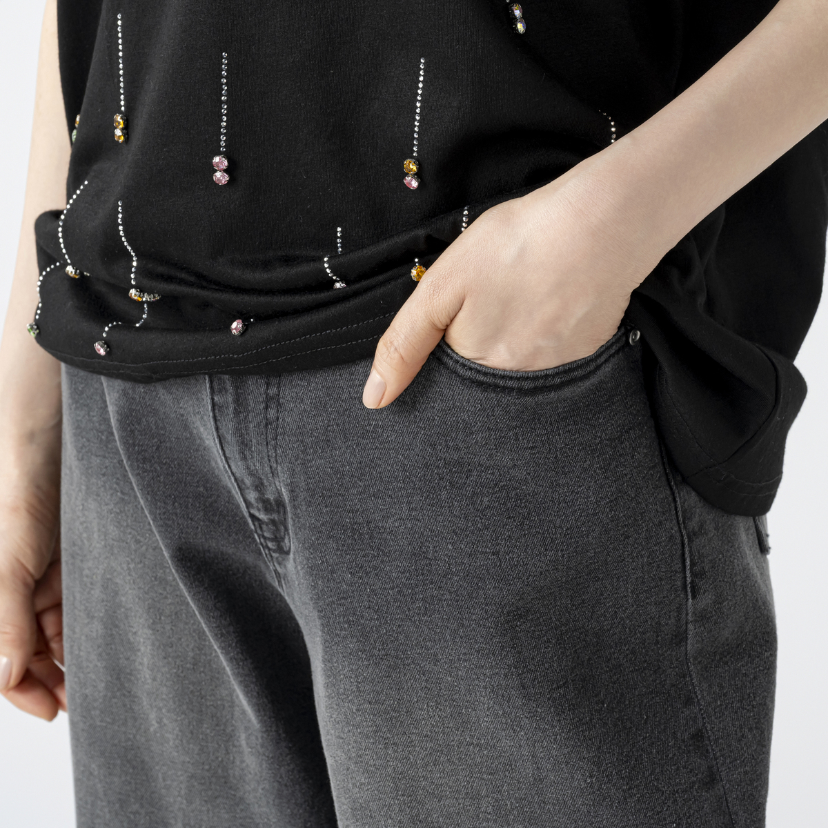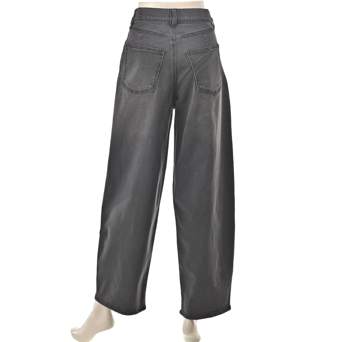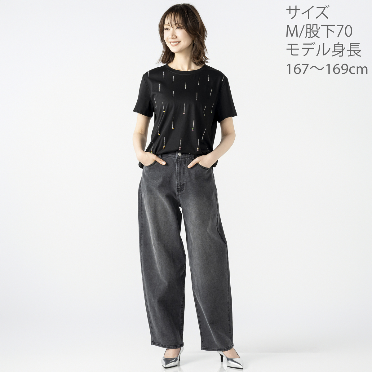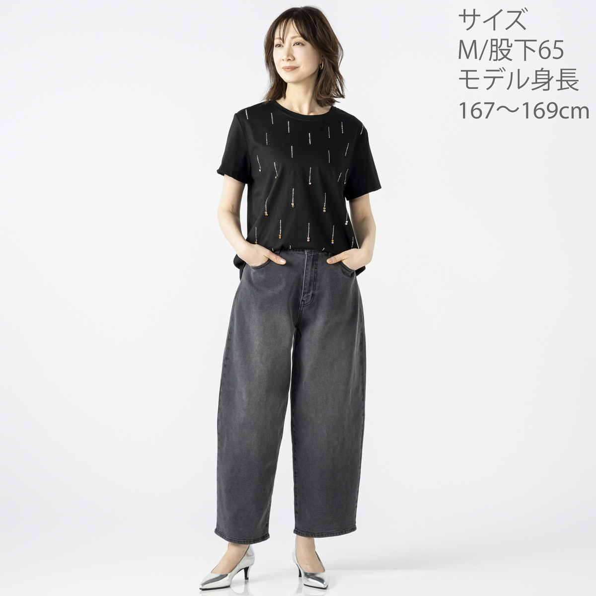 ウエストは総ゴムながらギャザーを控え、見た目はすっきり。5ポケットの本格デニム仕様で前はボタンとファスナー開き。腰まわりは程よくフィットし、脇から丸みを描きながら裾へとすぼまります。ストレッチ入りのためやや小さめの作りになっています
