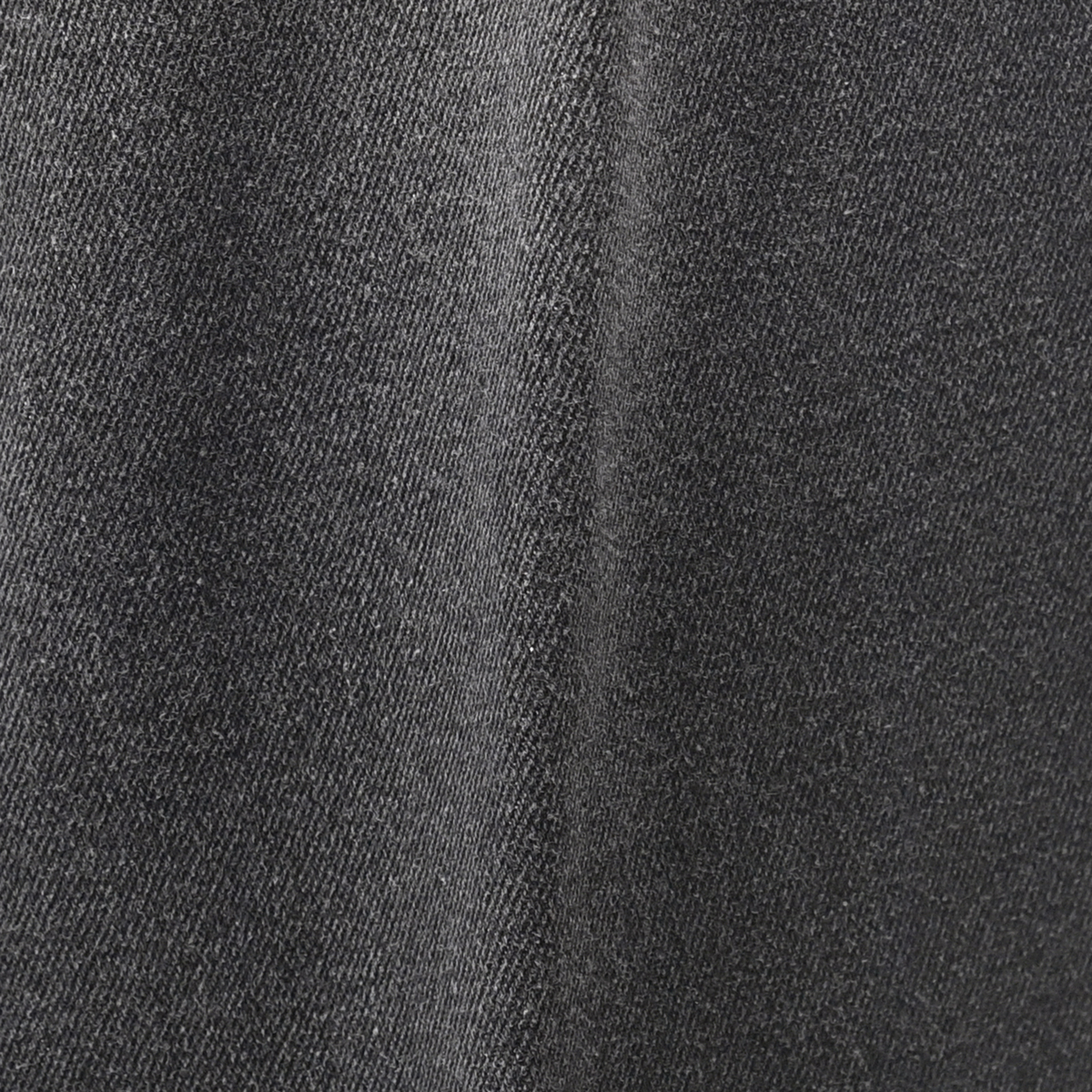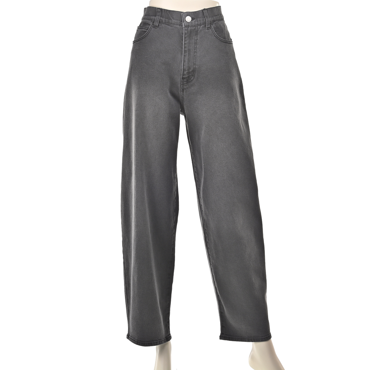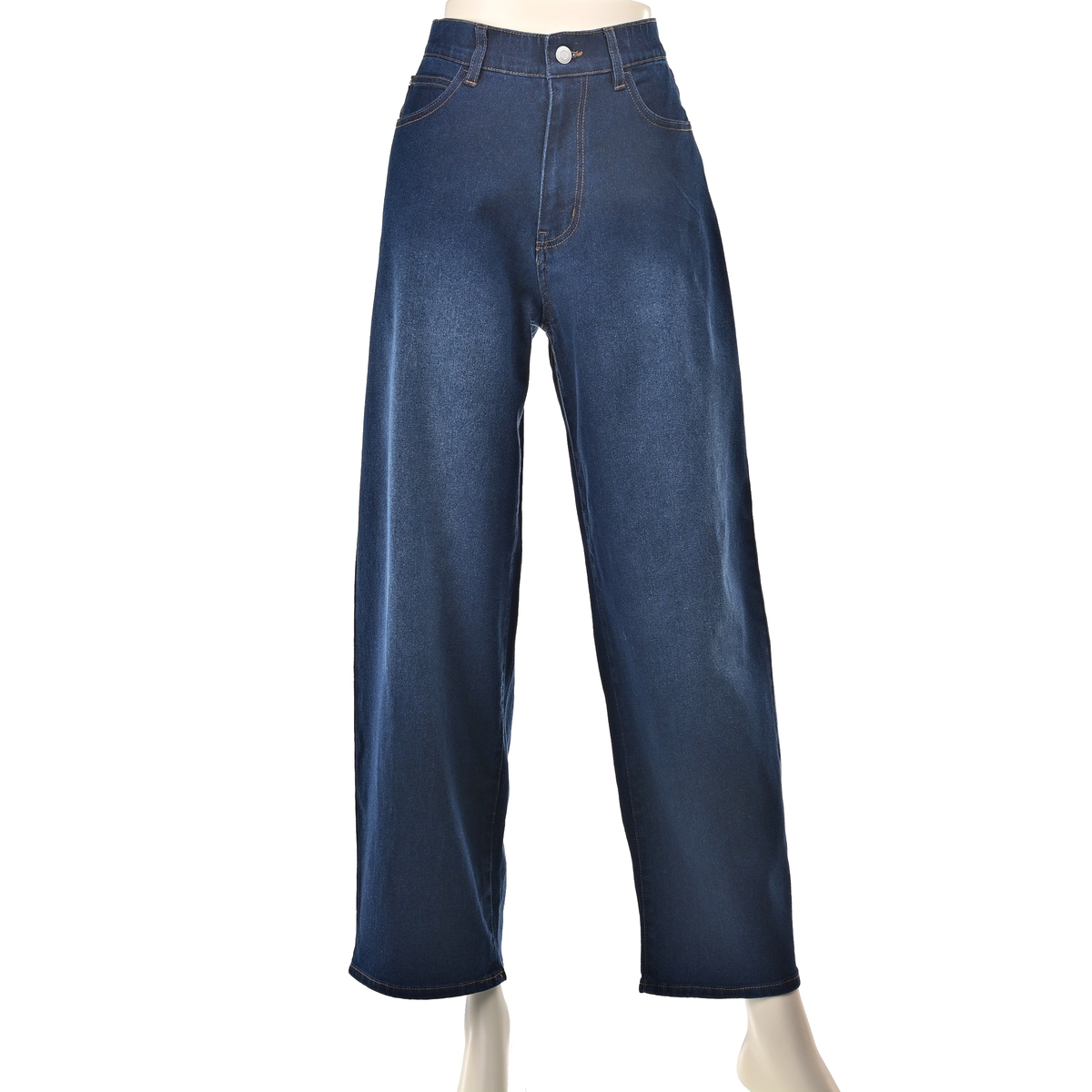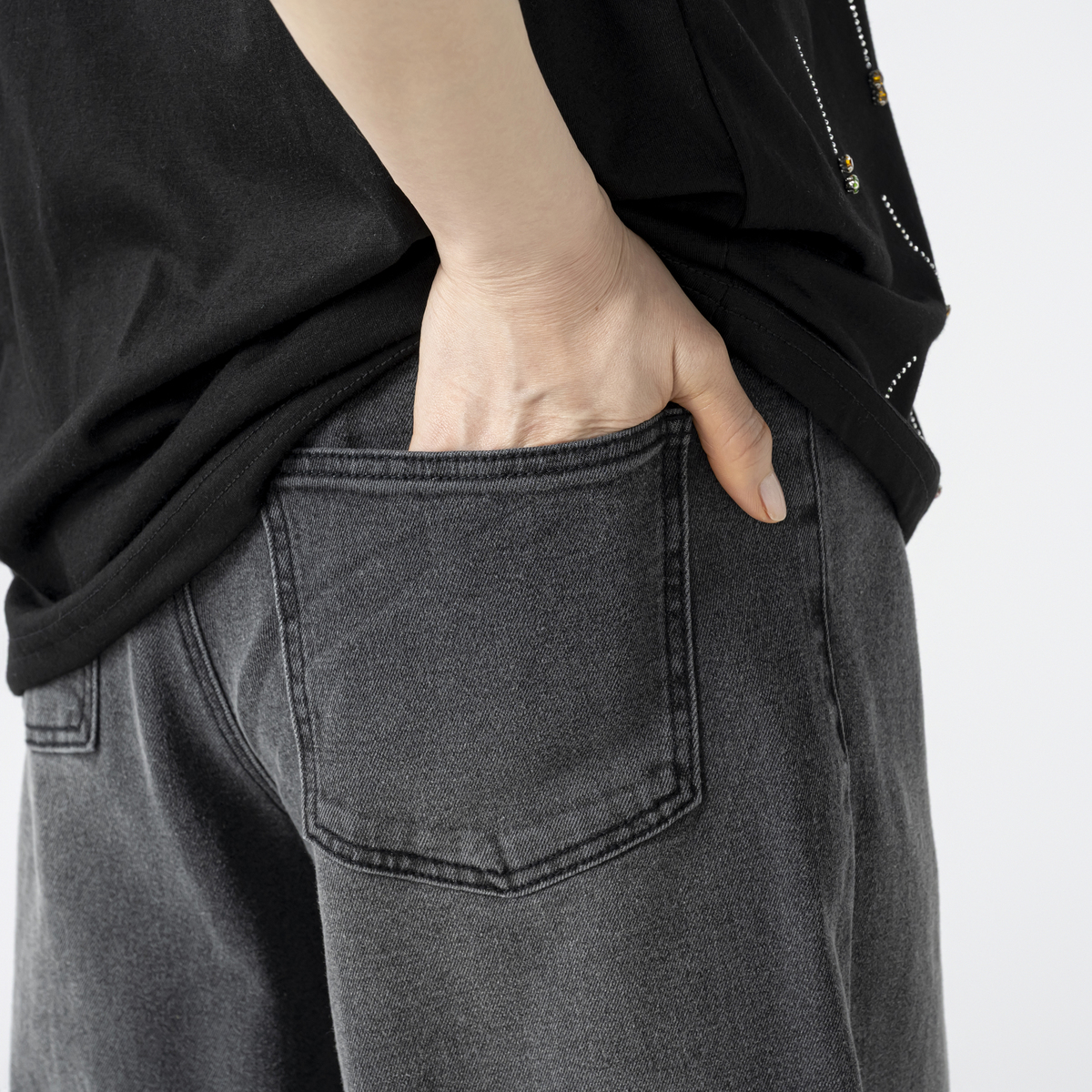 ウエストは総ゴムながらギャザーを控え、見た目はすっきり。5ポケットの本格デニム仕様で前はボタンとファスナー開き。腰まわりは程よくフィットし、脇から丸みを描きながら裾へとすぼまります。ストレッチ入りのためやや小さめの作りになっています