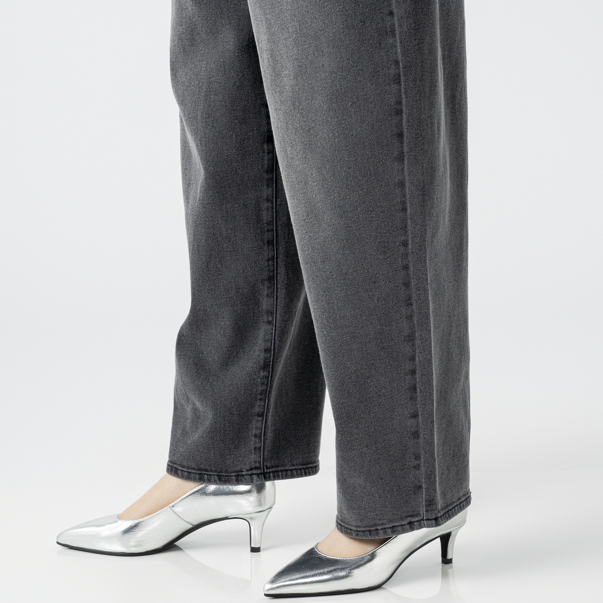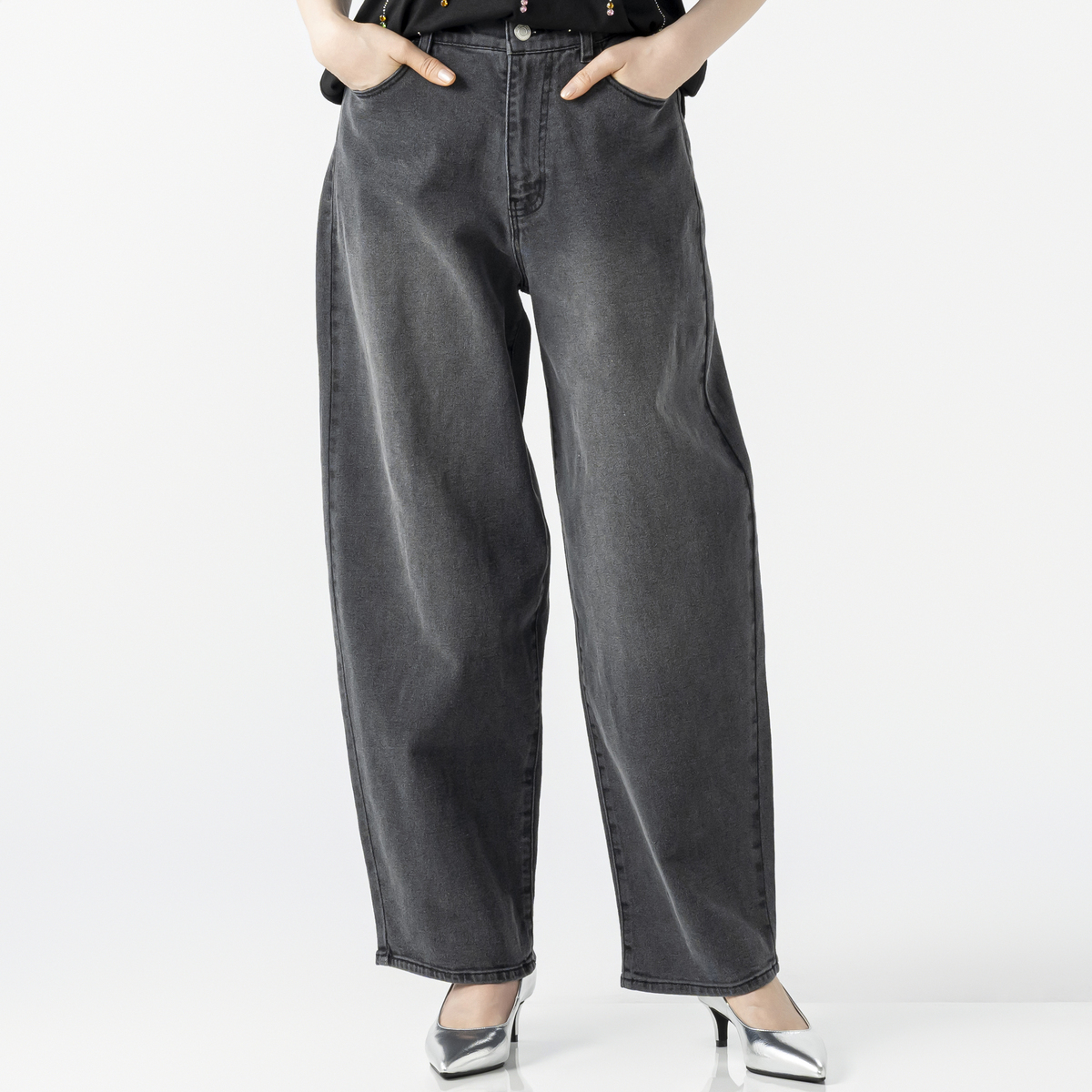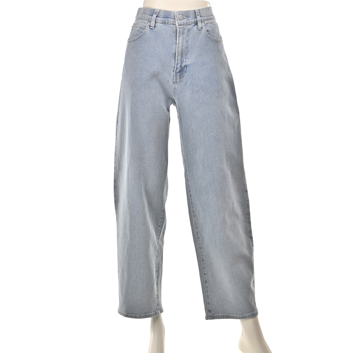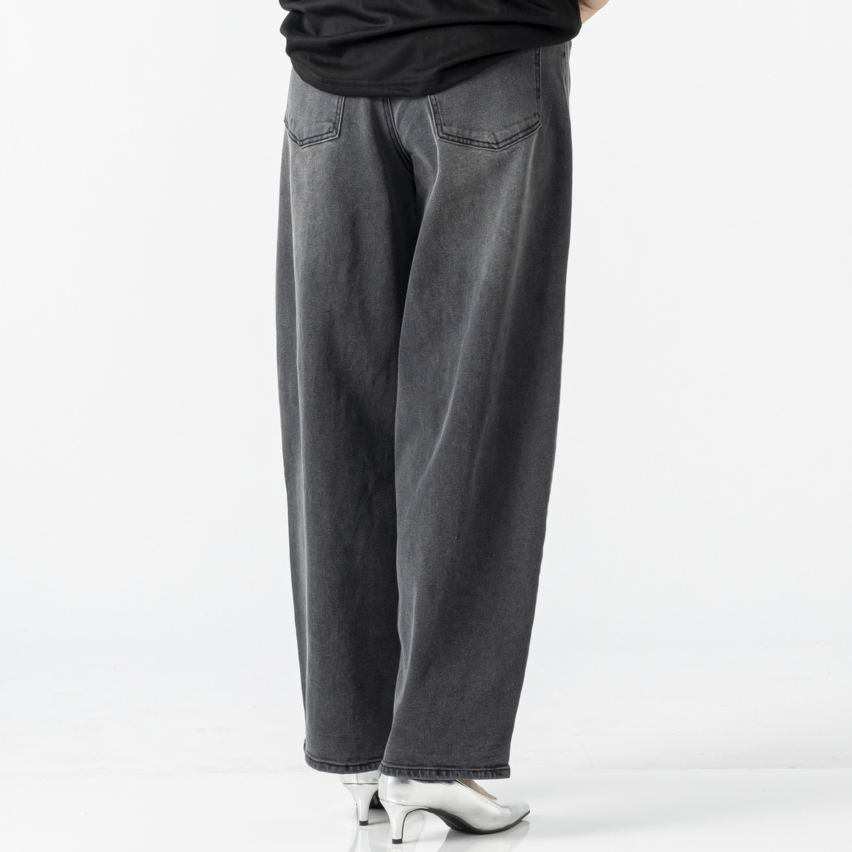 横ストレッチが効いたスラブ入りデニムのカーブパンツ。厚すぎず薄すぎない生地で柔らかく、横に伸びて体になじみます