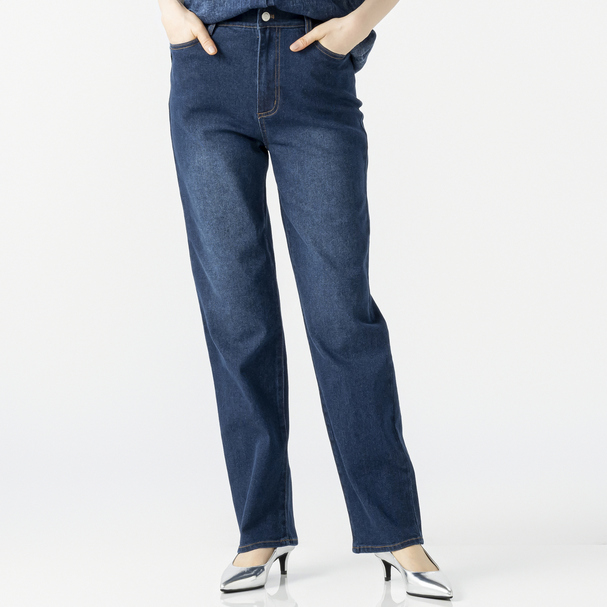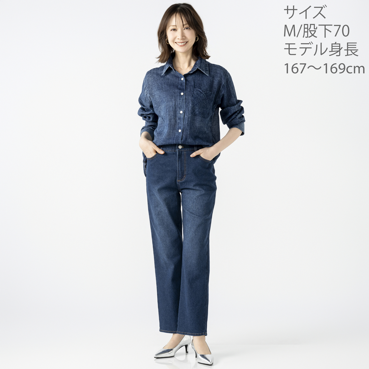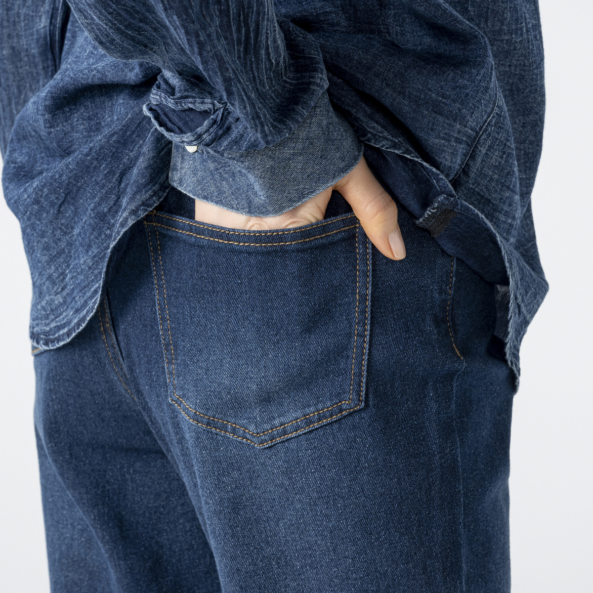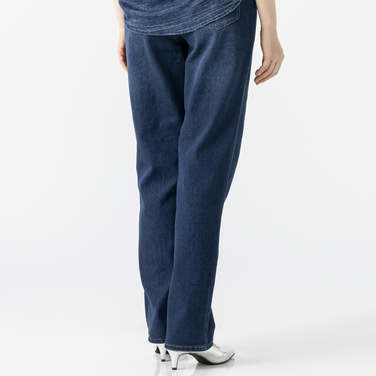 横ストレッチが効いたスラブ入りデニムのストレートパンツ。厚すぎず薄すぎない生地で柔らかく、横に伸びて体になじみます