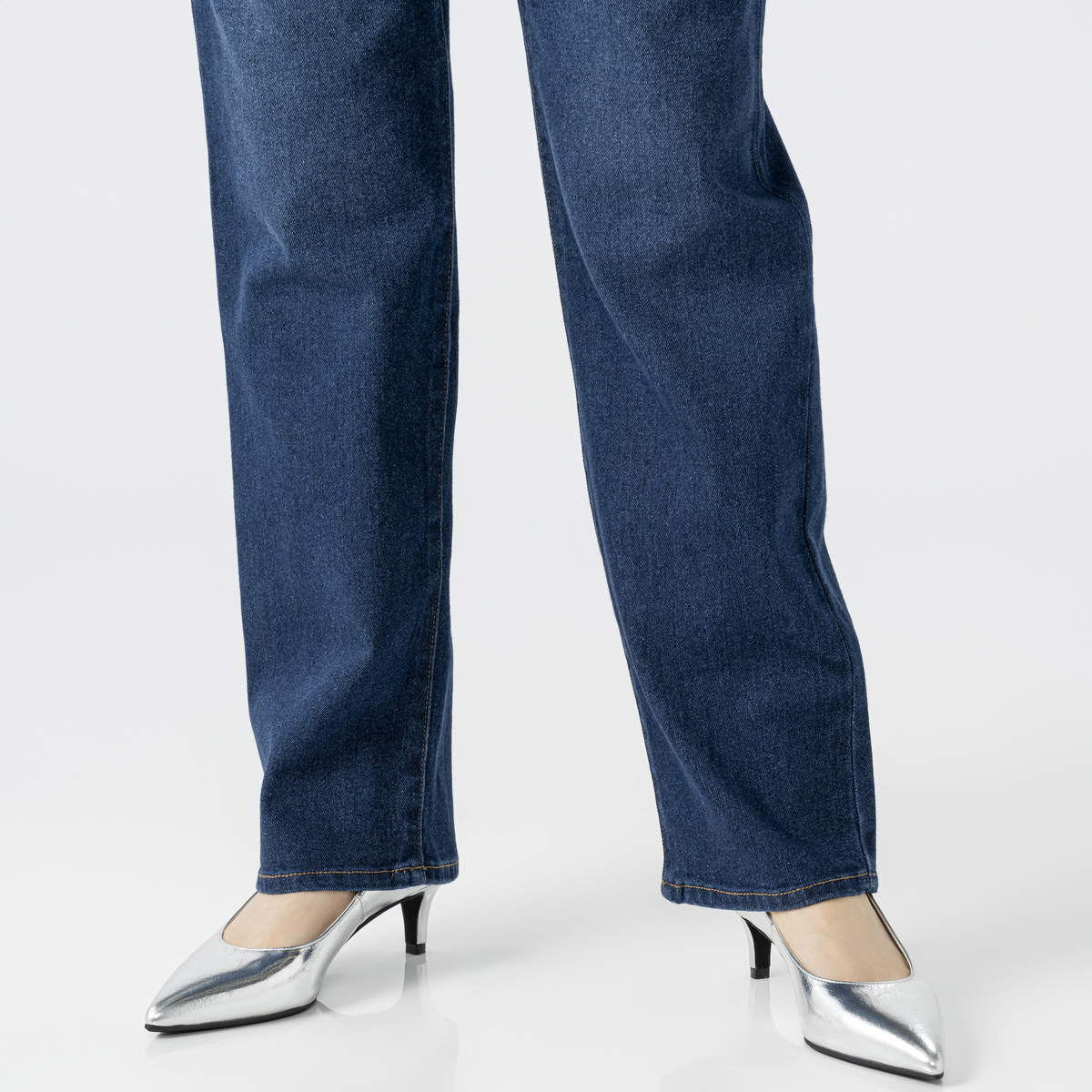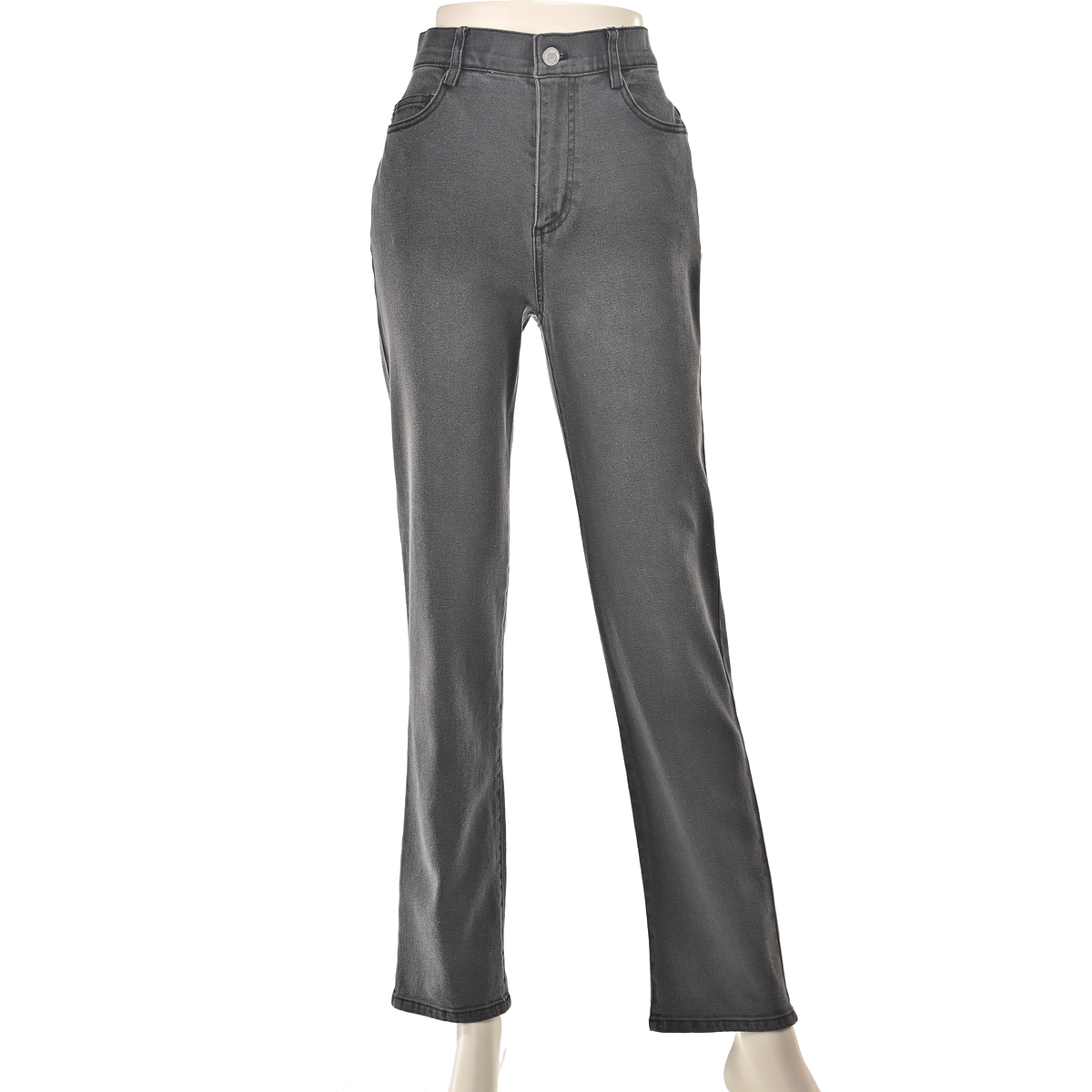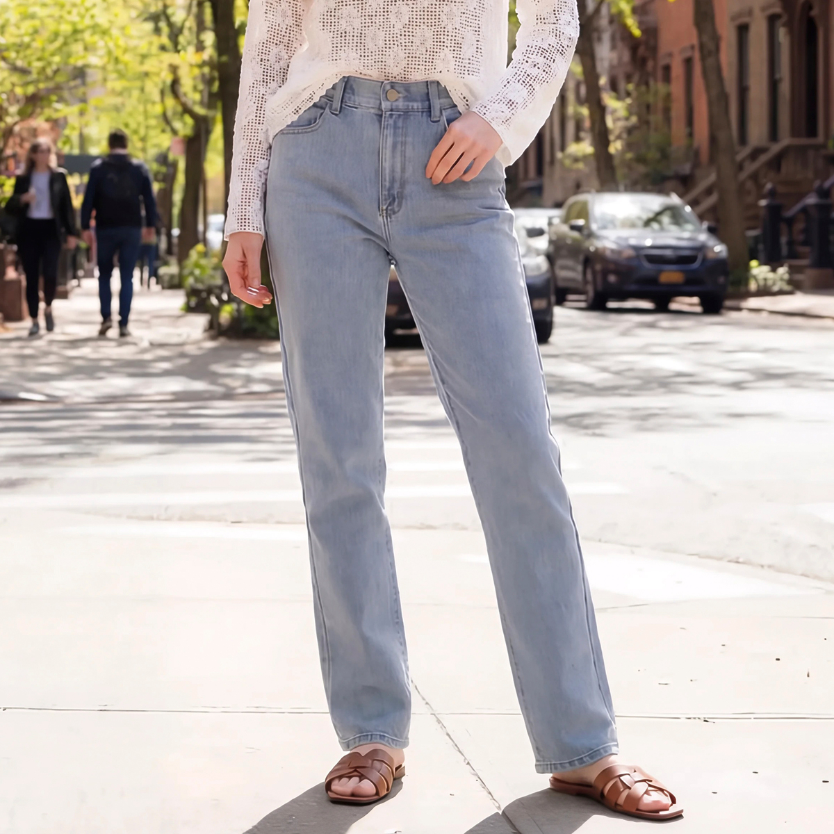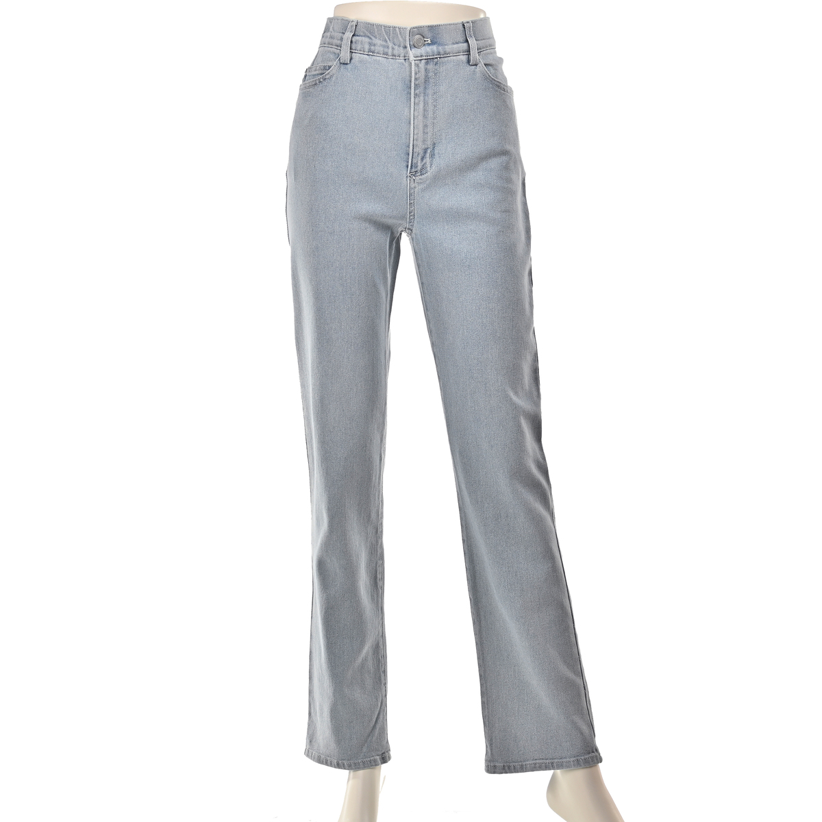 横ストレッチが効いたスラブ入りデニムのストレートパンツ。厚すぎず薄すぎない生地で柔らかく、横に伸びて体になじみます