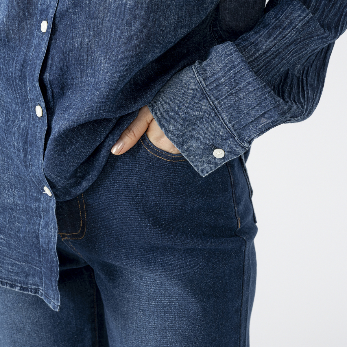 ウエストは総ゴムでもすっきり見えるデザイン。ギャザー感を抑えた仕様に、生地の伸縮性でウエストの窮屈感を軽減します。本格デニム仕様の5ポケットで、フロントはボタンとファスナー開き。ヒップから真っすぐ落ちるシルエットで、ストレッチ素材のためややコンパクトな作りです