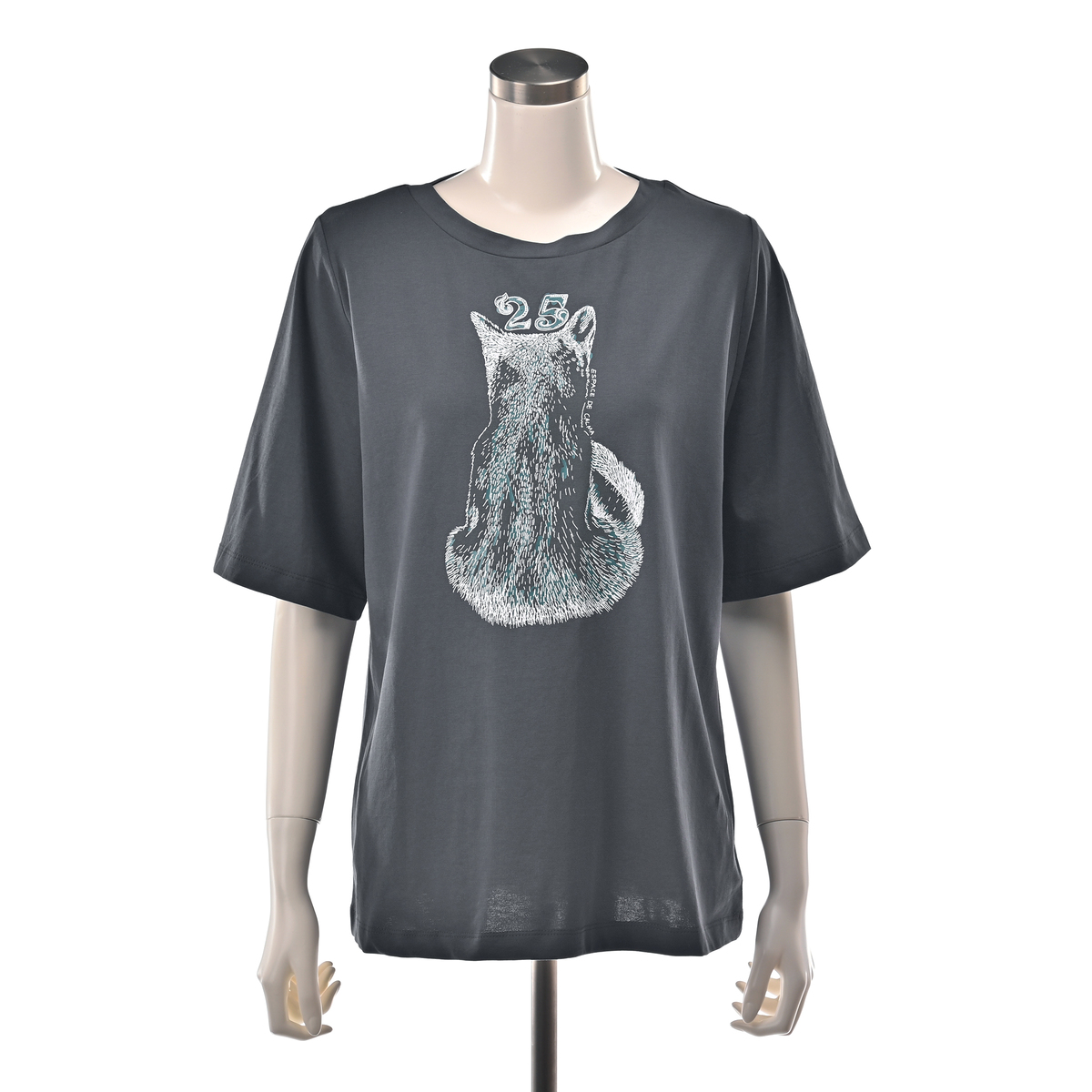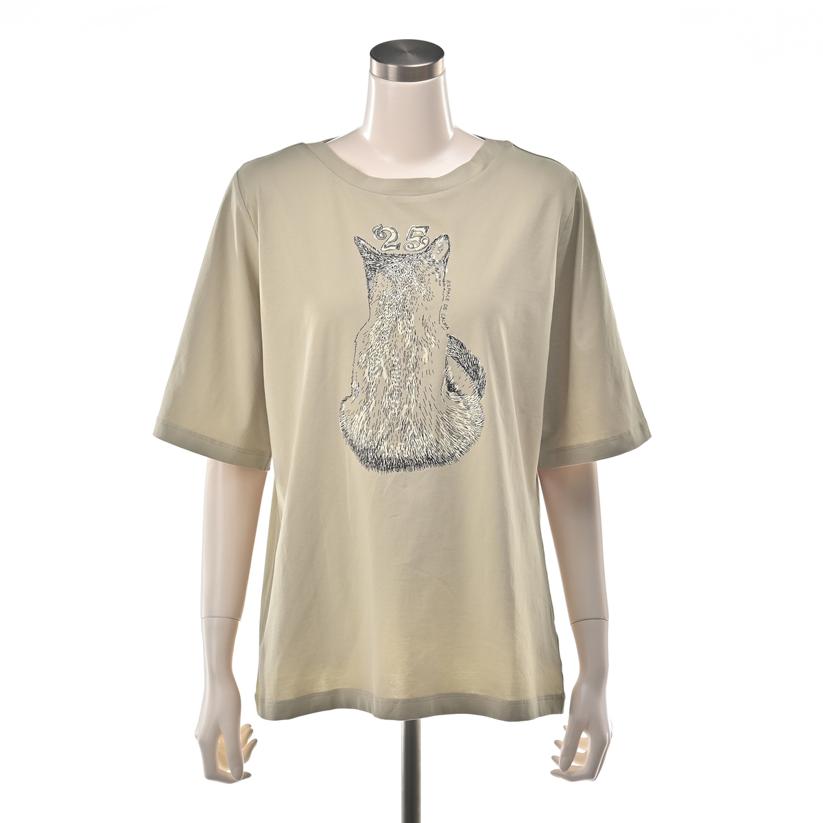 愛らしい猫の後ろ姿に、25の数字をデザインしたプルオーバー。細番手の糸を使ったベア天竺素材で、薄手ながらも透けにくく、目面が美しい仕上がり。カーブを描く脇線とゆとりあるシルエットが、体型をきれいに見せてくれます