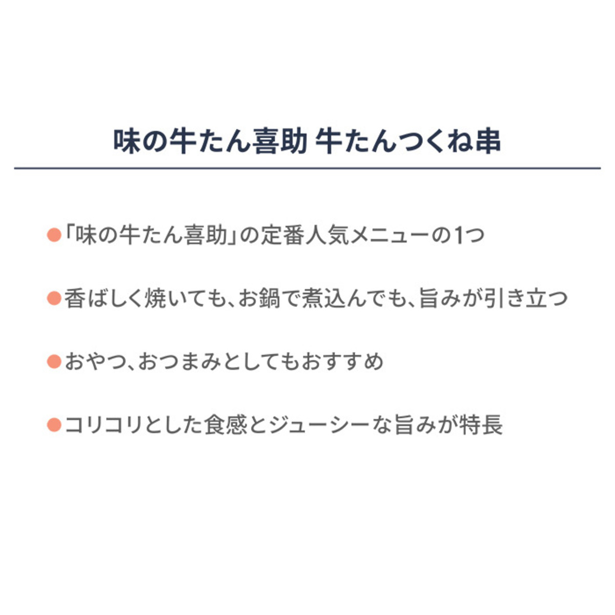 おやつ、おつまみ、お鍋の具材等、幅広い用途でお使いいただける牛たんつくね串です。昭和50年創業の牛たん専門店「味の牛たん喜助*」の定番人気メニューを、ご家庭で手軽にお楽しみいただけます