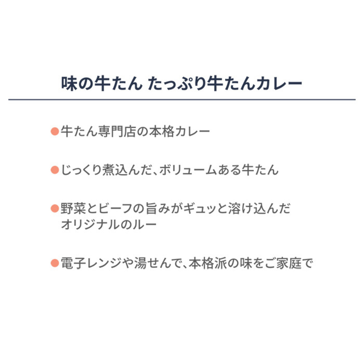[アレルギー物質特定原材料8品目] 小麦、乳 [内容量] 250g×4袋 [賞味期限] 出荷時点で賞味期限まで240日以上ある商品をお届けします [お召し上がり方] お湯で温める場合(加熱時間の目安:約5分): ・袋の封を切らずに、そのまま沸騰したお湯に入れ、温めてからお召し上がりください 電子レンジで温める場合(加熱時間の目安500Wの場合:約2分): ・袋の封を切り、深めの耐熱容器にうつし、ラップをかけて加熱してください ※加熱時間は機種・W(ワット)数により異なりますので電子レンジの説明書を参考にしてください ※電子レンジのオート(自動)機能での加熱や、温めすぎは、加熱中や加熱後の突然の沸騰や、やけどの原因になりますのでご注意ください ※加熱後は、軽くかきまぜてからお召し上がりください [注意事項] ※この商品はレトルトパウチ食品です ※温めた後の製品は熱くなっておりますので、取扱い時にやけどをしないようご注意ください ※開封時に手を切らないようご注意ください [原料原産地] 牛たん加工品(国内製造) [原産国] 日本 [原材料] 牛たん加工品(国内製造)、炒めたまねぎ、トマトピューレー、なたね油、小麦粉、発酵乳、砂糖、カレー粉、香辛料、ビーフエキス調味料、たん白加水分解物、食塩、にんにく、おろししょうが/増粘剤(加工デンプン)、(一部に乳成分・小麦・牛肉・大豆・豚肉を含む)