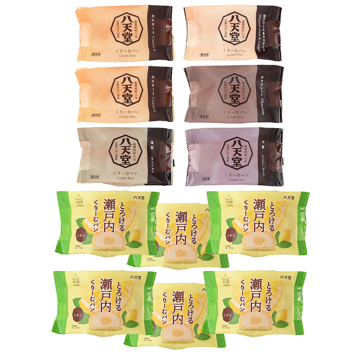 [アレルギー物質特定原材料8品目] 卵、小麦、乳 ※はちみつを使用しているため、1歳未満の乳児には食べさせないでください。 [商品内容] ・カスタード×2 ・生クリーム&カスタード ・抹茶 ・チョコレート ・小倉 ・とろける瀬戸内くりーむパンレモン×6 [賞味期限] 出荷時点で賞味期限まで60日以上ある商品をお届けします [保存方法] 開封前:冷凍(-18℃以下)で保存してください 開封後:解凍後はお早めにお召し上がりください [お召し上がり方] 冷蔵庫で24時間を目安に解凍してお早めにお召し上がりください [注意事項] ※はちみつを使用しているため、1歳未満の乳児には食べさせないでください ※届いた日にお召し上がりにならない場合は、商品をお受け取り後すぐに冷凍庫に入れて保管し、商品裏面の賞味期限までにお召し上がりください ※解凍後は、冷蔵庫で保存してください ※風味が損なわれる恐れがありますので、再凍結はお避けください [原料原産地] カスタード、抹茶、チョコレート:牛乳(国内製造) 生クリーム&カスタード:生クリーム(国内製造) 小倉:粒あん(国内製造) 瀬戸内くりーむパンレモン:乳等を主要原料とする食品(国内製造) [原産国] 日本 [原材料] くりーむパン(カスタード): 牛乳(国内製造)、乳等を主要原料とする食品、小麦粉、卵、砂糖、マーガリン、はちみつ、酵母、食塩、脱脂粉乳、ホエイパウダー、小麦グルテン、植物油脂/グリシン、トレハロース、乳化剤、pH調整剤、加工澱粉、酵素、安定剤(増粘多糖類)、リゾチーム、(一部に小麦・卵・乳成分・大豆を含む) くりーむパン(抹茶): 牛乳(国内製造)、小麦粉、乳等を主要原料とする食品、卵、砂糖、マーガリン、はちみつ、酵母、抹茶、食塩、脱脂粉乳、ホエイパウダー、小麦グルテン、植物油脂/グリシン、トレハロース、乳化剤、pH調整剤、加工澱粉、酵素、安定剤(増粘多糖類)、リゾチーム、(一部に小麦・卵・乳成分・大豆を含む) くりーむパン(生クリーム&カスタード): 生クリーム(国内製造)、小麦粉、牛乳、卵、砂糖、マーガリン、はちみつ、酵母、食塩、脱脂粉乳、ホエイパウダー、小麦グルテン、植物油脂/トレハロース、グリシン、乳化剤、酵素、(一部に小麦・卵・乳成分・大豆を含む) くりーむパン(小倉): 粒あん(国内製造)、小麦粉、牛乳、乳等を主要原料とする食品、卵、砂糖、マーガリン、はちみつ、酵母、食塩、脱脂粉乳、ホエイパウダー、小麦グルテン、植物油脂/トレハロース、グリシン、乳化剤、酵素、pH調整剤、加工澱粉、リゾチーム、安定剤(増粘多糖類)、(一部に小麦・卵・乳成分・大豆を含む) くりーむパン(チョコレート): 牛乳(国内製造)、小麦粉、乳等を主要原料とする食品、卵、砂糖、準チョコレート、マーガリン、はちみつ、酵母、食塩、脱脂粉乳、ホエイパウダー、小麦グルテン、植物油脂/グリシン、トレハロース、乳化剤、pH調整剤、加工澱粉、酵素、香料、安定剤(増粘多糖類)、リゾチーム、(一部に小麦・卵・乳成分・大豆を含む) とろける瀬戸内くりーむパンレモン: 乳等を主要原料とする食品(国内製造)、レモンフィリング、小麦粉、牛乳、卵、砂糖、マーガリン、はちみつ、酵母、食塩、脱脂粉乳、ホエイパウダー、小麦グルテン、植物油脂/トレハロース、グリシン、乳化剤、ゲル化剤(ペクチン)、酸味料、pH調整剤、加工澱粉、酒精、酵素、安定剤(増粘多糖類)、リゾチーム、香料、(一部に小麦・卵・乳成分・オレンジ・大豆を含む)