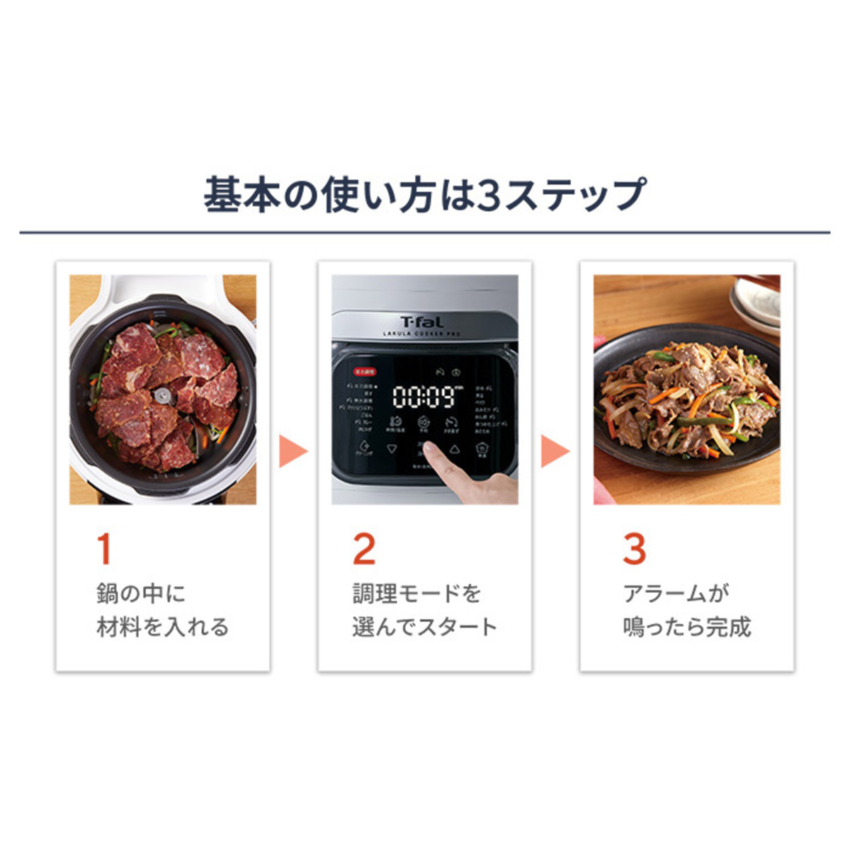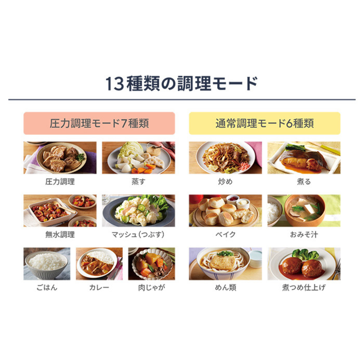 圧力調理、蒸す、無水調理、マッシュ(つぶす)、ごはん、カレー、肉じゃが