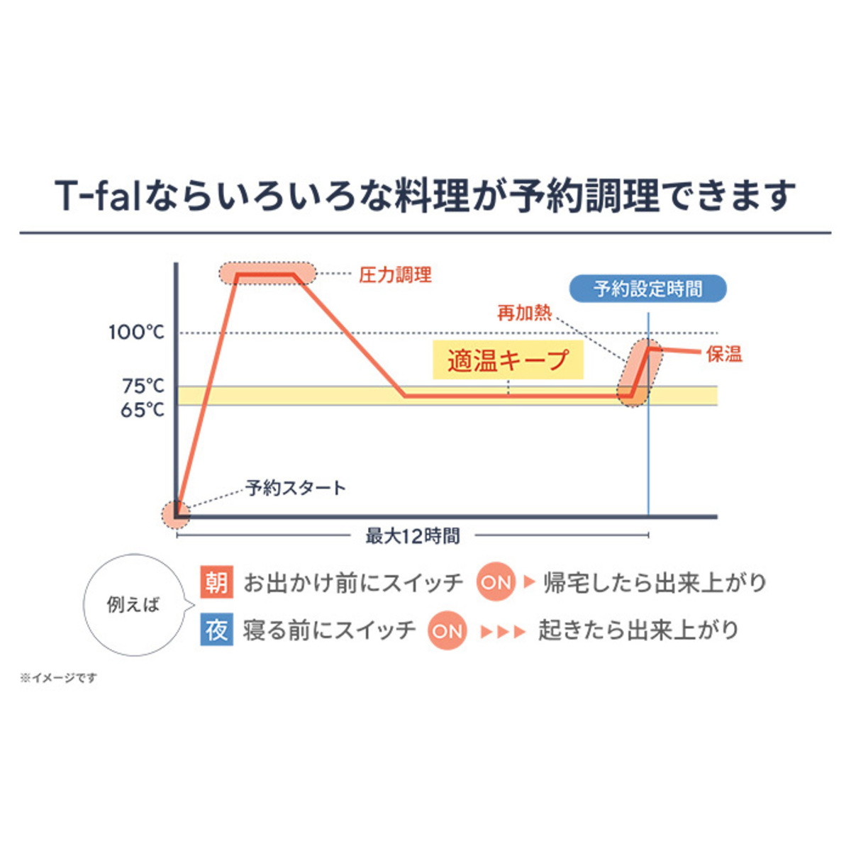 ***設定可能な予約時間は1〜12時間です(10分単位・ボタンを長押しすると30分単位)/調理完了までの時間を設定できます/「蒸す」モードと「通常調理」(非圧力調理)の調理モードでは予約調理ができません/生肉・生魚・生卵・生魚介類などの調理には使用しないでください。腐敗やにおいの原因となります