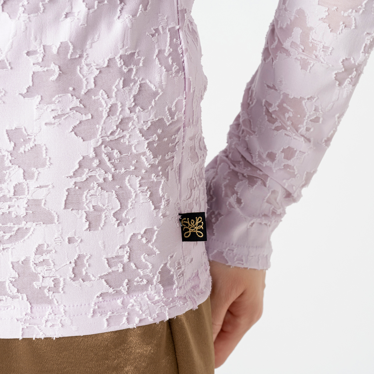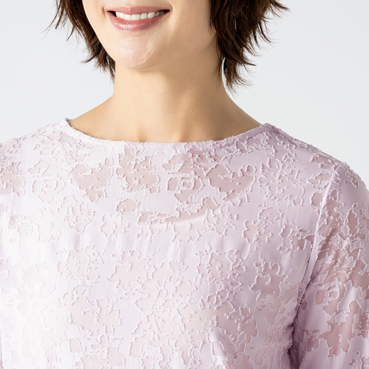 花柄のカットソー生地をジャカード編みで仕上げ、柄の境界線をカットすることでフリンジのような立体感に。繊細なシアー感と伸縮性もよく、体に程よくフィットします