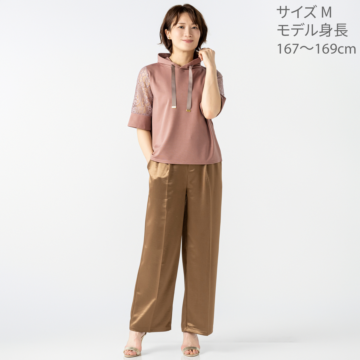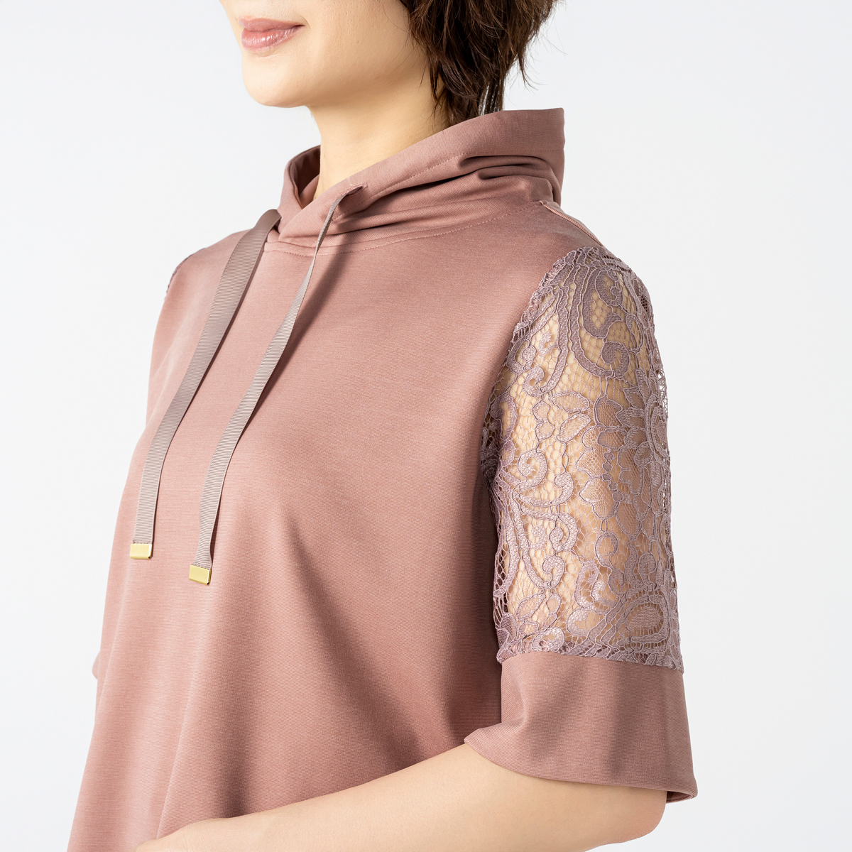 上品な光沢とシアー感の袖がアクセントになるフーディープルオーバー。適度なハリとストレッチを備えたポンチ素材で、なめらかな風合いが心地よく肌に寄り添います。袖には刺繍レースを贅沢に配し、涼やかな表情をプラスしました