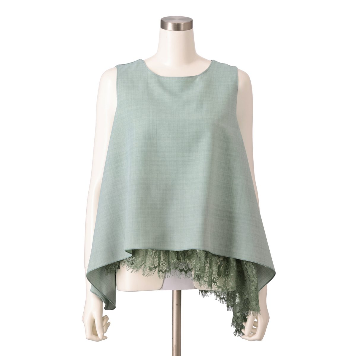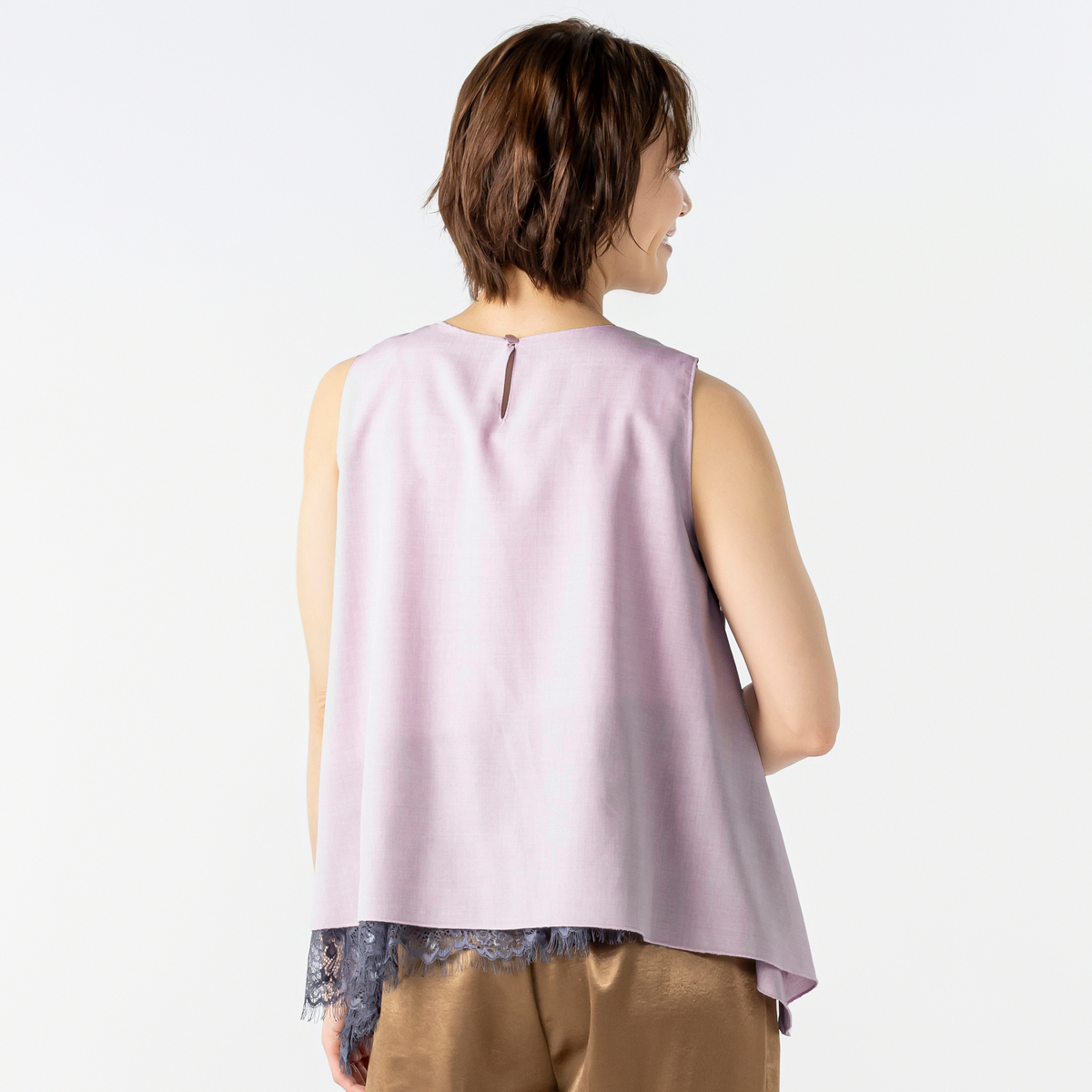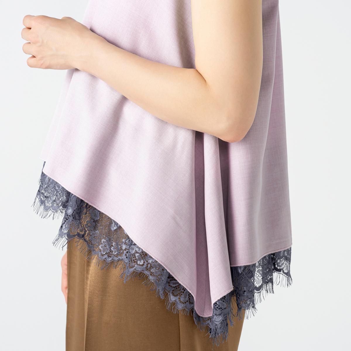 裏地の裾に繊細なスカラップヒゲレースをあしらったフレアトップス。左脇からレースが覗き、アシンメトリーに重ね着をしているような奥行きのある表情を楽しめます