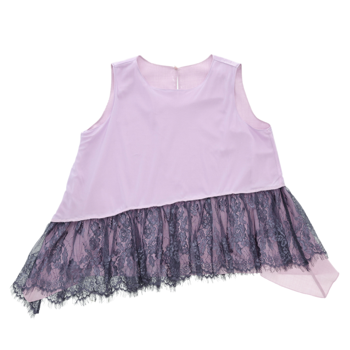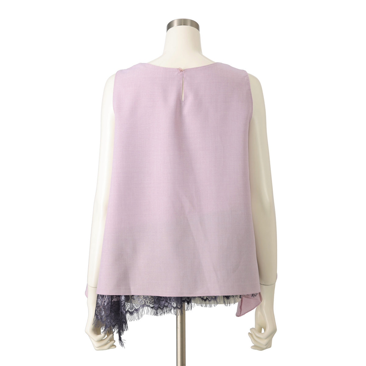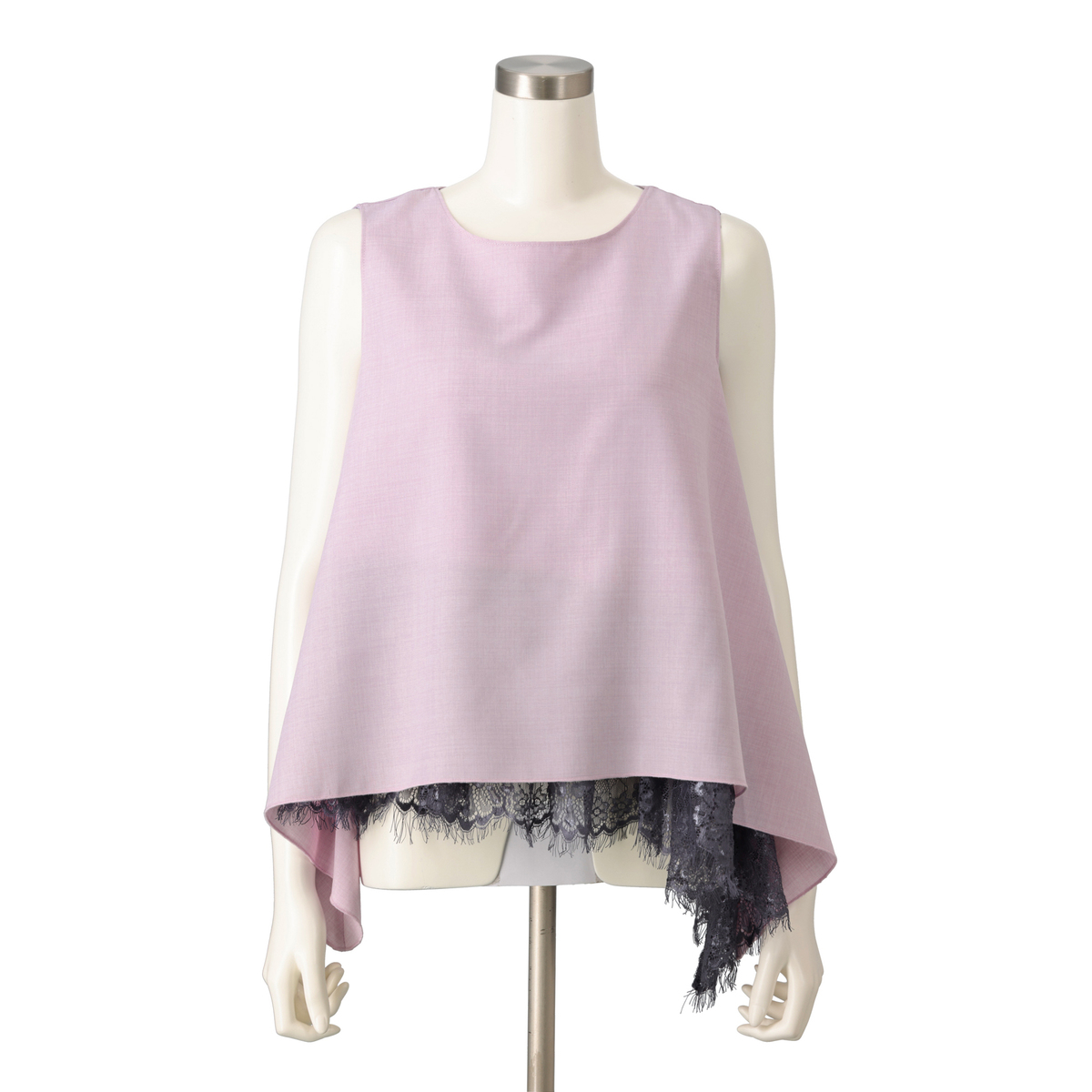 裏地の裾に繊細なスカラップヒゲレースをあしらったフレアトップス。左脇からレースが覗き、アシンメトリーに重ね着をしているような奥行きのある表情を楽しめます