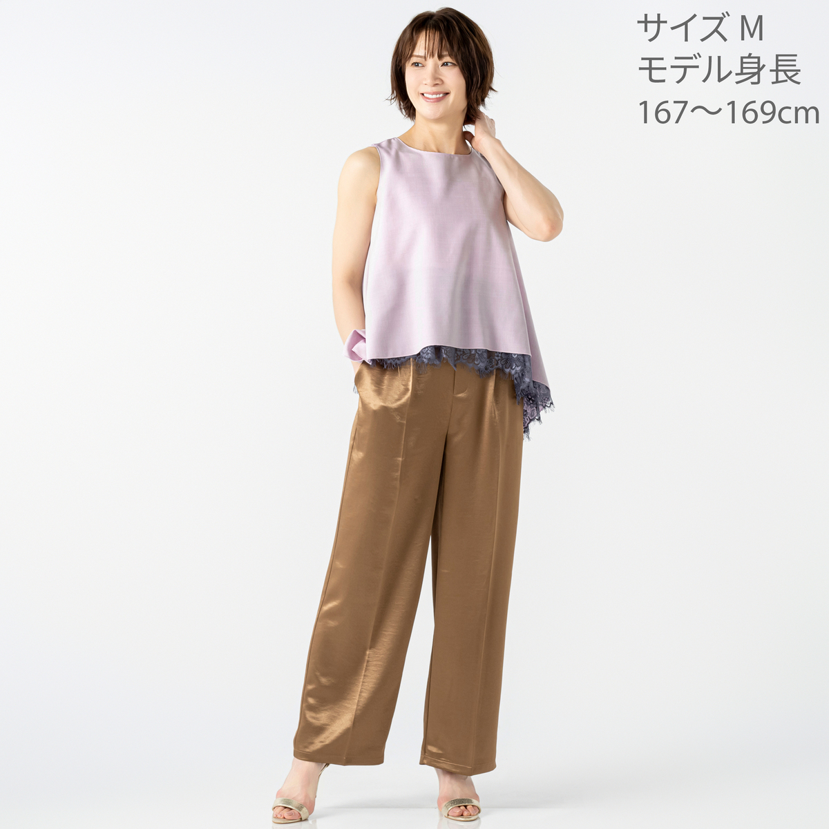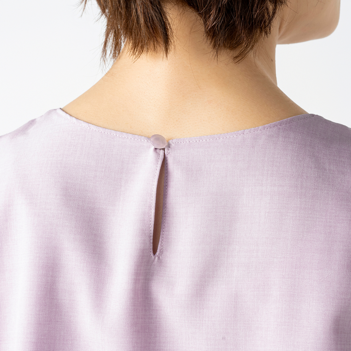 ナチュラル調の表面感が特徴のポリエステル素材を使用。麻のように心地よく、ドライタッチでさらっとした風合いに加え、程よいドレープ性も。裏地にはポリエステルのカットソー裏地を使用。滑りが良く、ストレッチ性があり、薄手で軽くさらっとした風合いが特徴です