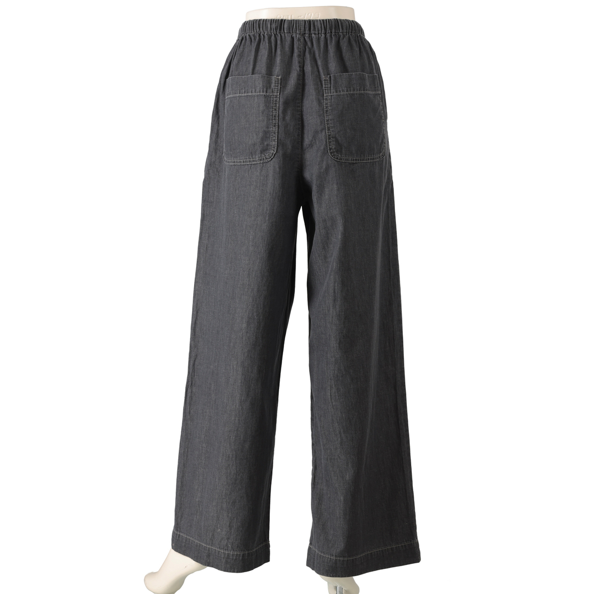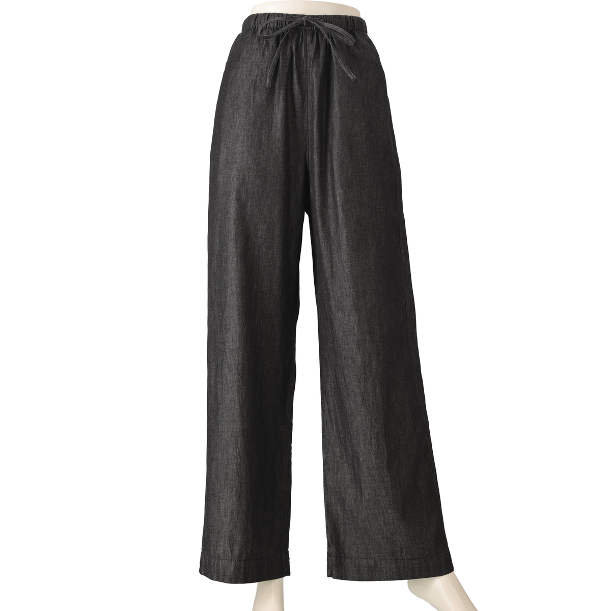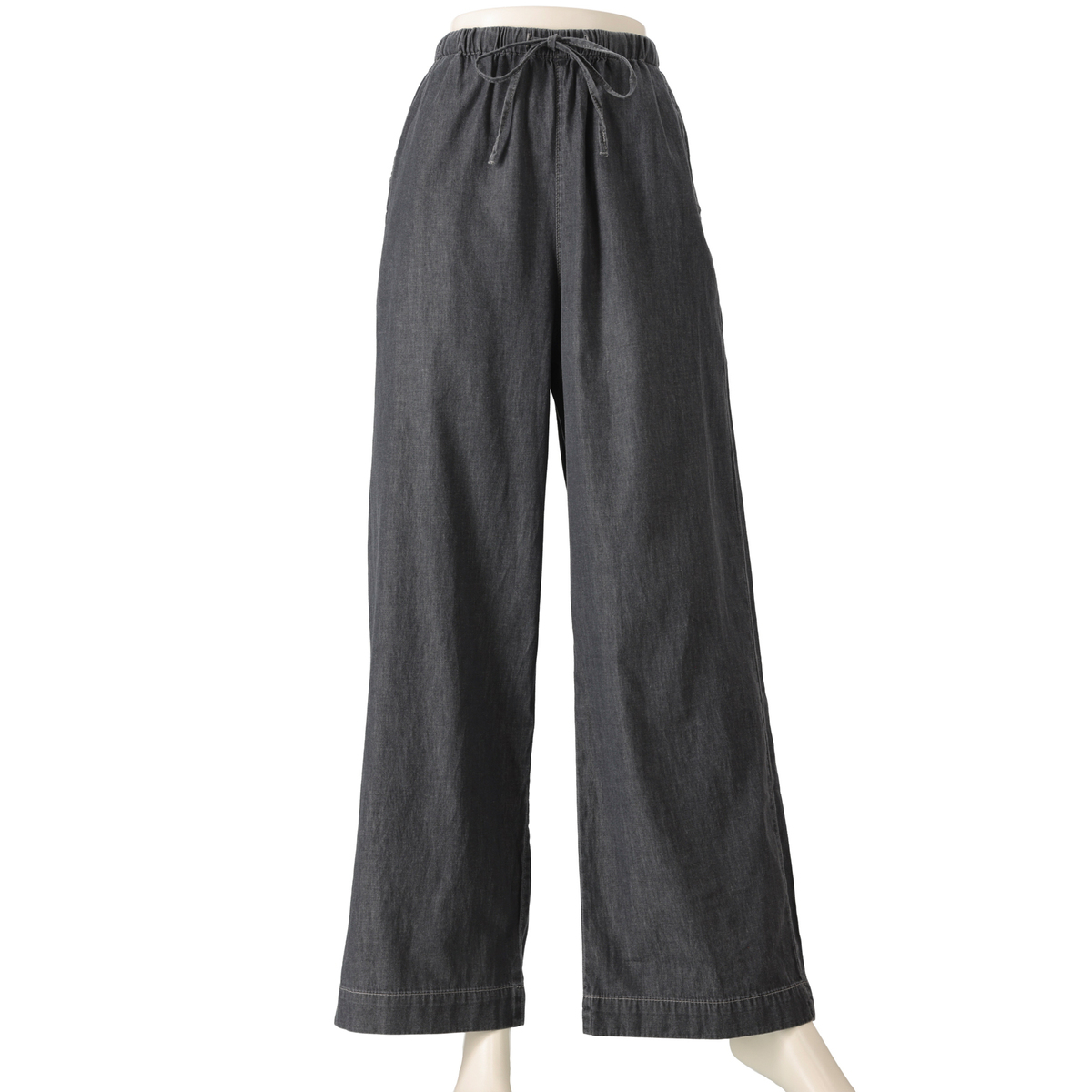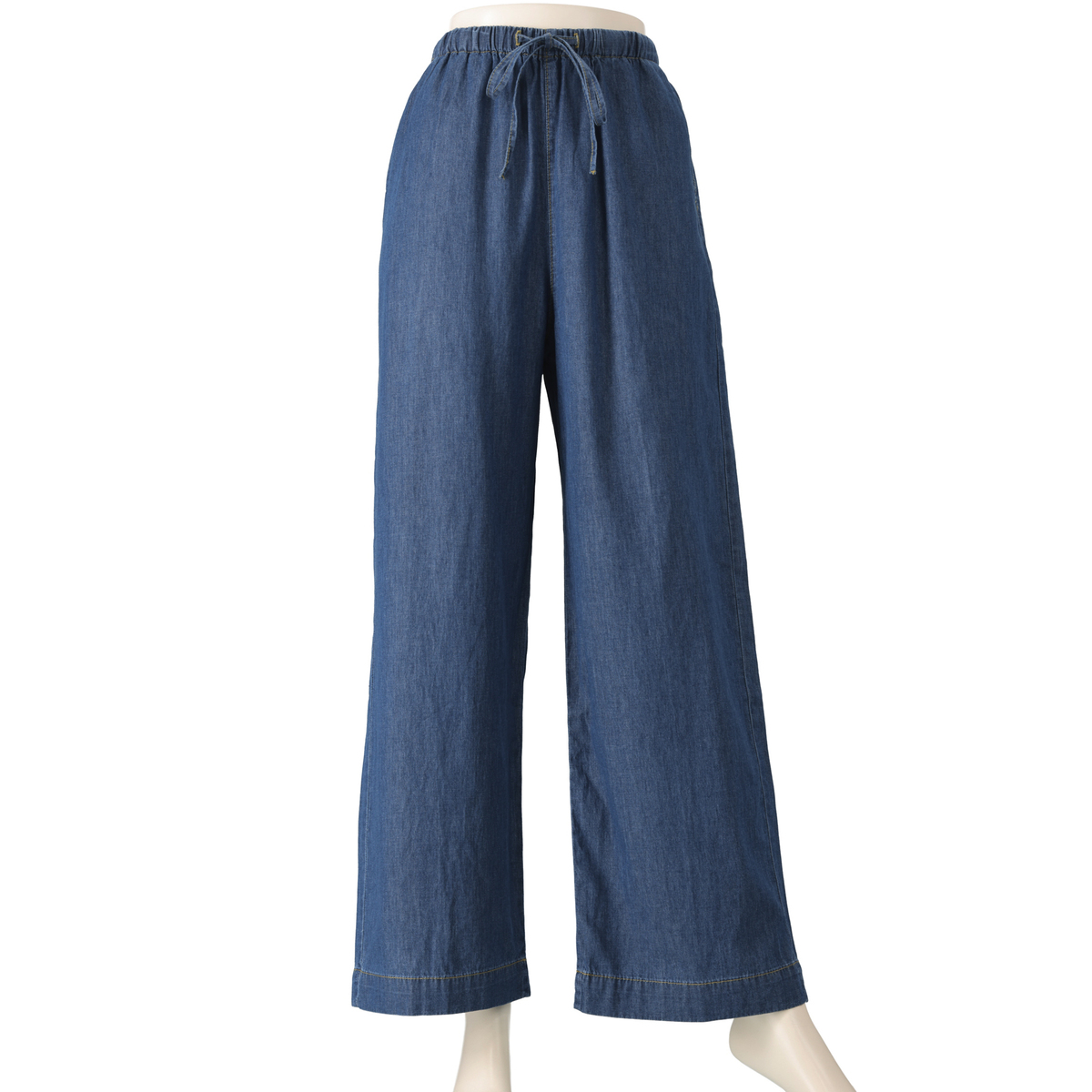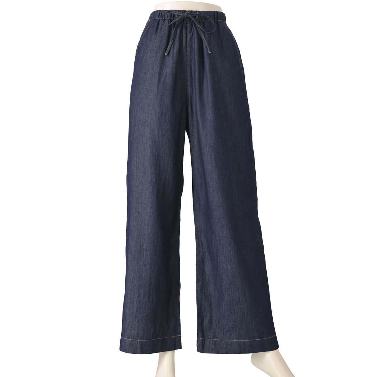 ウエストゴムでイージーな穿き心地のデニムパンツ。ウエストから腰周りはにウエストゴムギャザーが膨らみすぎないようすっきりと仕上げ、ヒップ下からはゆとりのあるワイドシルエットに。フロントの紐もアクセントになり、ウエスト調節もできます