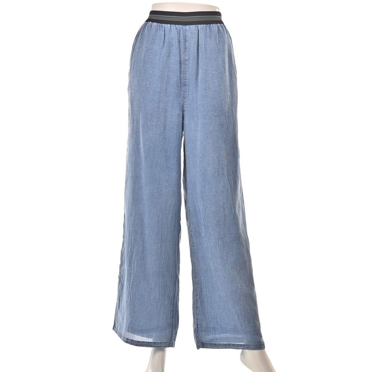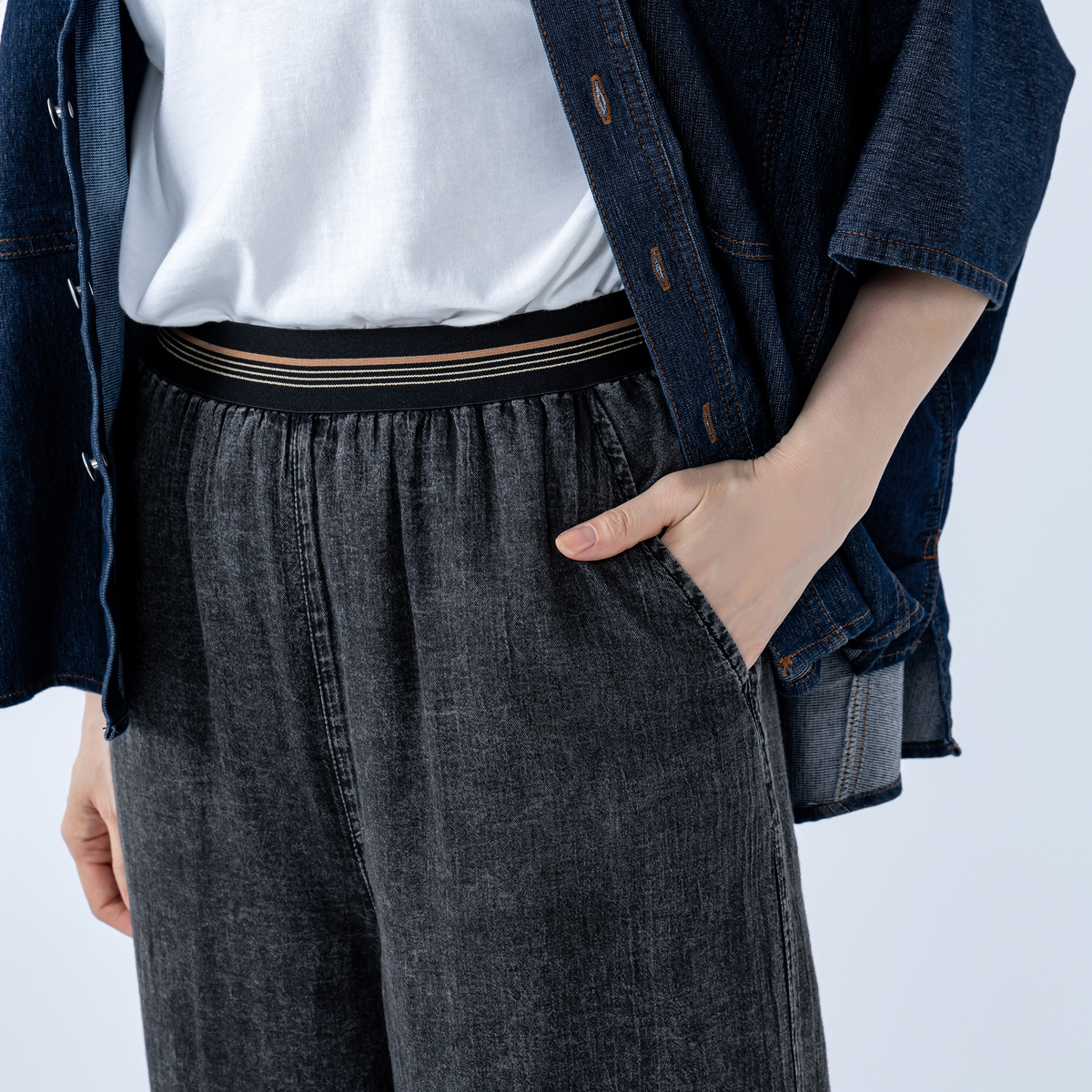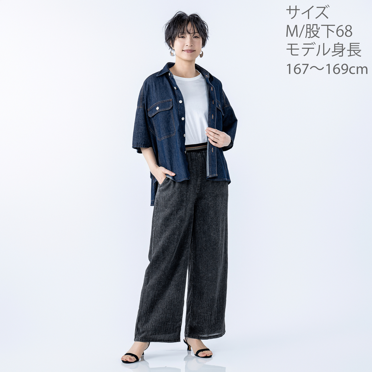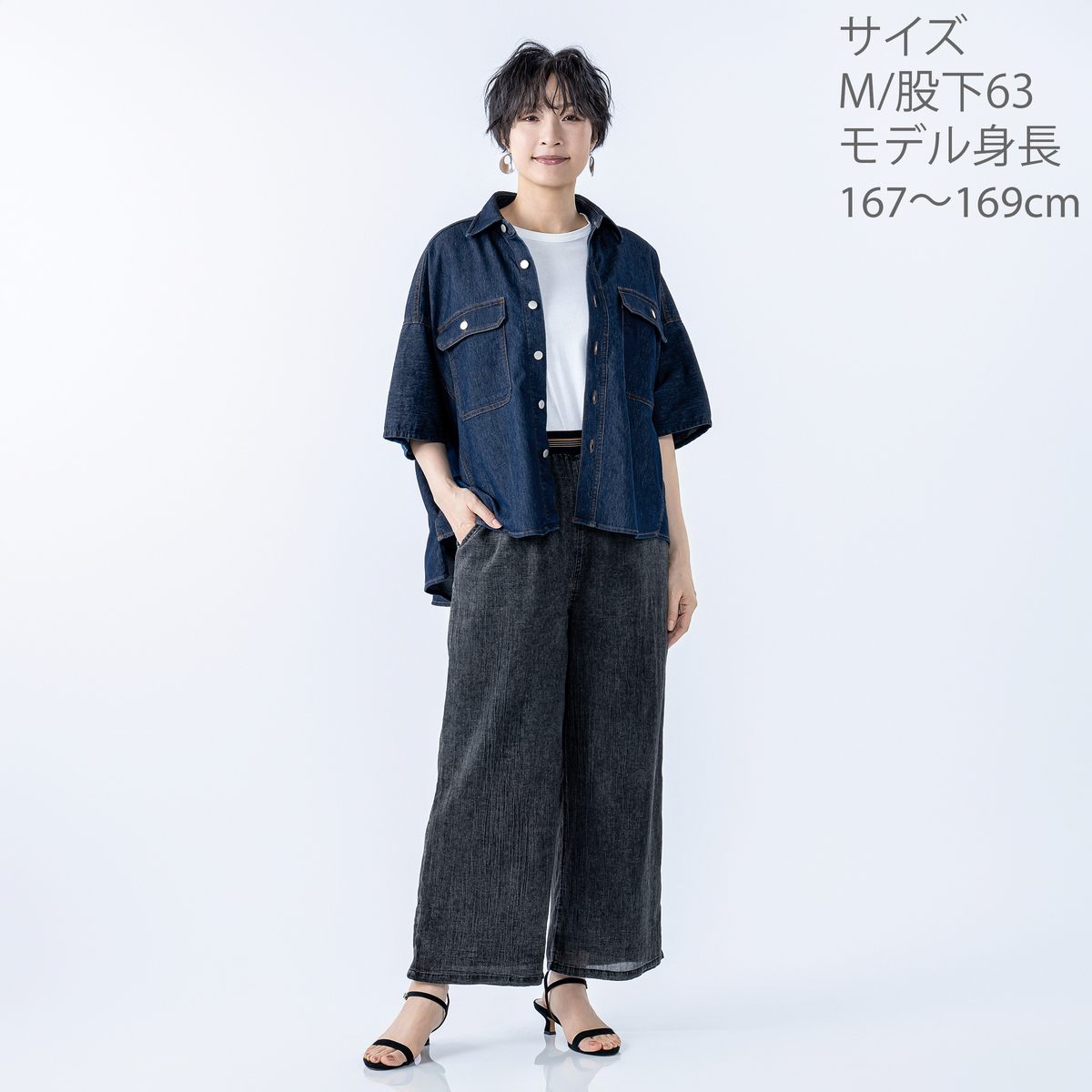 綿100%のシアーデニム素材を表地に使用した、軽やかなセミワイドパンツです。シフォンのような透け感と柔らかさがあり、デニムの風合いも楽しめます。肌離れの良い裏地付きで、心地よい穿き心地です