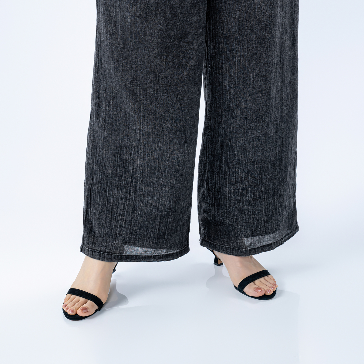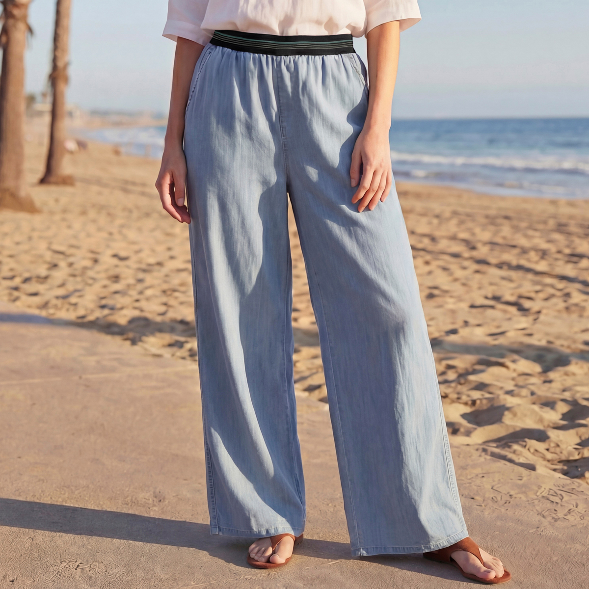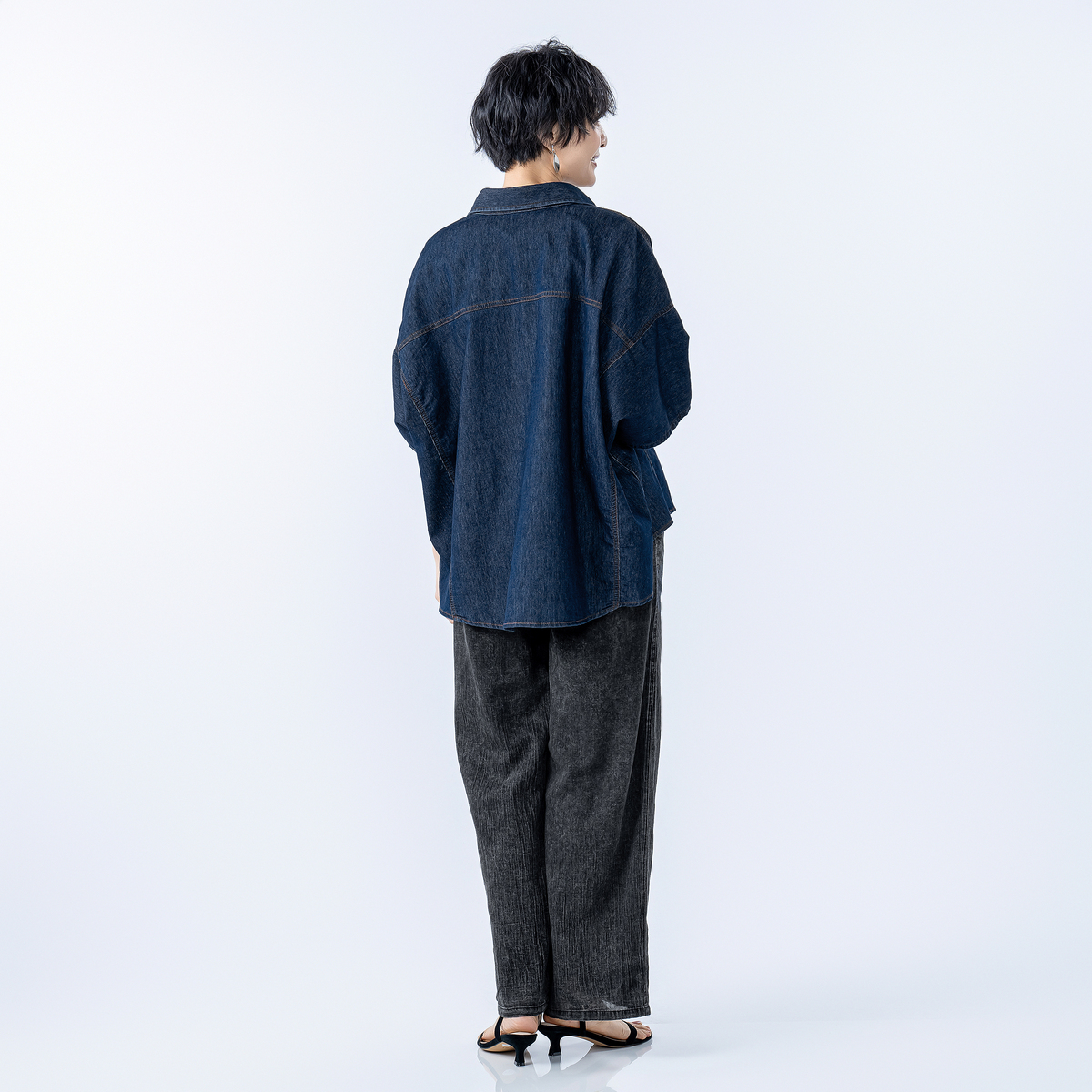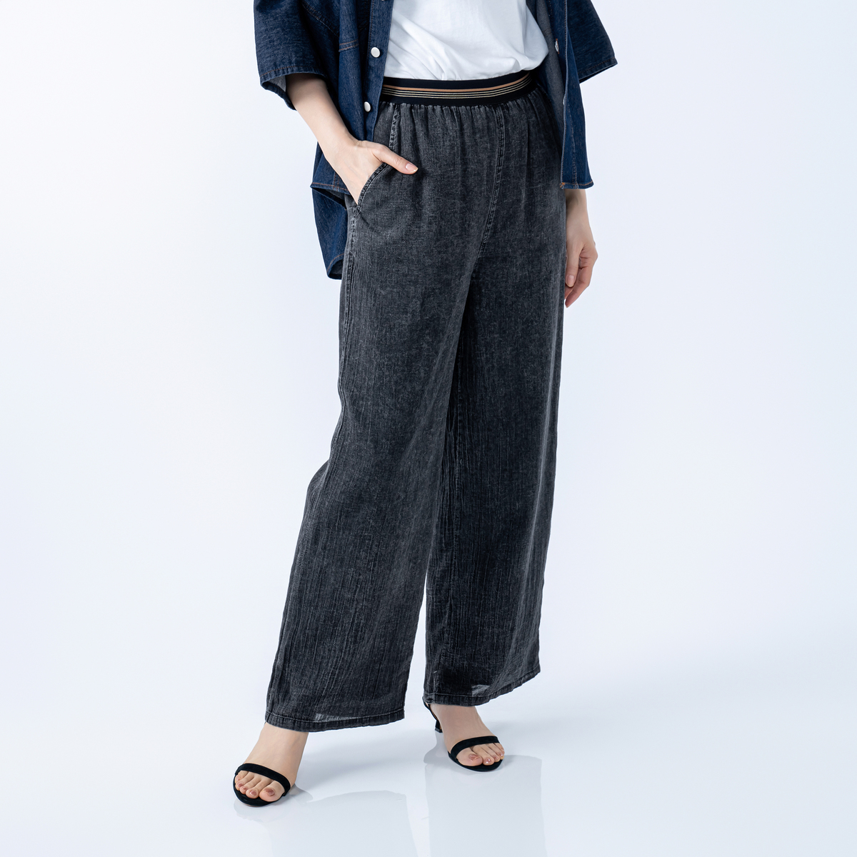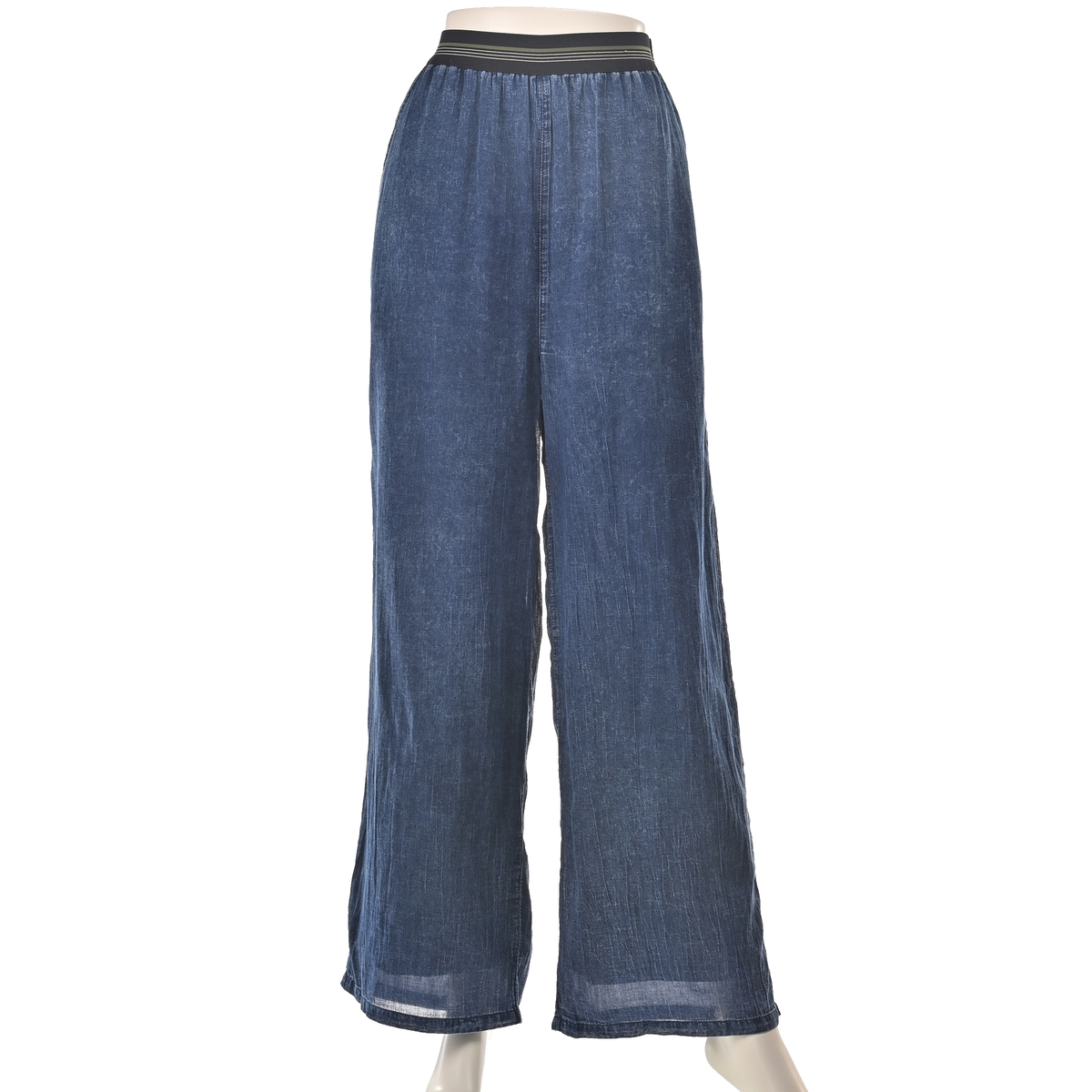 綿100%のシアーデニム素材を表地に使用した、軽やかなセミワイドパンツです。シフォンのような透け感と柔らかさがあり、デニムの風合いも楽しめます。肌離れの良い裏地付きで、心地よい穿き心地です