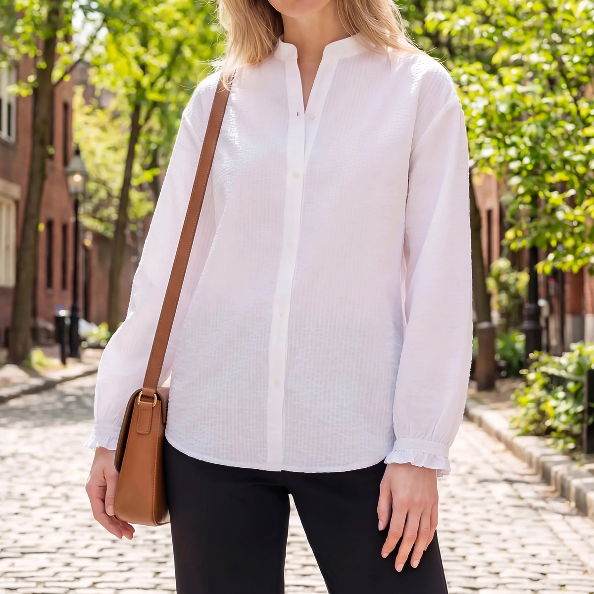 綿100%のリップル素材が心地よい、バンドカラーのブラウス。襟元と袖口に寄せたギャザーやフリルがほどよい華やぎを添えます。脇線を前振りにしたすっきり見える仕立てで、袖口は2つのボタンで調整可能。凹凸のある生地が肌離れよく、快適に着用できます