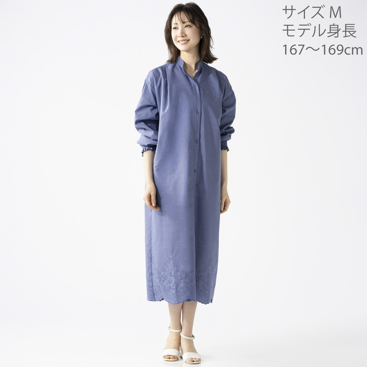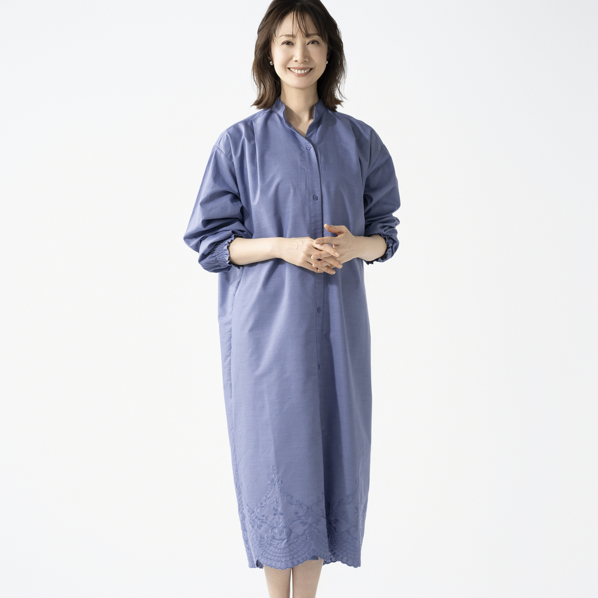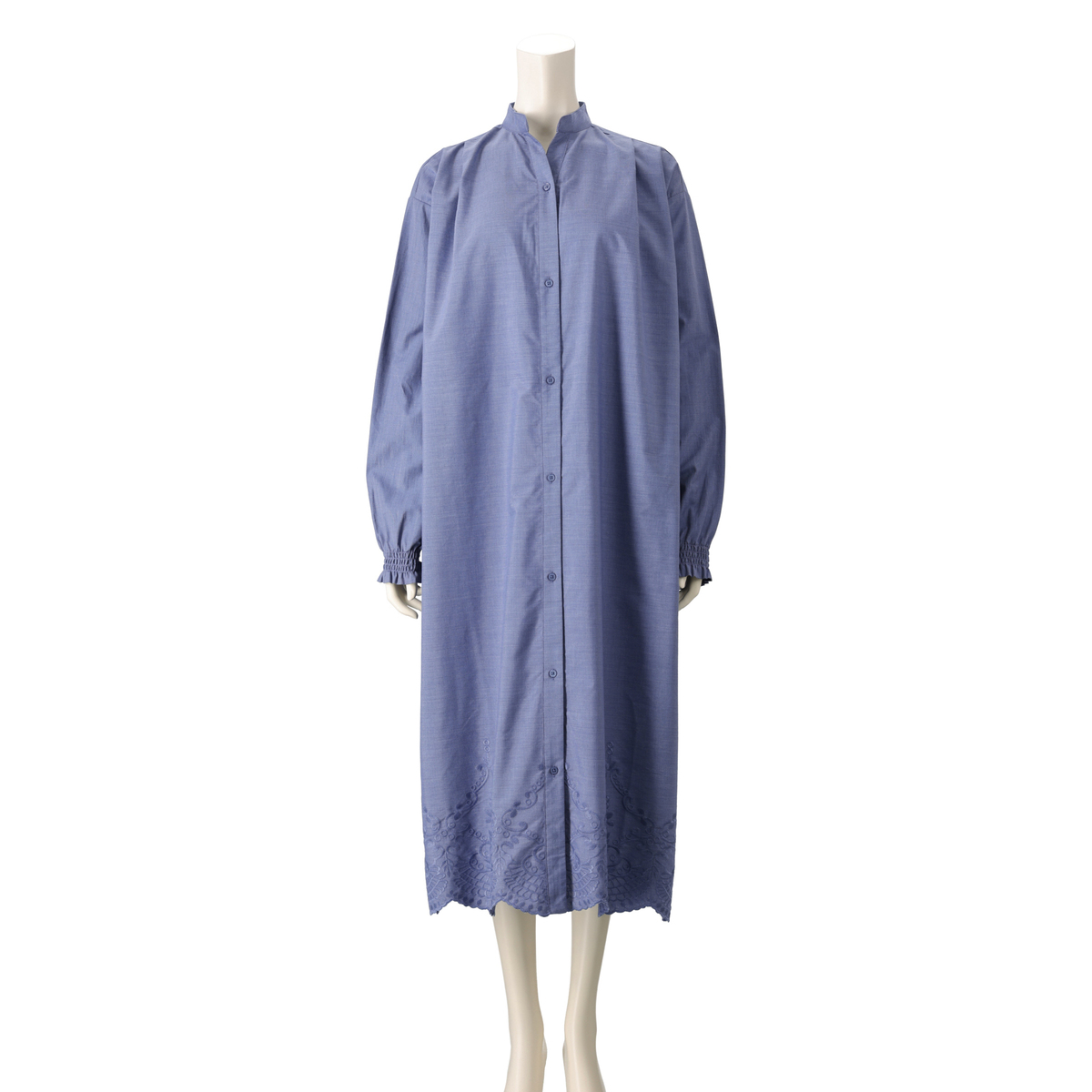 裾のスカラップ刺繍が印象的なシャツワンピース。バンドカラーで襟元はすっきりと仕上げ、袖口のシャーリングがほどよいアクセントになります。広めの刺繍ながら身生地と同色のため取り入れやすく、全体に穏やかな華やぎを添えてくれます