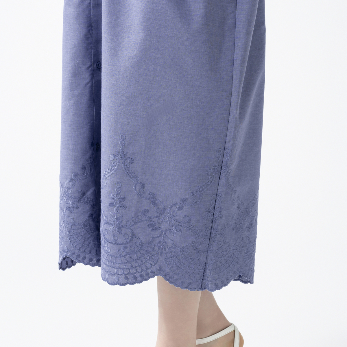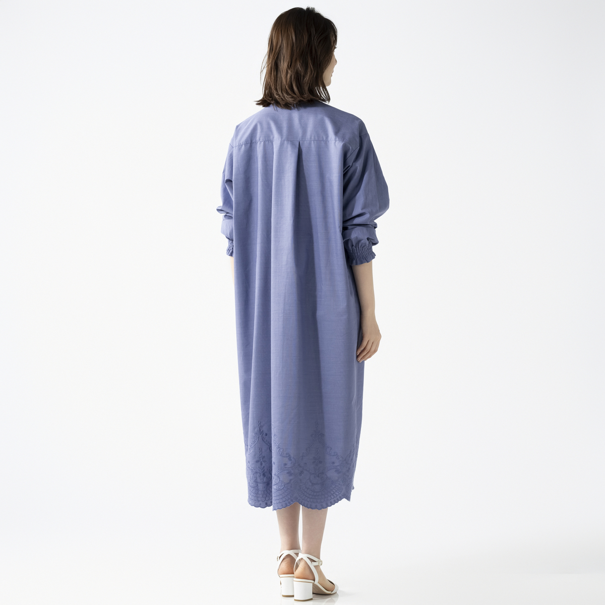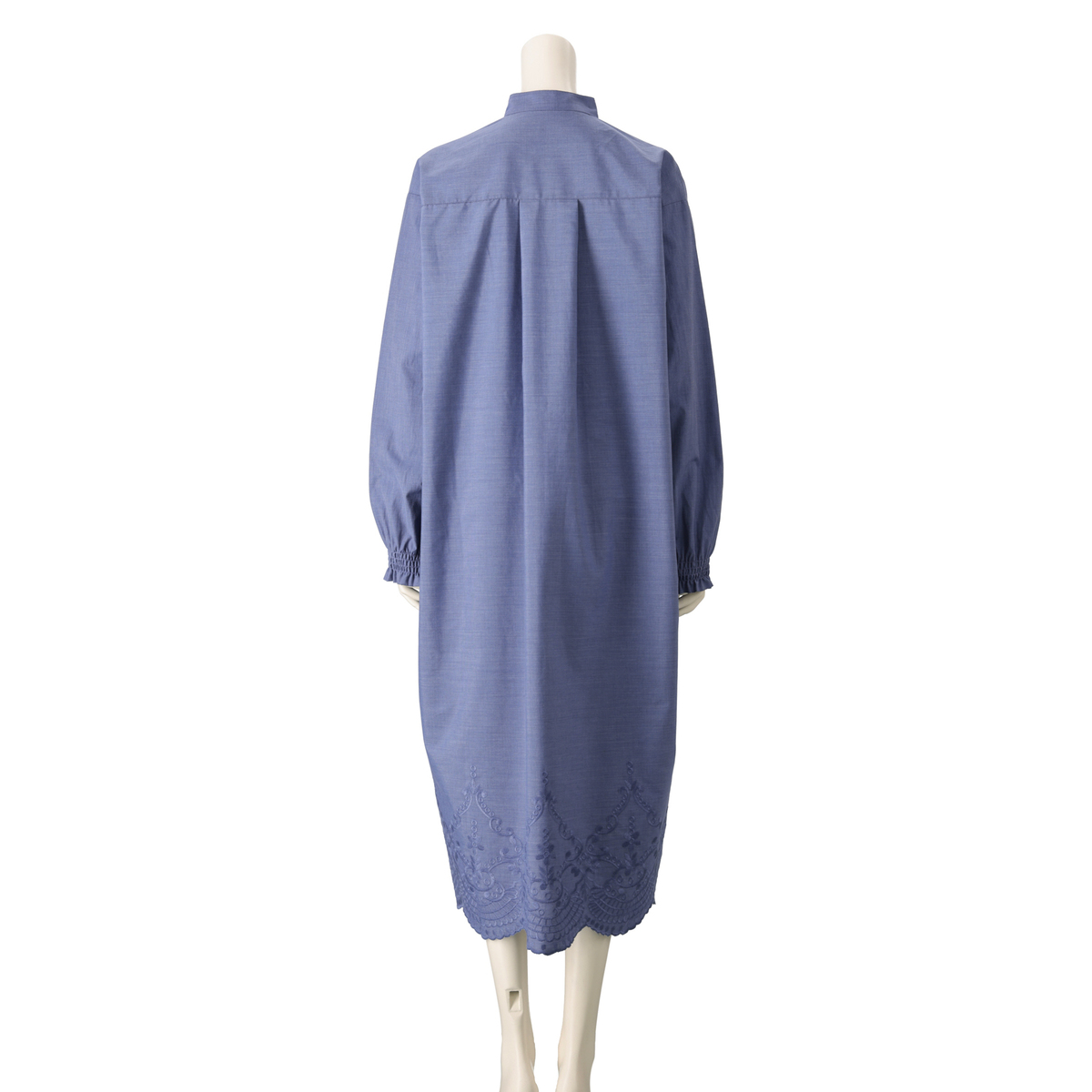 裾のスカラップ刺繍が印象的なシャツワンピース。バンドカラーで襟元はすっきりと仕上げ、袖口のシャーリングがほどよいアクセントになります。広めの刺繍ながら身生地と同色のため取り入れやすく、全体に穏やかな華やぎを添えてくれます