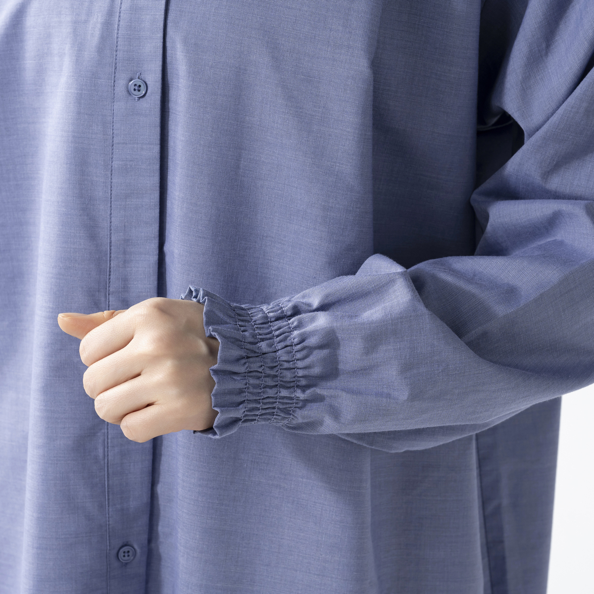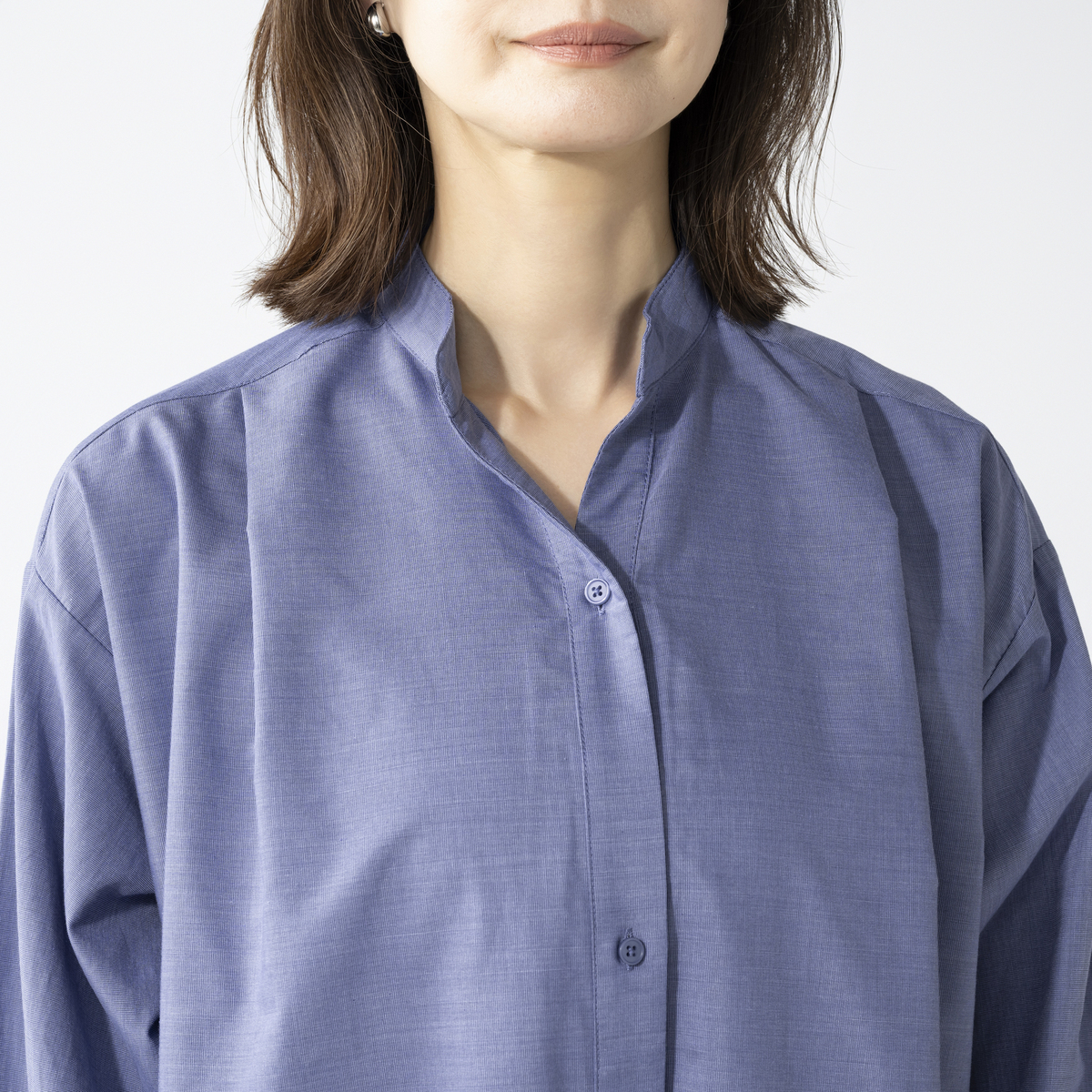 柔らかく落ち感のある綿混シャンブレー素材を使用。ベタ染めではないため、軽さのある表情が自然に引き立ちます。ご家庭で洗濯機洗い(ネット使用)ができ、デイリーに取り入れやすい素材感も魅力です