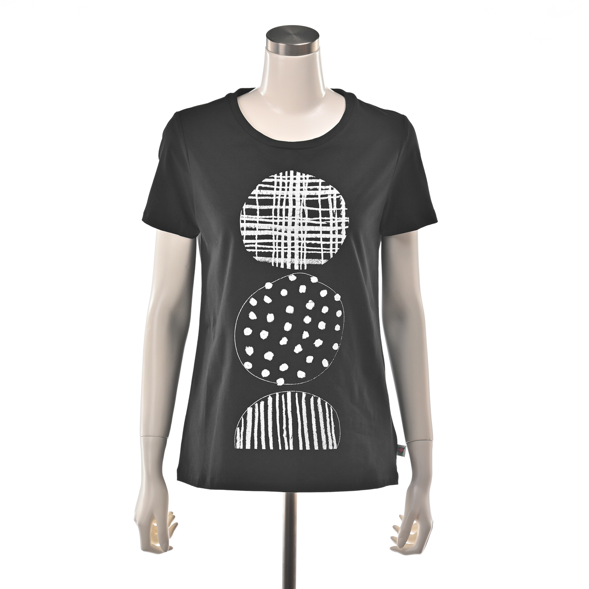 前面にインパクトのあるプリントを施したTシャツ。コットンベア天竺のオリジナル生地を使用し、非常に肌触りのよい仕上がりです。高級感のある見た目の印象と着用時の心地よさの両方を意識しています
