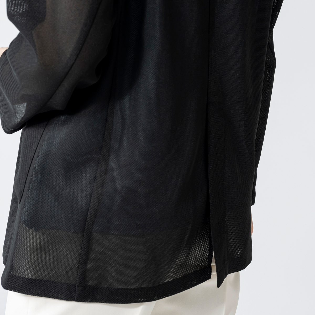 細かい網状になったメッシュ素材を使用。柔らかな素材感で涼しく着用していただけます。また、折りたたんだ際にしわになりにくい素材です