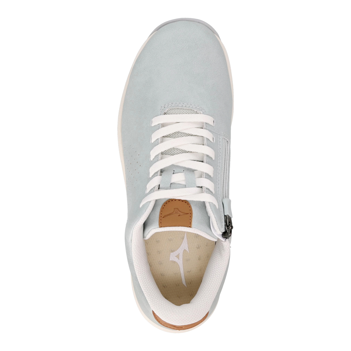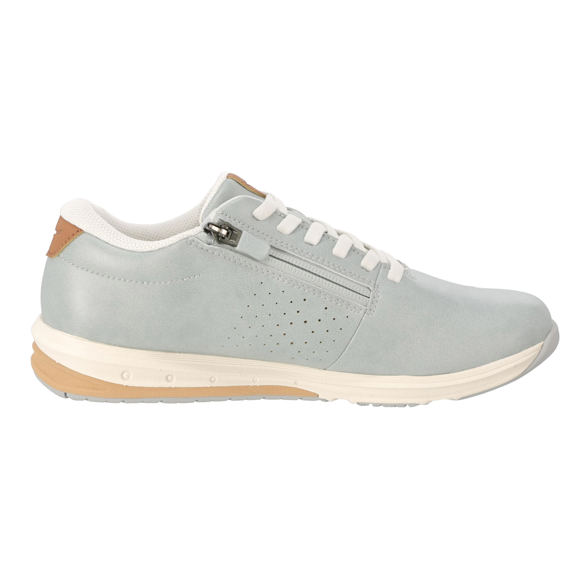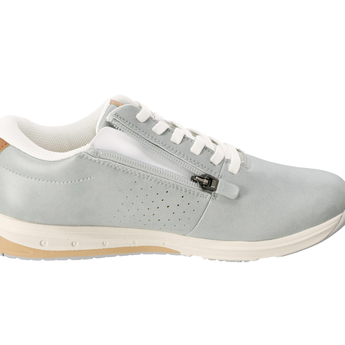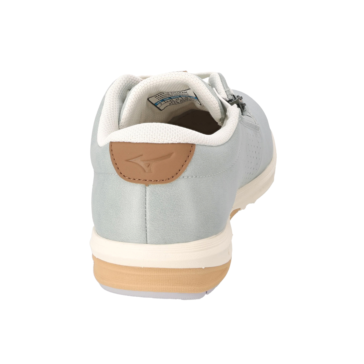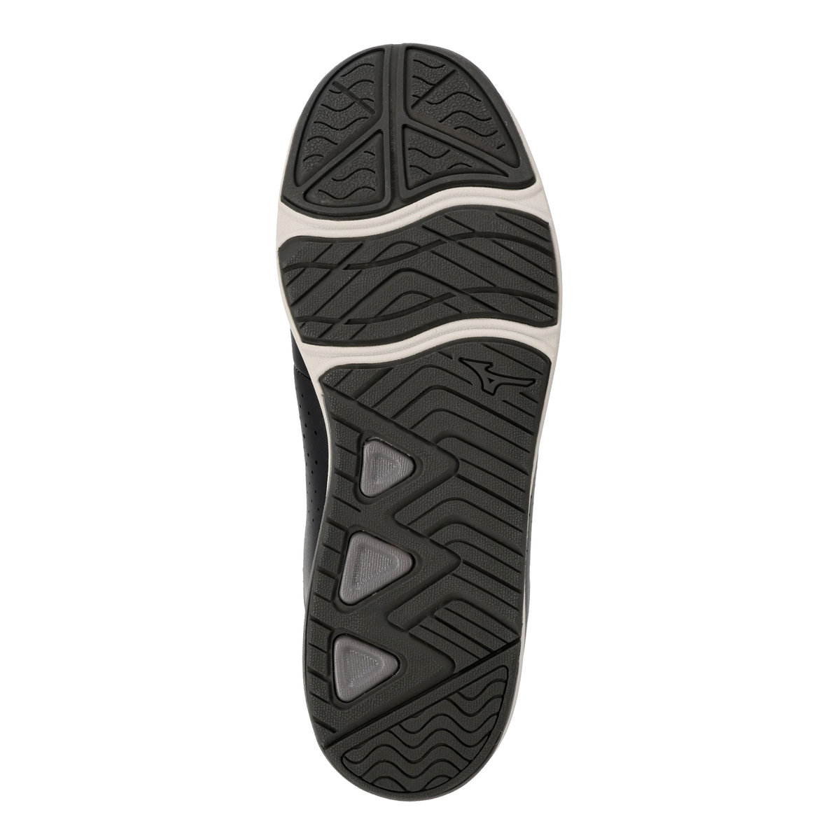 タン(舌)は人工皮革とメッシュ材を組合せることでソフトな足あたりに。内甲にはアッパーと同色のファスナーを配し、脱ぎ履きがラクにできる仕様です。アウトソール素材は濡れた路面でも滑りにくく、高いグリップ力を発揮するWgripを採用しています