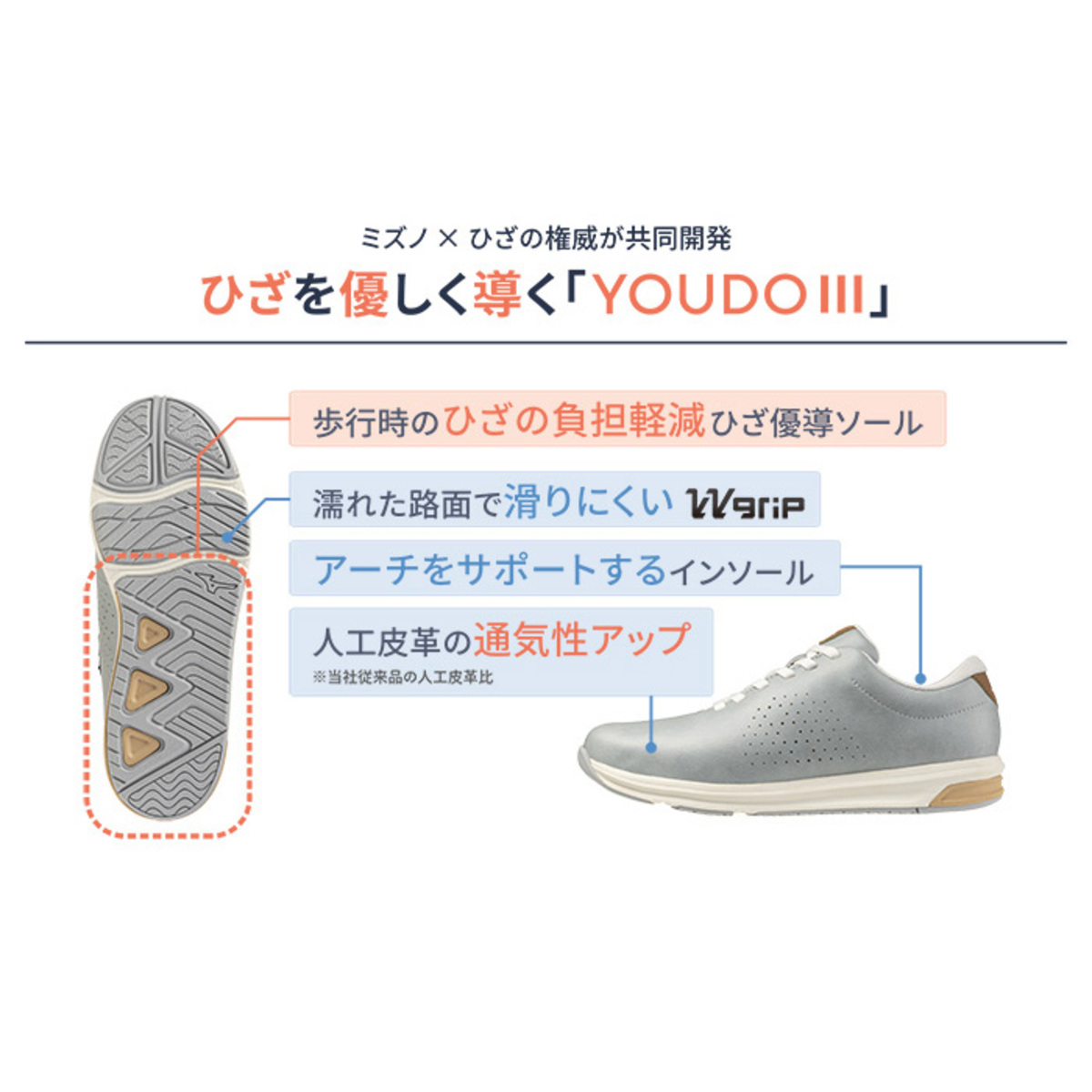 スポーツブランド「ミズノ」と、ひざ研究の権威である大森豪教授が共同開発した、歩行時のひざの負荷に悩む方のためのウォーキングシューズ「YOUDO」。柔らかい素材を組合せた特許取得*の"優導(ゆうどう)ソール"が内側重心に導くことで、ひざの内側にかかる負荷を軽減します
