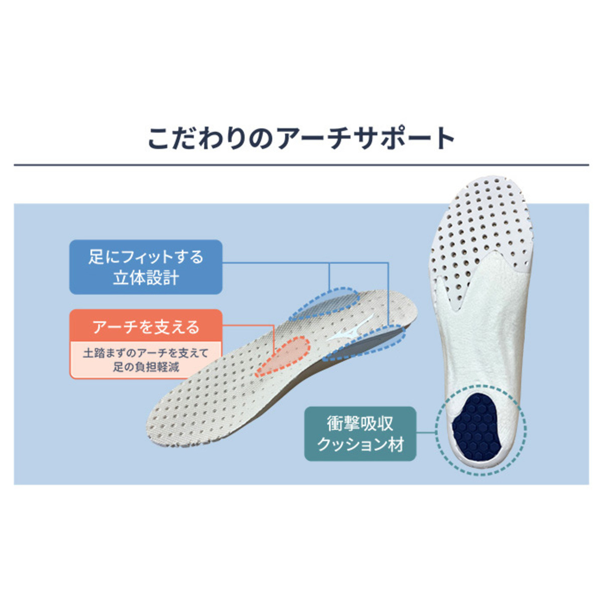 インソールは足裏の3つのアーチを包み込む設計で足にぴったりフィット。アーチを支えて、足への負担を分散、着地による衝撃を吸収し、重心をスムーズに移動させます。また、かかとのライニング部を表まで広げることで履いた際により柔らかさを感じる仕様です