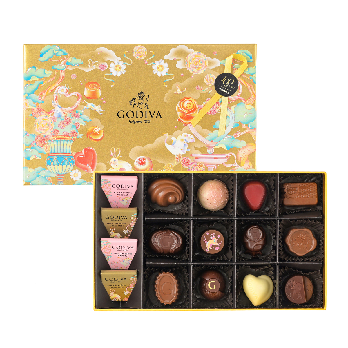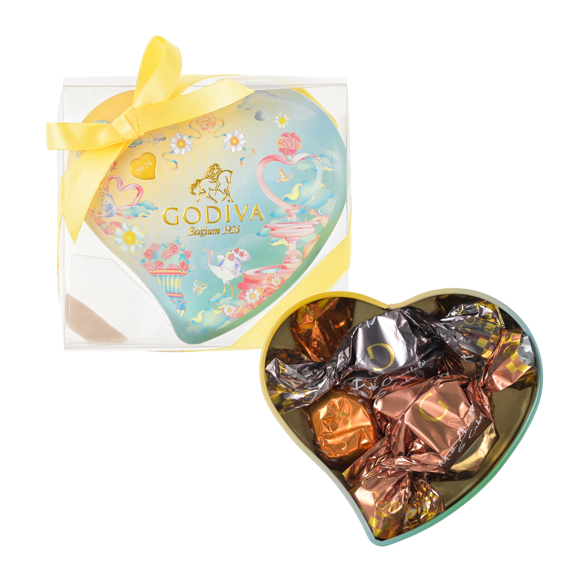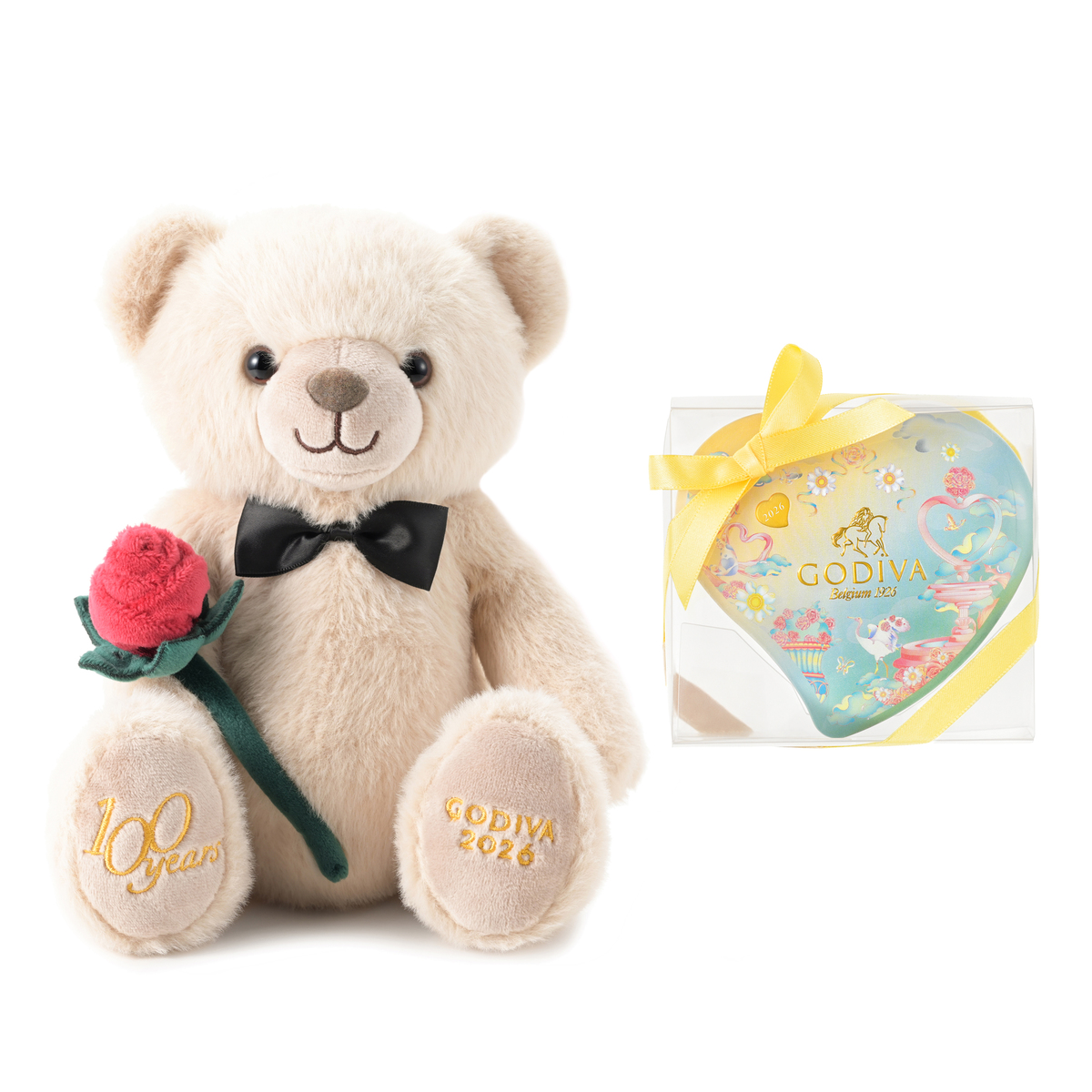 花々や小鳥たちが描かれた幻想的なデザインのハート形の缶に、ミルク ブロンドソルテッドキャラメルなどを詰め合わせたアソートメント。2026ホワイトデーシーズン限定のゴディバベアをセットにしました*