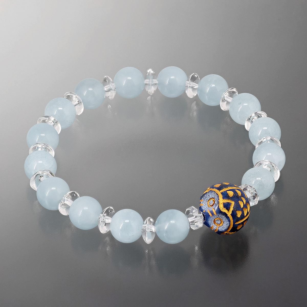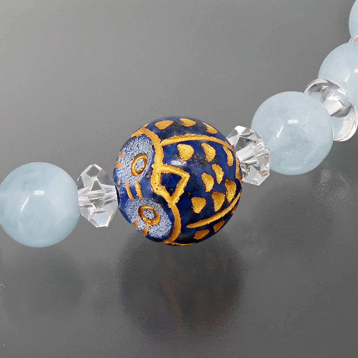パワーストーンとしても人気の高いラピスラズリに、ラッキーモチーフとして親しまれているふくろうを彫刻。ベース部分にもアクアマリンをあしらったブレスレットです