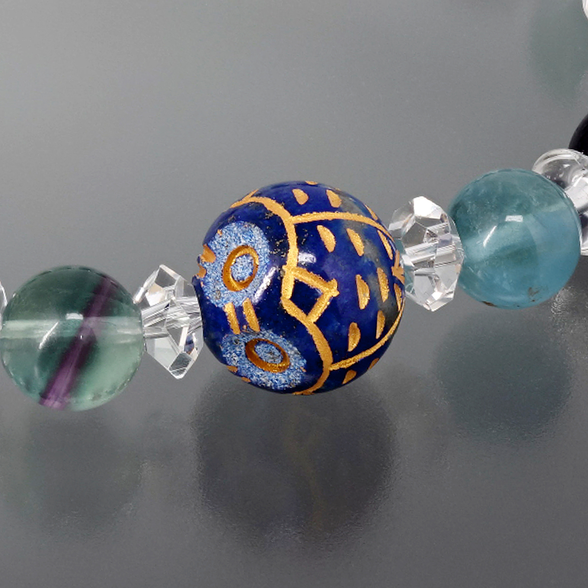 パワーストーンとしても人気のラピスラズリに、ラッキーモチーフとして親しまれているふくろうを彫刻。フローライトのブレスレットにセットしました