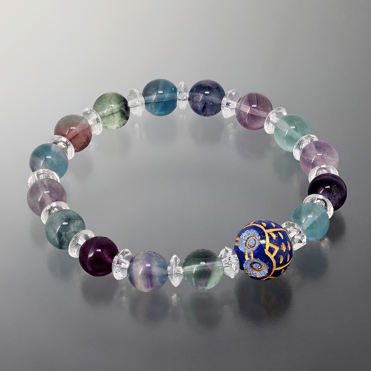 多様な色相のあるストーン、フローライトでデザインしました。フラットカットの水晶でポイントを付けた、美しいサークルブレスです