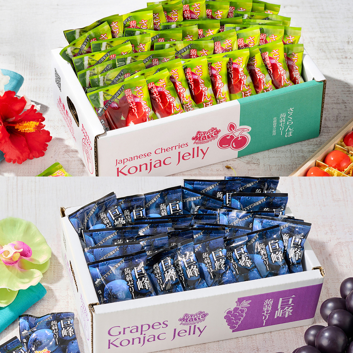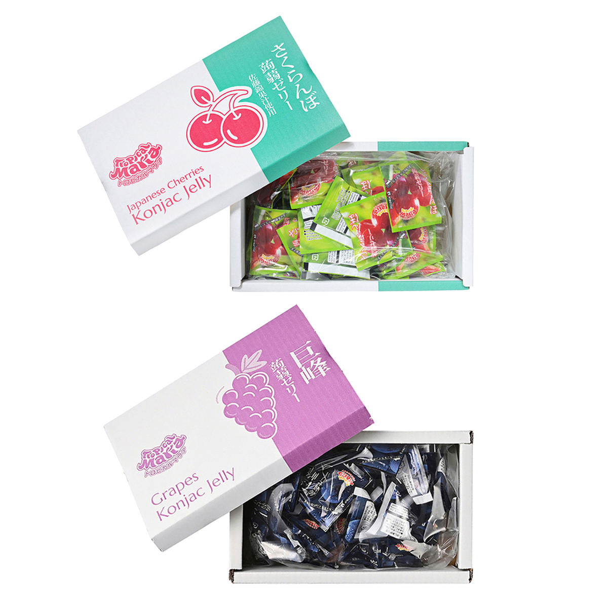 [アレルギー物質特定原材料8品目] なし [賞味期限] 出荷時点で賞味期限まで90日以上ある商品をお届けします [保存方法] 開封前:直射日光や高温多湿を避けて保存してください 開封後:開封後はお早めにお召しあがりください [お召し上がり方] ゼリーを決して吸い込まずに、底をつまんで押し上げながら、良くかんで少しずつお召しあがりください [注意事項] ※熱や光の影響により変色することがありますが、品質には問題ありません ※のどの詰まりには、十分ご注意ください ※小さなお子様や高齢の方は、のどに詰まりやすいので、十分ご注意してお召しあがりください [原料原産地] 砂糖混合ぶどう糖果糖液糖(国内製造) [原産国] 日本 [商品内容]※以下より2点お選びください ・さくらんぼ(佐藤錦) ・巨峰 ・おかやま夢白桃 ・シャインマスカット 各640g(16g×40個) [原材料] 巨峰: 砂糖混合ぶどう糖果糖液糖(国内製造)、水溶性食物繊維、巨峰果汁、こんにゃく粉/酸味料、ゲル化剤(増粘多糖類)、香料、甘味料(アセスルファムK) さくらんぼ(佐藤錦): 砂糖混合ぶどう糖果糖液糖(国内製造)、水溶性食物繊維、さくらんぼピューレ、さくらんぼ濃縮果汁、こんにゃく粉/ゲル化剤(増粘多糖類)、酸味料、香料、甘味料(アセスルファムK、スクラロース) おかやま夢白桃: 砂糖混合ぶどう糖果糖液糖(国内製造)、ももピューレ、水溶性食物繊維、こんにゃく粉/酸味料、ゲル化剤(増粘多糖類)、香料、甘味料(アセスルファムK) シャインマスカット: 砂糖混合ぶどう糖果糖液糖(国内製造)、水溶性食物繊維、シャインマスカットピューレ、こんにゃく粉/ゲル化剤(増粘多糖類)、酸味料、香料、甘味料(アセスルファムK、スクラロース)