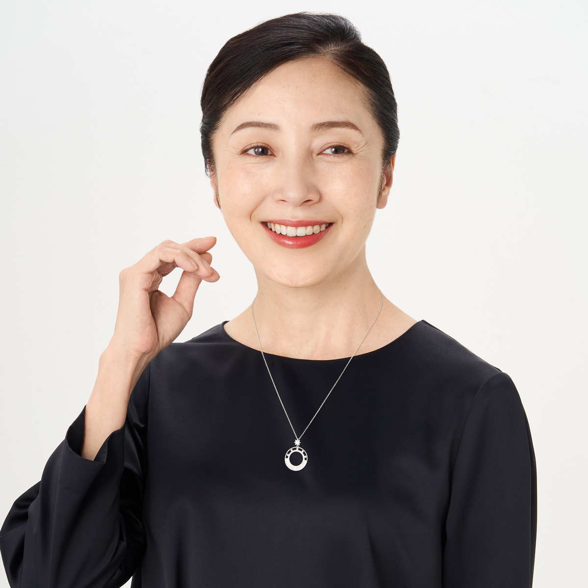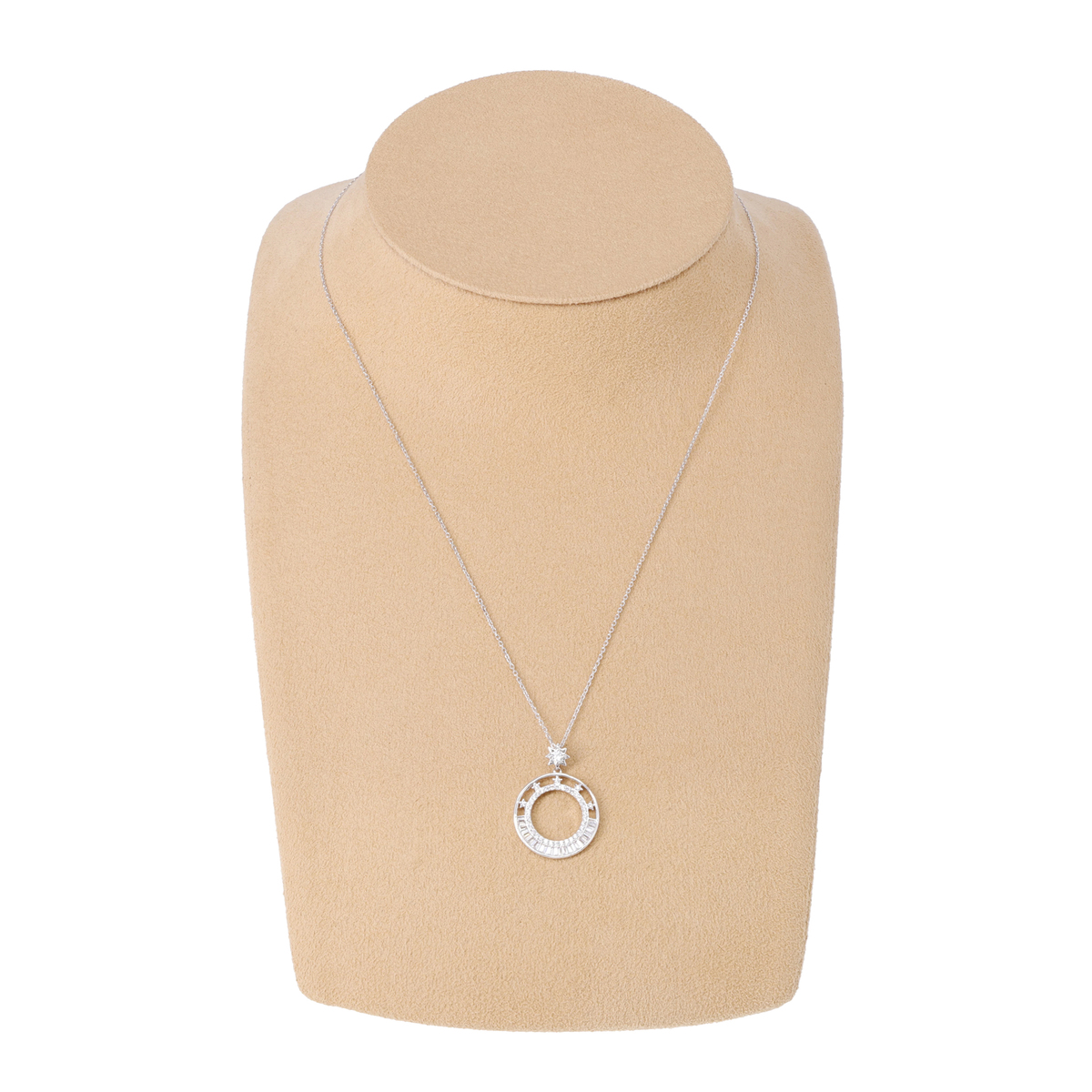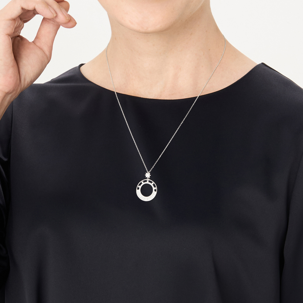 静かに浮かぶ一等星のきらめきを思わせるペンダント。円形のモチーフで星空の広がりを表現し、大粒のダイヤモニークが深みのある輝きを添えます。物語を感じるような上品なきらめきが、装いに華やかな印象をもたらします