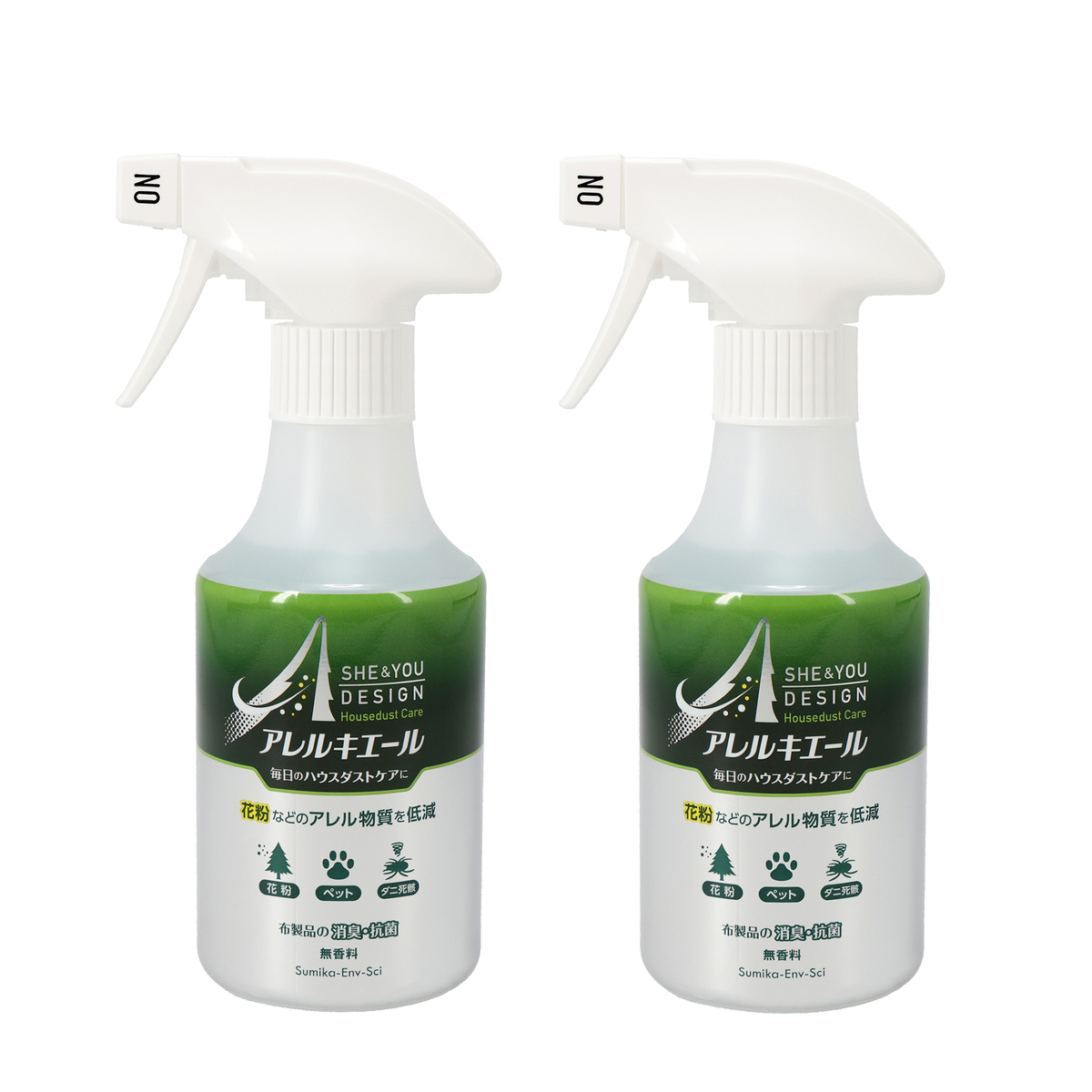 [用途] アレル物質低減化剤(布製品用) [使用方法] 1.先端部分をONに回してください。 2.対象物から20-30cm離して、表面が全体的に湿り気を帯びる程度にスプレーしてください 3.使用後は先端部分をOFFにし、立てて保管してください 4.スプレー後は充分に自然乾燥させてください [注意事項] ※皮・和装品へは使用不可 ※直射日光のあたる場所や温度差の激しい場所(車内、電化製品の上など)での保管は避ける ※子供の手の届く場所での保管は避ける ※皮・和装品へは使用不可。毛、絹・レーヨン・アセテート・キュプラなど水に弱い繊維、水洗い不可の表示があるもの、防水・撥水加工など特殊加工されたものは、シミになったり、風合いを損ねる恐れがあるので、あらかじめ目立たない部分で試す ※20cmより近づけたり、一度にスプレーしすぎたりしない。シミやべたつきの原因になることがある ※汚れのあるものは、汚れが原因の輪ジミを起こすことがある ※汚れが原因のニオイは、使用後、汚れから再びニオイが発生することがある ※トリガーを手早く最後まで引きスプレーする ※床や家具など布製品以外についた場合はすぐにふき取る ※食品、食器類、美術品、おもちゃ、電化製品、精密機器、ペット等にかからないようにする ※狭い空間で使用するときは、換気して使用する ※使用方法を守り、用途以外に使用しない ※火に向けてスプレーしない ※人やペットに向けてスプレーしない ※目に入った場合は、水で十分洗い流す ※飲みこんだ場合、吐かせずに水を飲むなど処置をする ※気分が悪くなったり身体に異常を感じた場合は使用を中止し、本品を持参して医師に相談する 【日本製】 [セット内容] 300ml×2本 [成分] 消臭成分、抗菌成分、アレル物質低減化成分