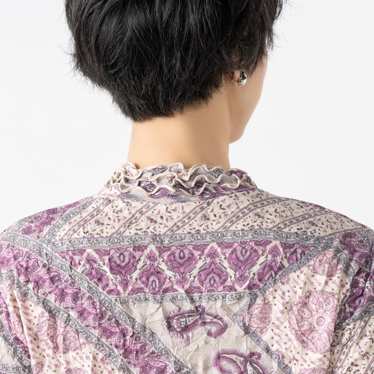 ほどよく首にかかる立ち衿とフリル使いが特徴。首元に沿ってやわらかく立ち上がり、顔まわりをすっきりと見せます。メロー始末と控えめなギャザーで首元を包み込み、さりげない個性を添えます