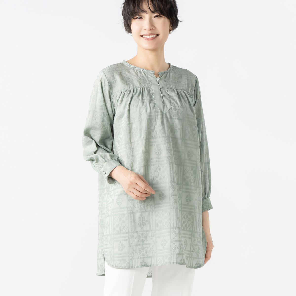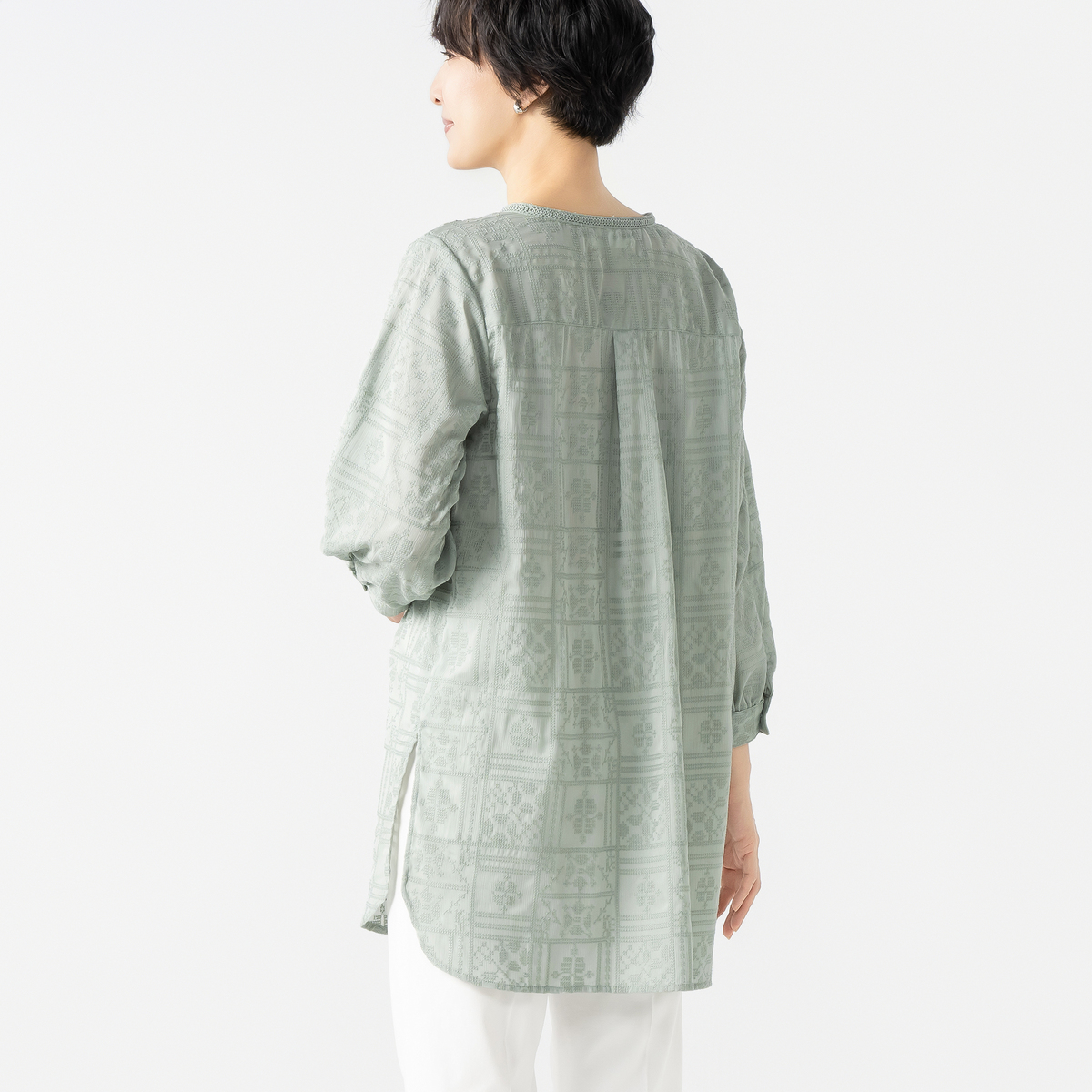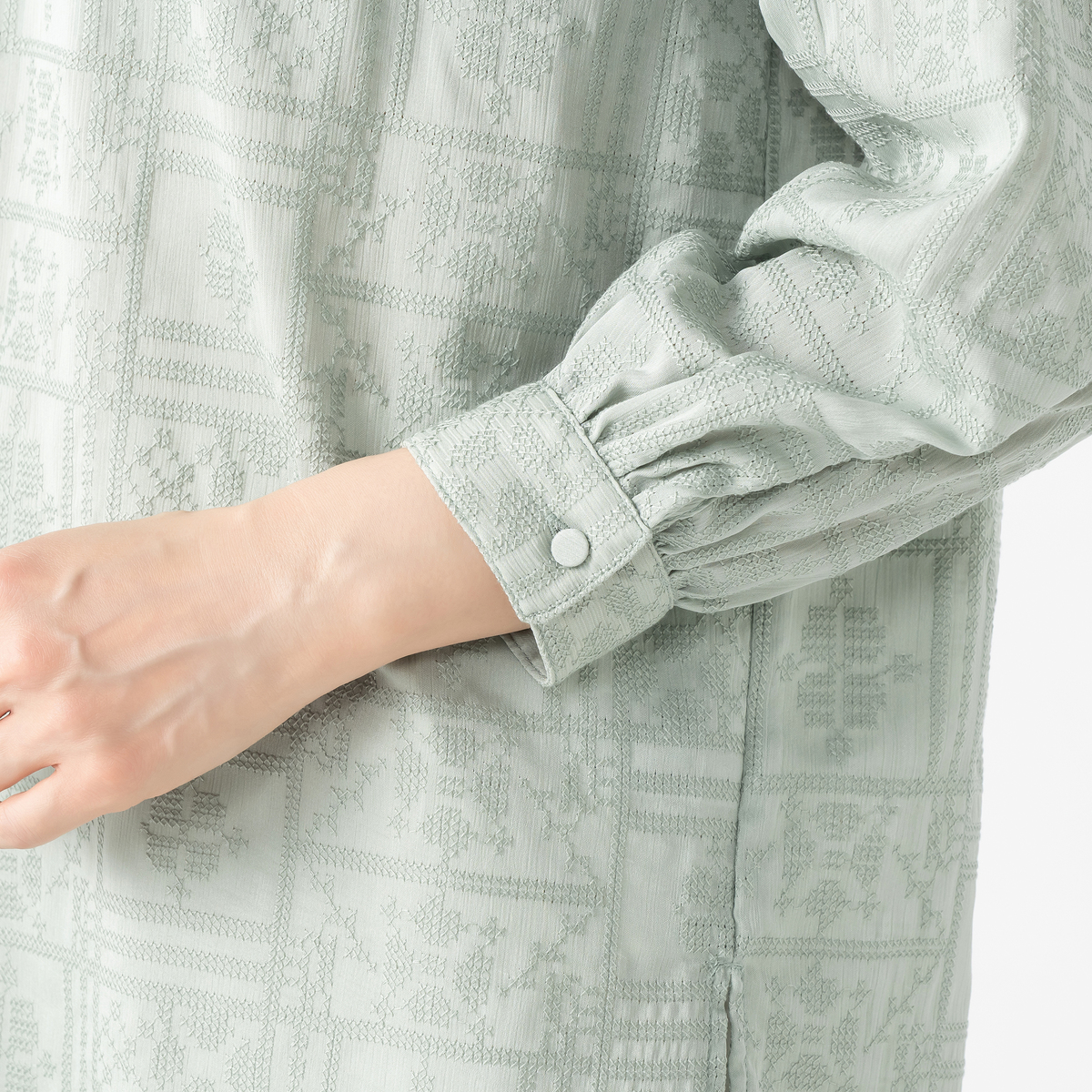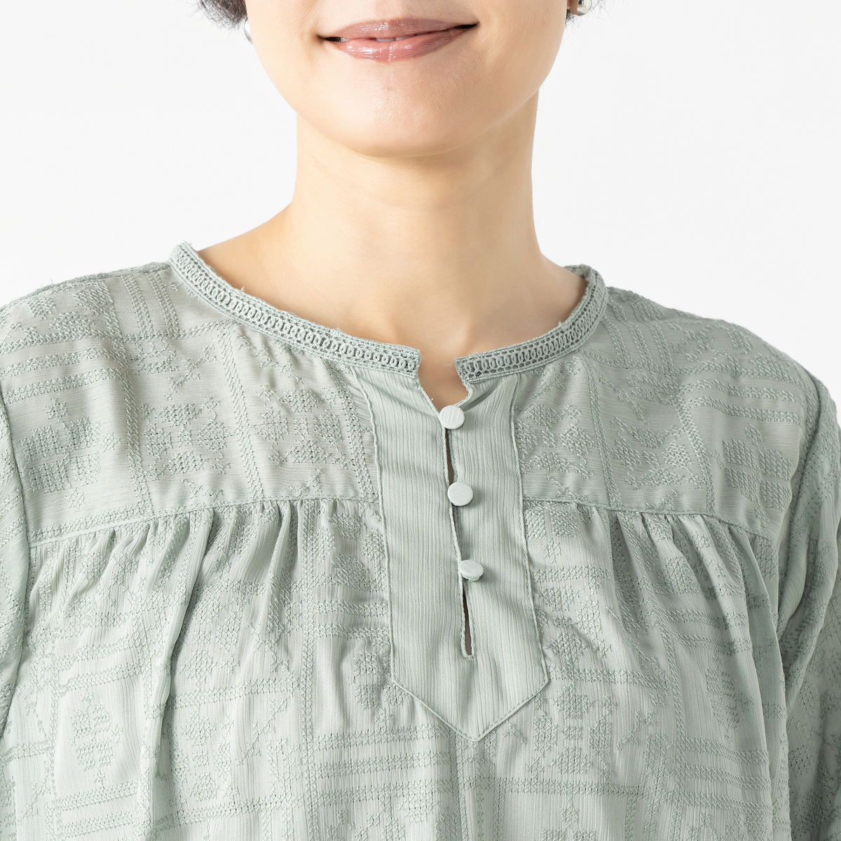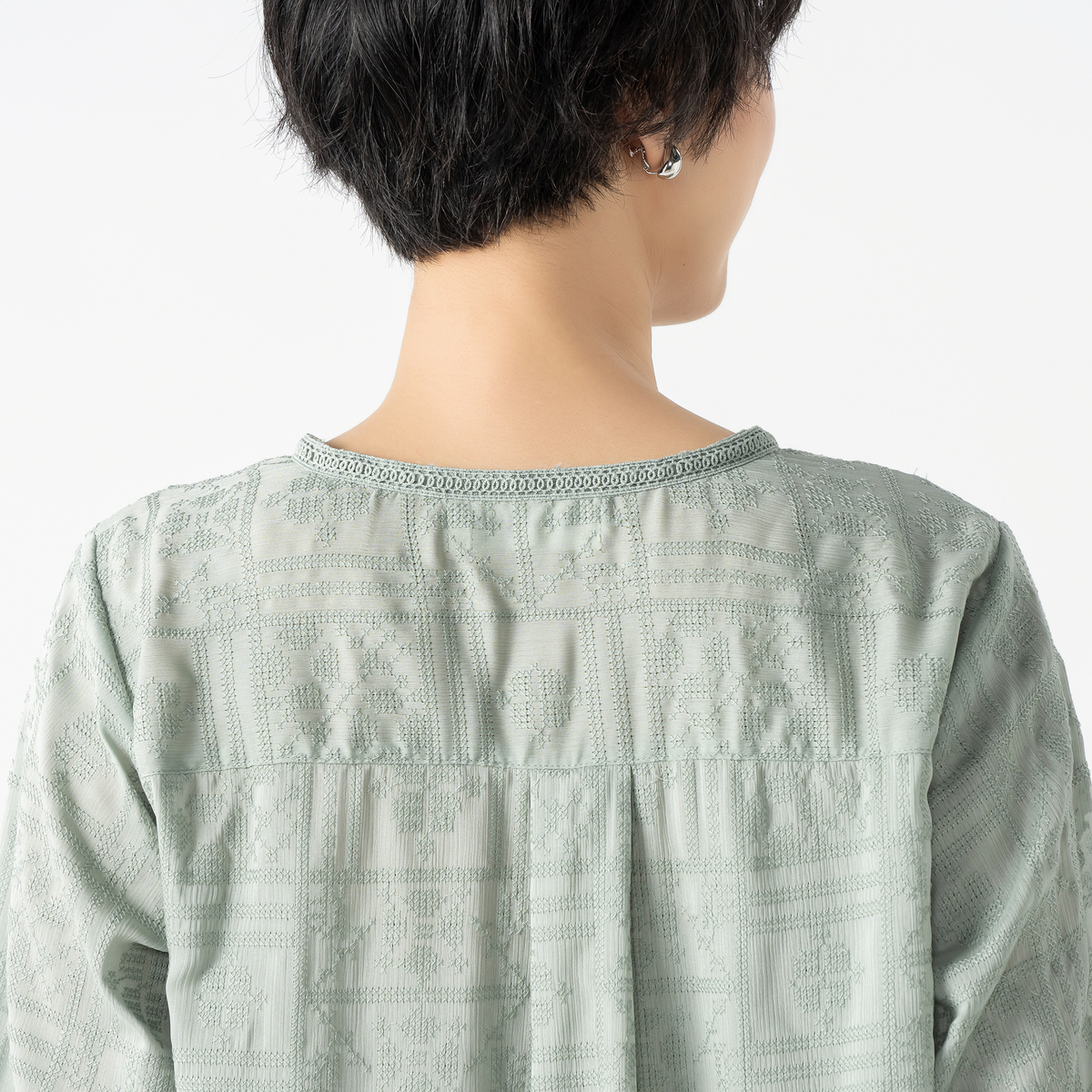 楊柳素材の表情が特徴のチュニック。縦ジワのある生地が肌に触れる面積を抑え、さらりとした着心地です。全体にクロスステッチ刺繍を施し、生地の凹凸に刺繍が浮かび上がることで、華美になりすぎず落ち着いた華やかさを演出します