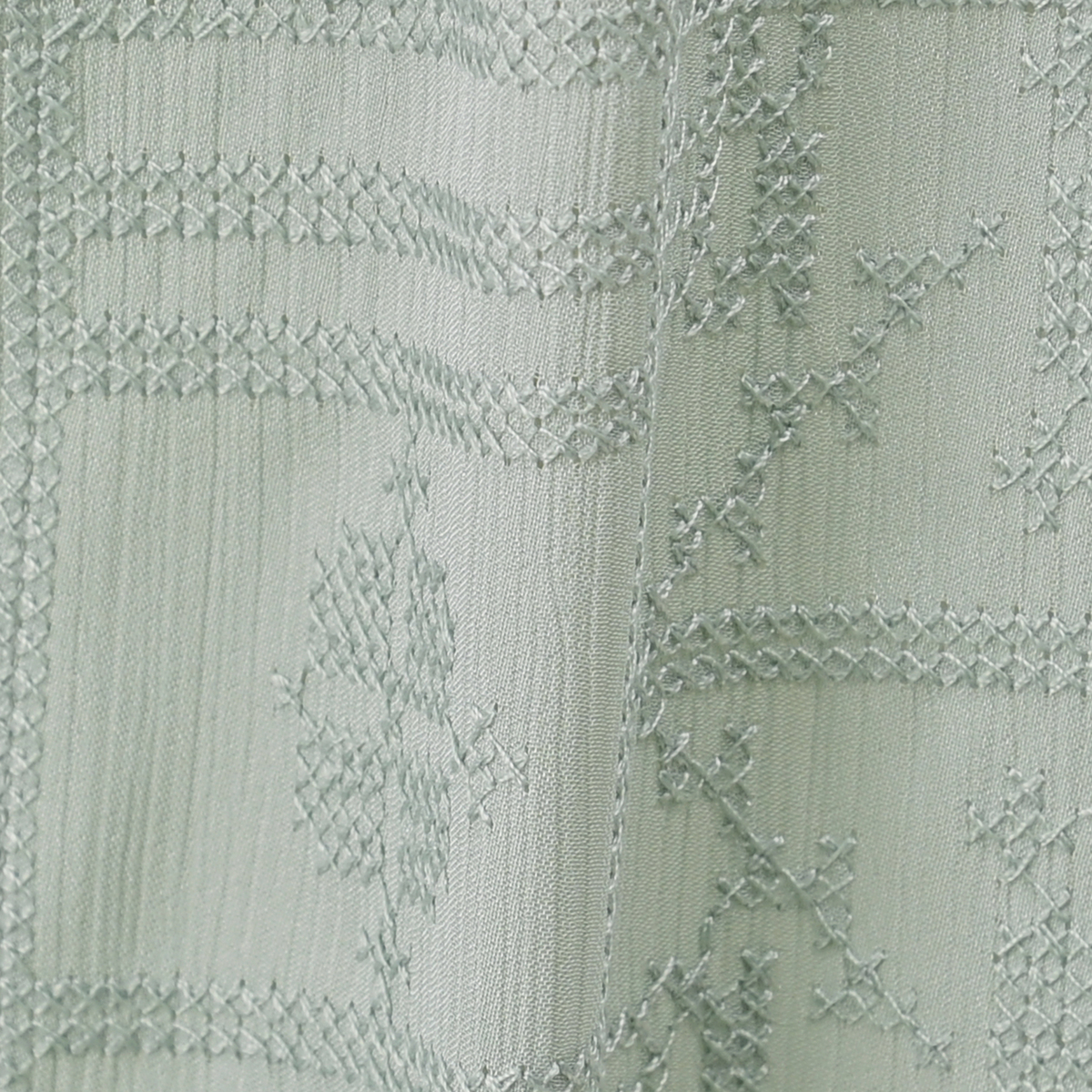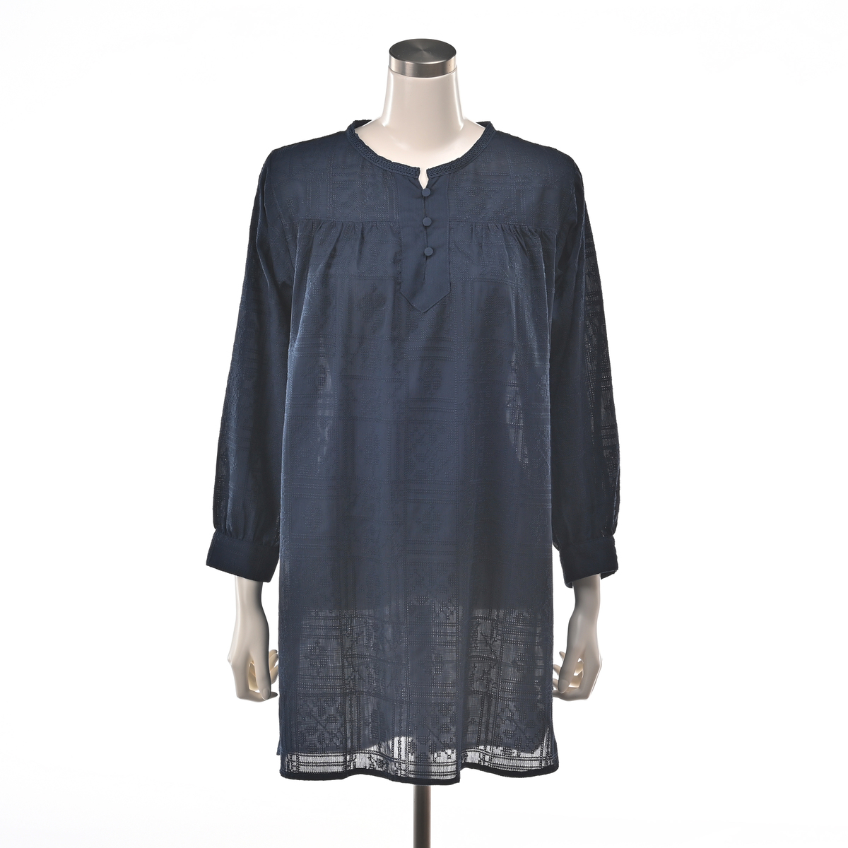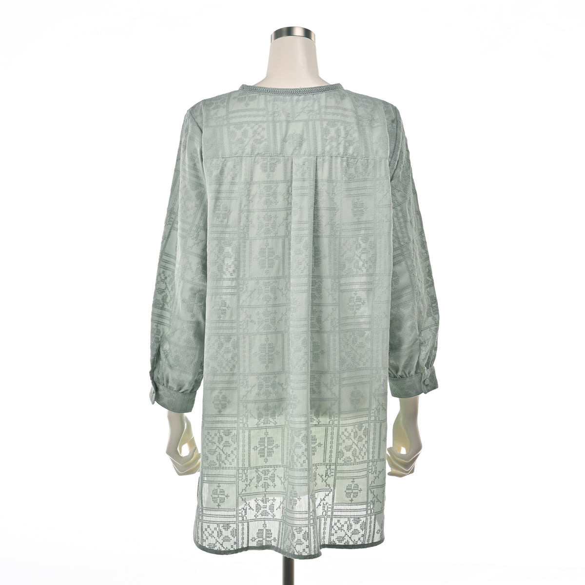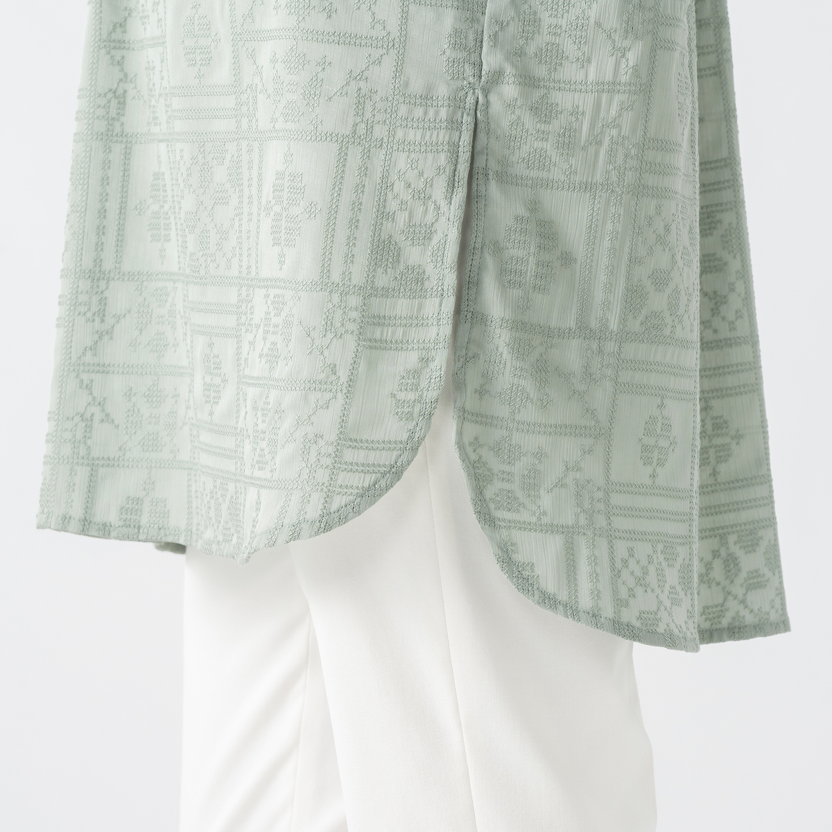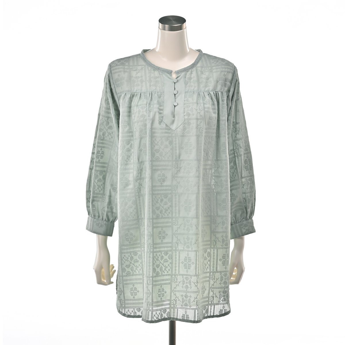 楊柳素材の表情が特徴のチュニック。縦ジワのある生地が肌に触れる面積を抑え、さらりとした着心地です。全体にクロスステッチ刺繍を施し、生地の凹凸に刺繍が浮かび上がることで、華美になりすぎず落ち着いた華やかさを演出します