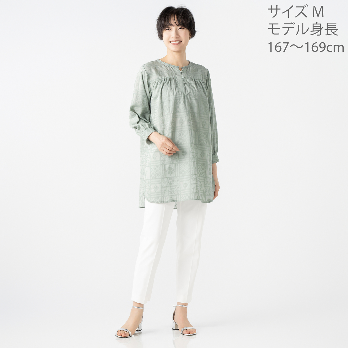 ゆったりとした身幅とサイドスリットが特徴。動きやすさを考えた設計で、ヒップラインを自然に覆う丈感です。すっきりとしたパンツと組合せやすく、年齢を問わず取り入れやすい形です