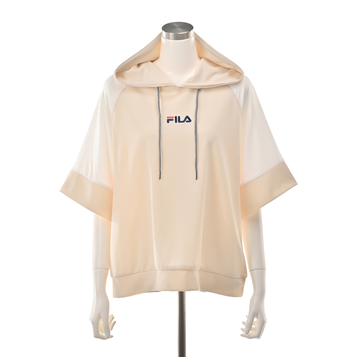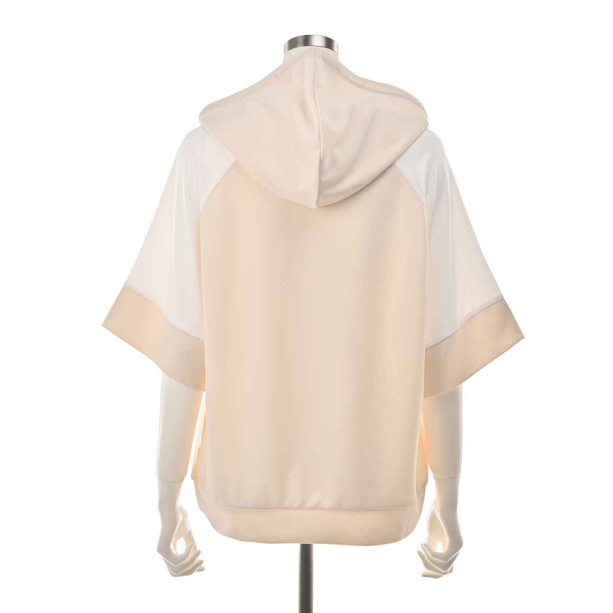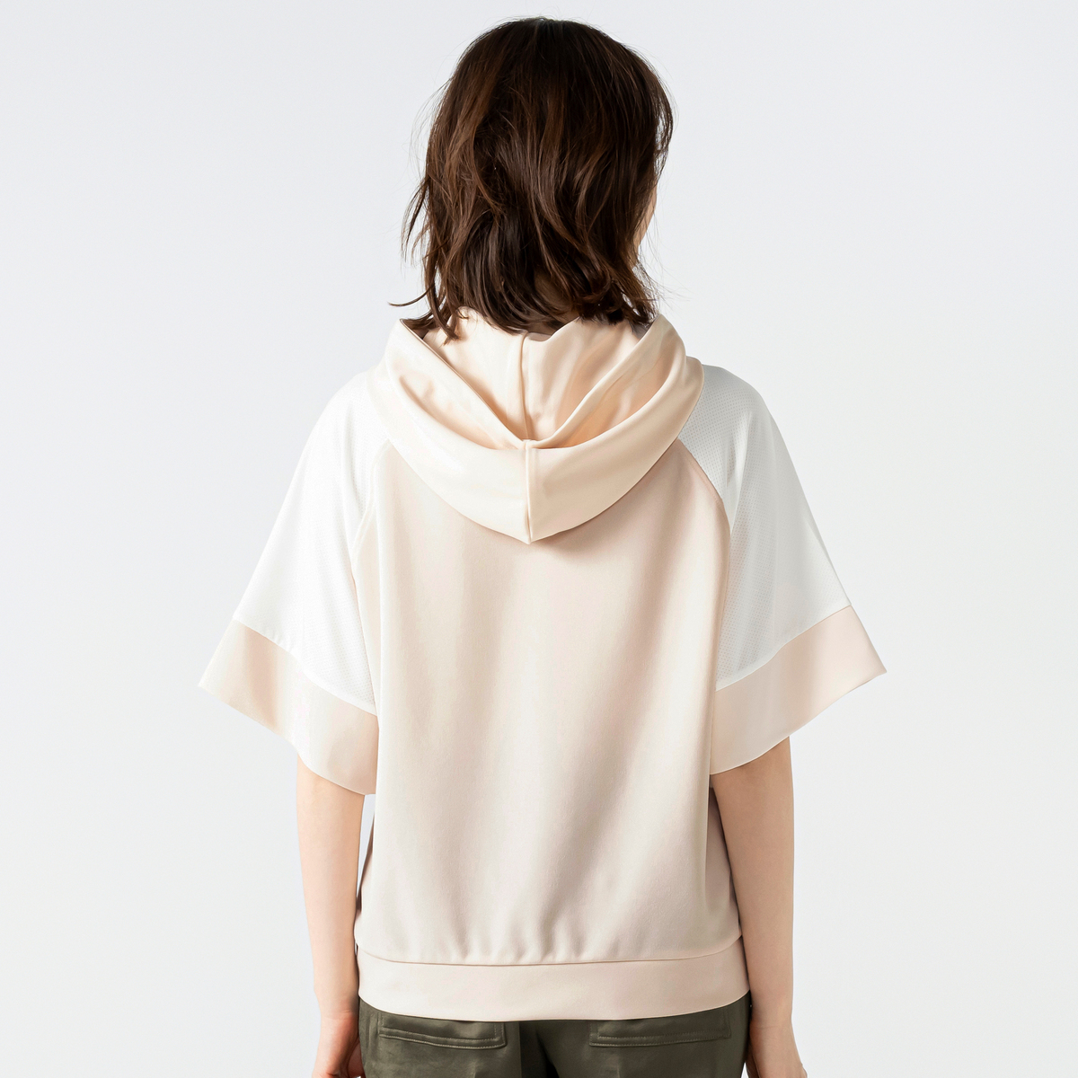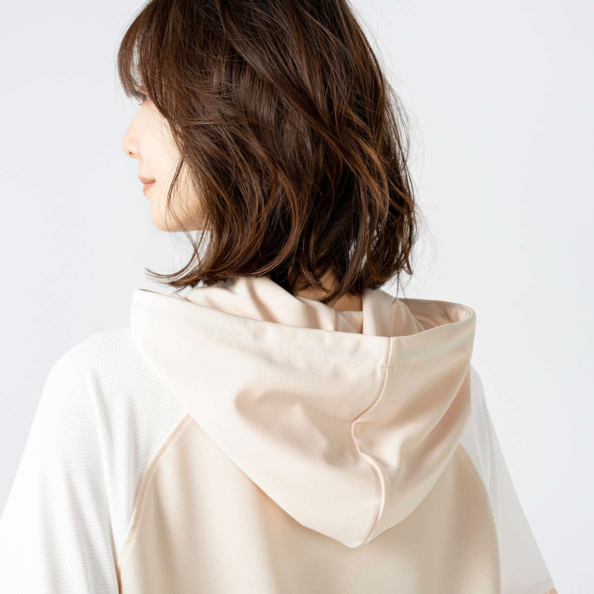 UVカット効果とストレッチ性がある着やすいメッシュフーディ。ゆったりとしたシルエットと、二の腕をさりげなくカバーする袖丈で、体のラインを拾いにくいのも嬉しいポイントです